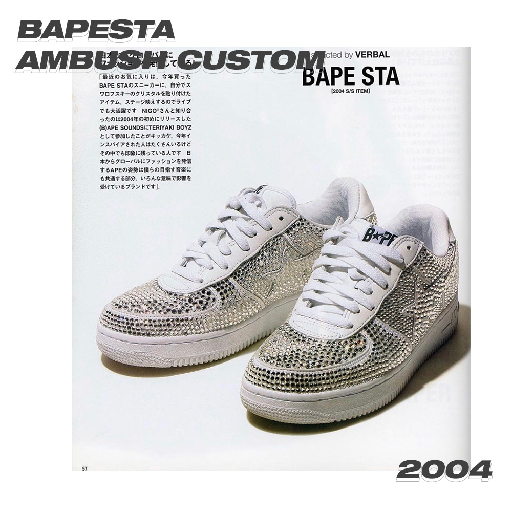 AMBUSH® 当时还不像现在,还是由 Verbal 作为品牌主要的活跃人物。同属 Teriyaki Boyz 成员的他固然和 NIGO® 以及 BAPE® 都拥有绝对密切的关系,这双满布颗粒水钻的 BAPESTA 便是当时特别定制的款式。