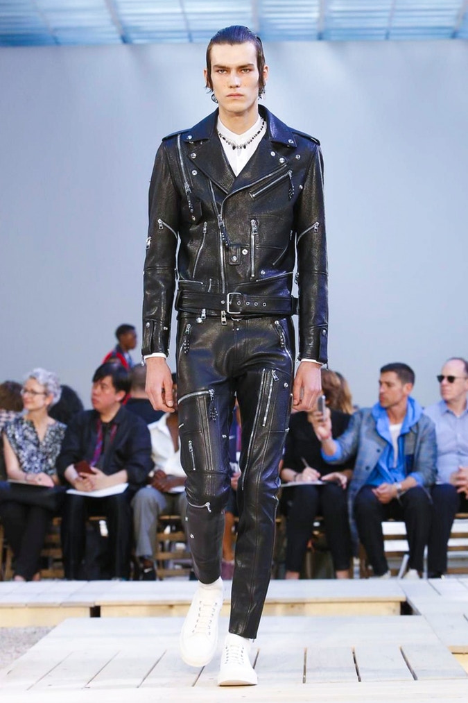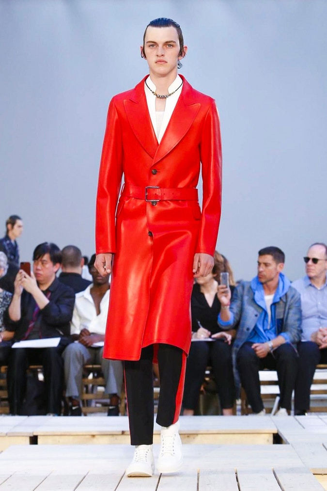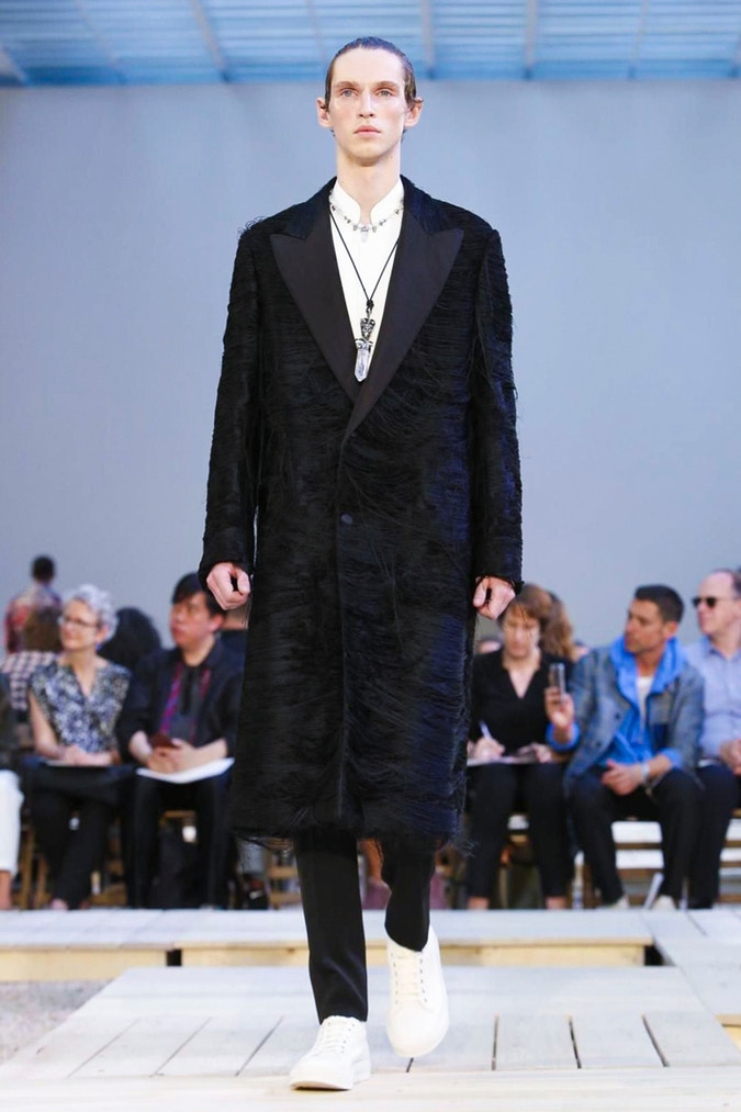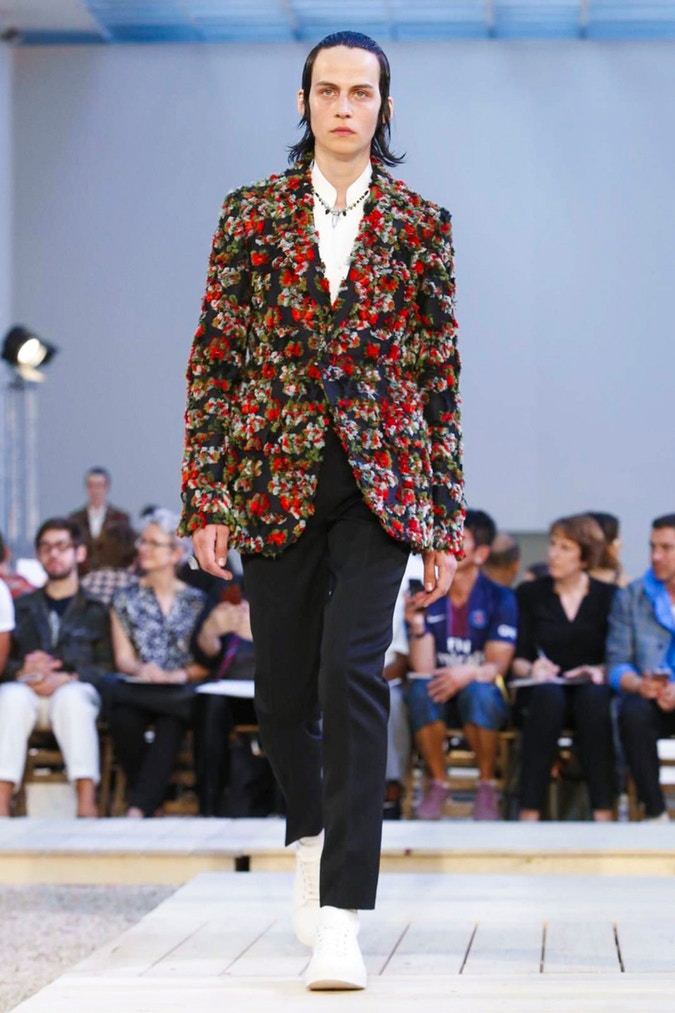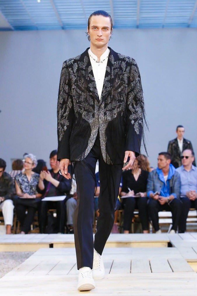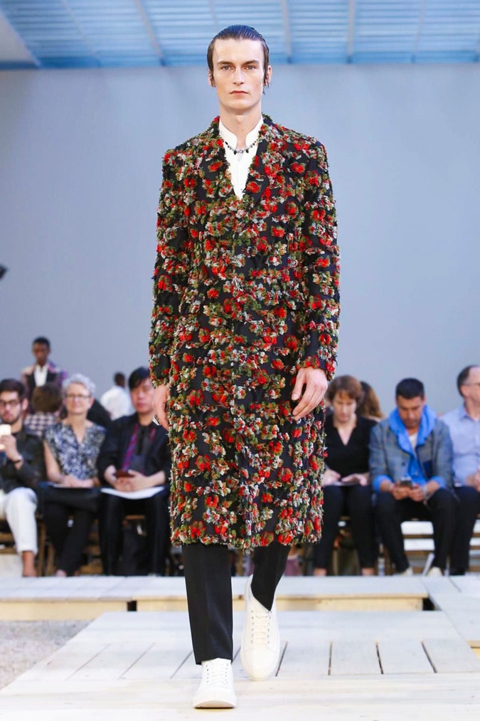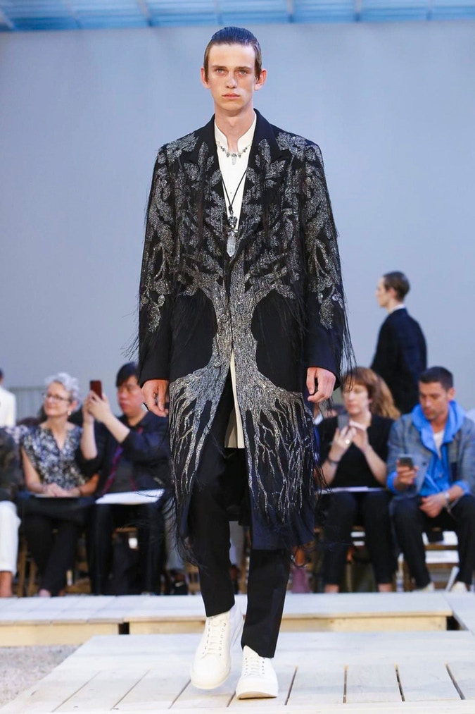 Alexander McQueen 在今年五月宣布将重返巴黎男装时装周的 T 台,时隔一个月,这家英国时装屋如约而至,发布了 2018 男装春夏系列新品。在这一季 Alexander McQueen 的新品中,花卉、树枝以及在衣服上出现的纱线元素成为主打,设计总监 Sarah Burton 希望以此方式彰显品牌一贯崇尚的暗黑时尚美学。除此之外,皮制风衣、机车夹克、皮裤等单品也是大家关注的重点。