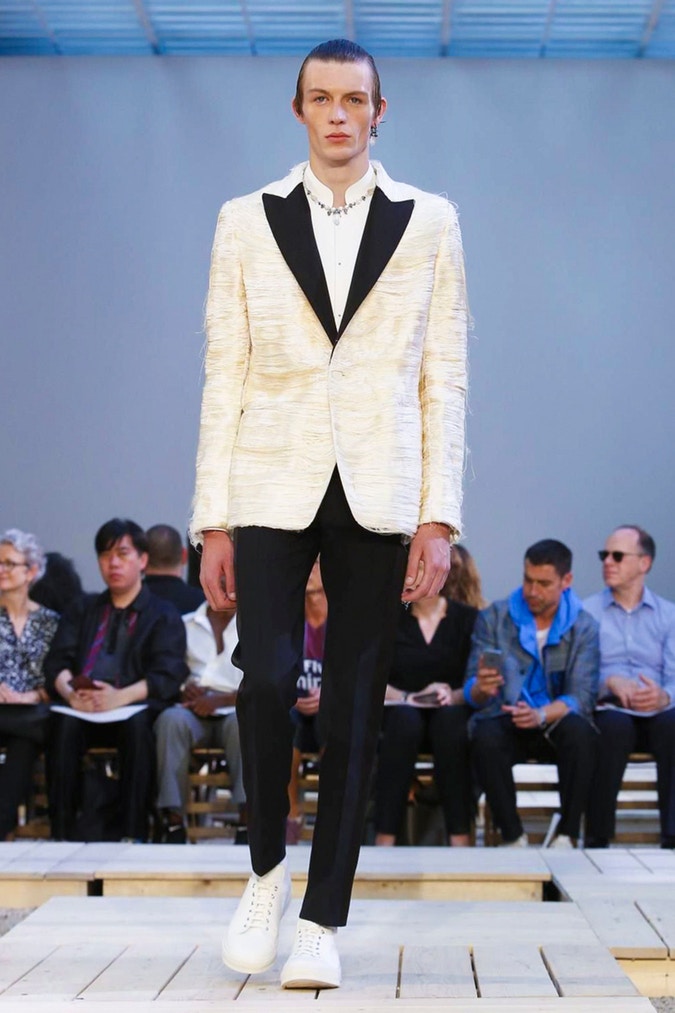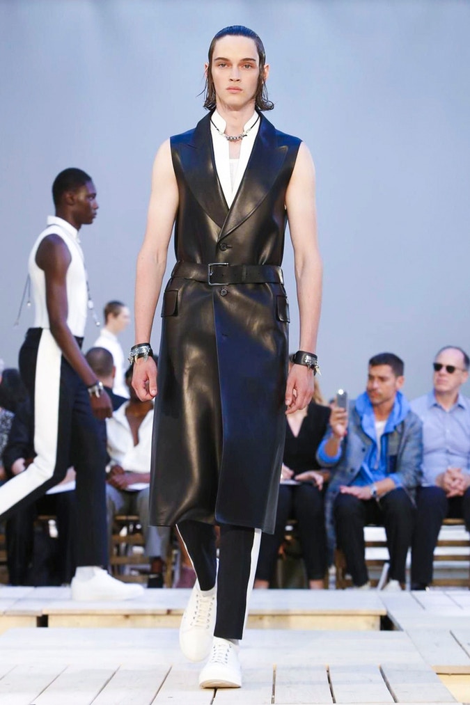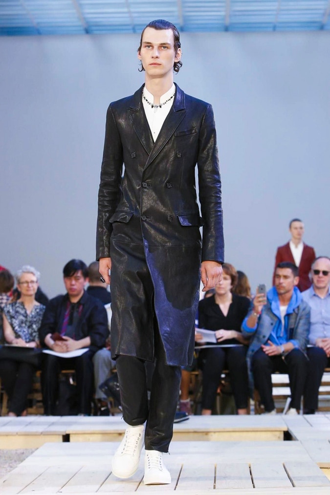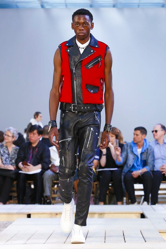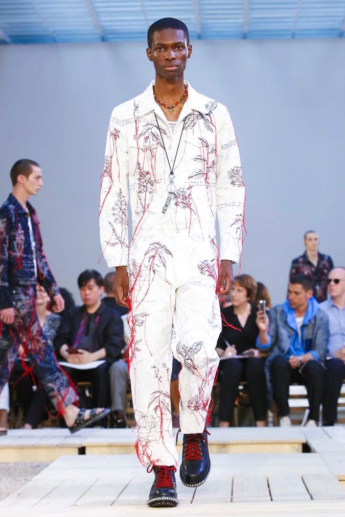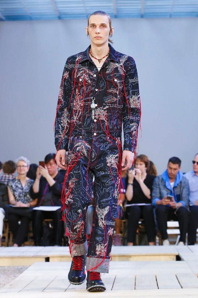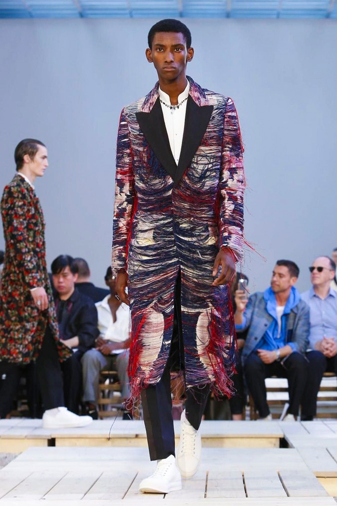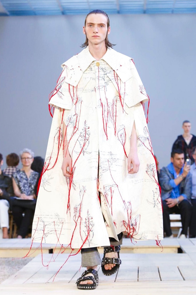 Alexander McQueen 在今年五月宣布将重返巴黎男装时装周的 T 台,时隔一个月,这家英国时装屋如约而至,发布了 2018 男装春夏系列新品。在这一季 Alexander McQueen 的新品中,花卉、树枝以及在衣服上出现的纱线元素成为主打,设计总监 Sarah Burton 希望以此方式彰显品牌一贯崇尚的暗黑时尚美学。除此之外,皮制风衣、机车夹克、皮裤等单品也是大家关注的重点。