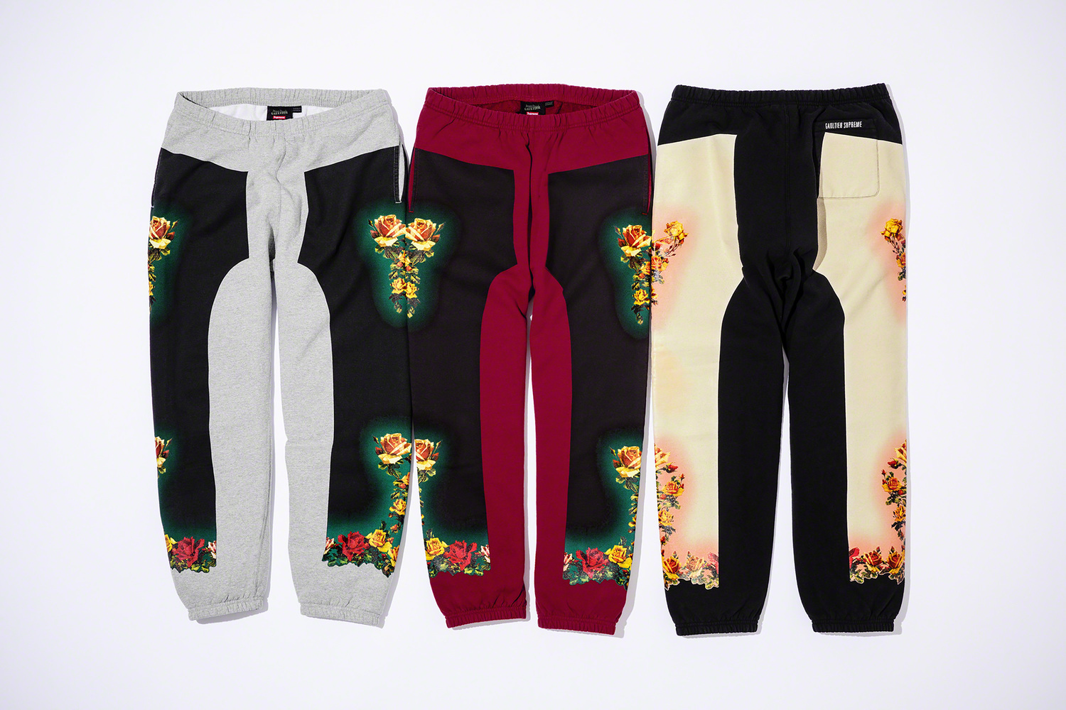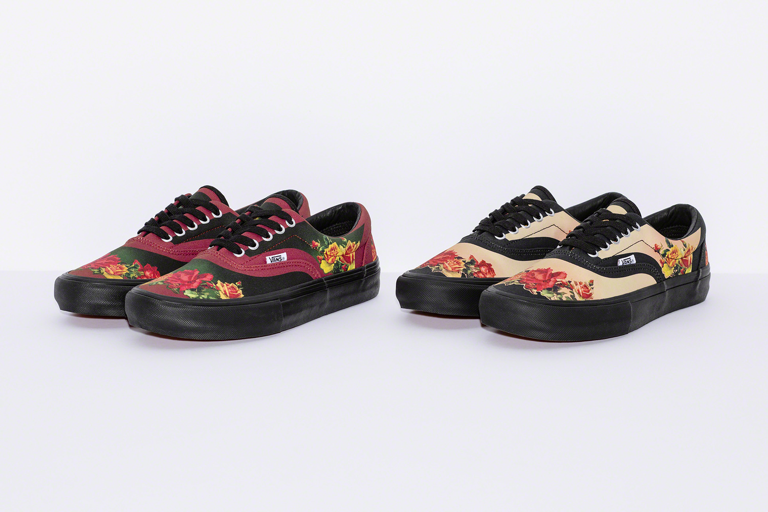 本季 Supreme x Jean Paul Gaultier 联名系列之丰富超乎想象,包括双排扣西装外套、西装裤、背心,双排扣格纹仿毛皮大衣、双面穿背包 MA-1、印花牛仔夹克、牛仔裤、人造丝衬衫、花卉图案连帽卫衣、裤、Schott 皮夹克、T恤、Le Male 香水、腰带、太阳镜,从服饰到配饰一应俱全。此外 Supreme x Jean Paul Gaultier 还携手 Vans 推出了 Era Pro 和 Chukka Pro 两款联名鞋履,亦采用醒目的花卉印花做图案呈现。
