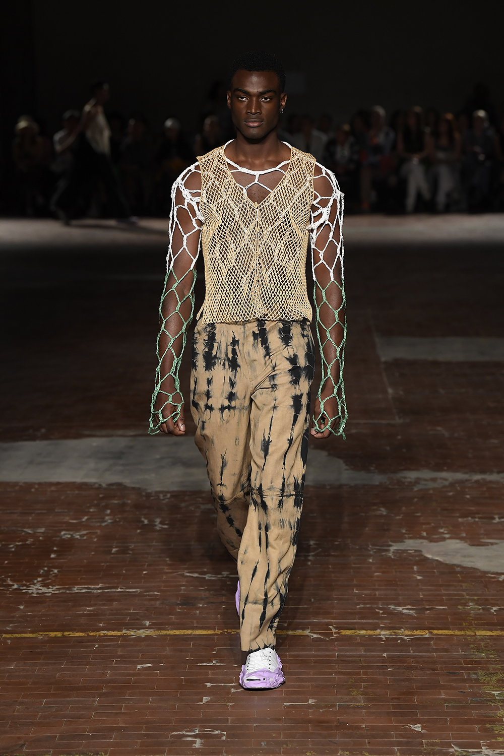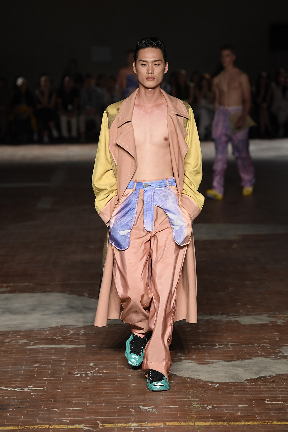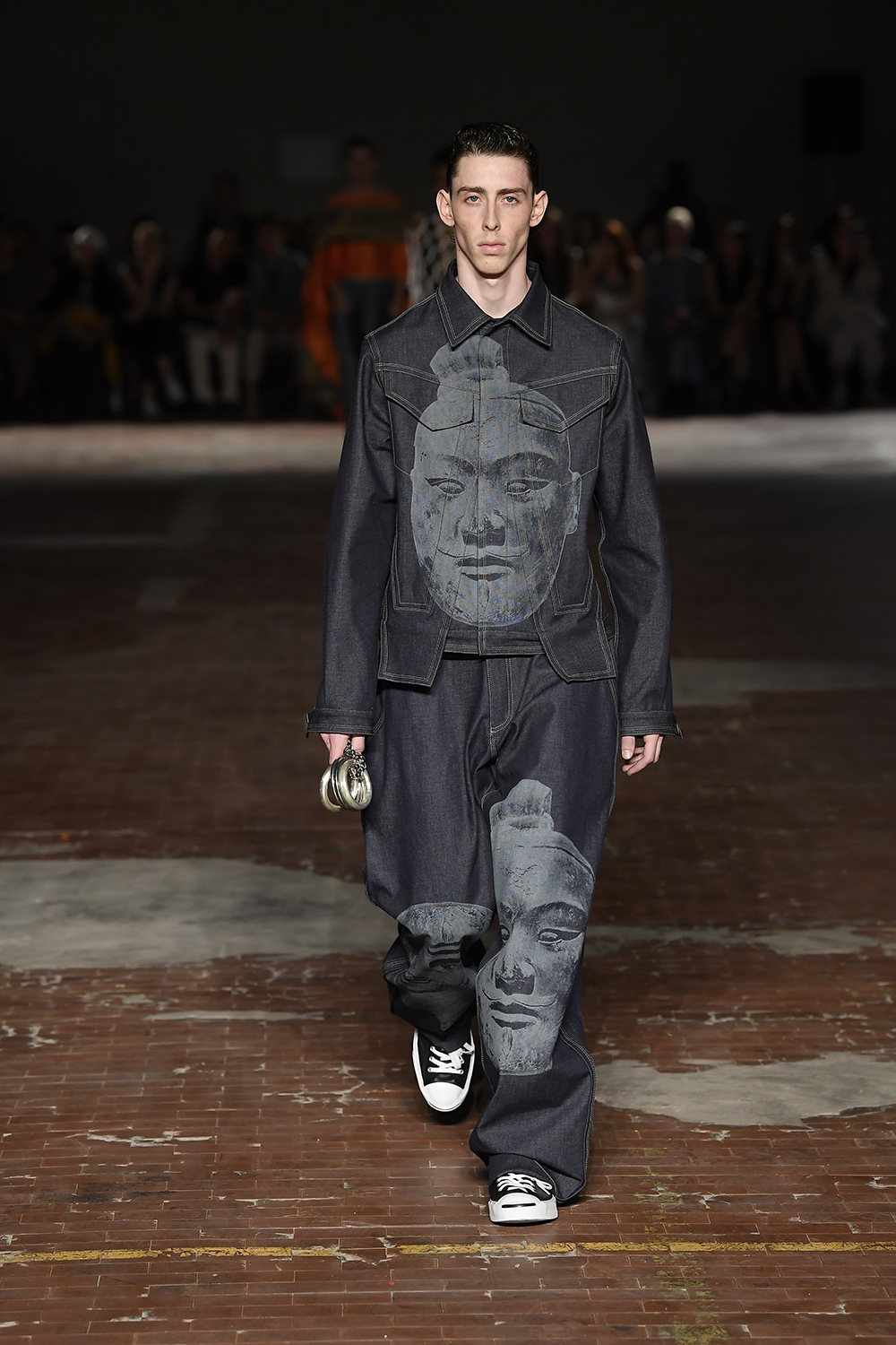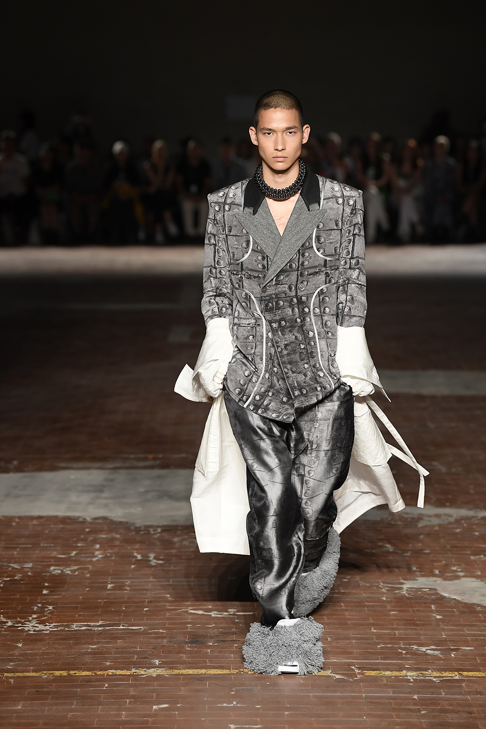 此系列中,来自苏州的迷你竹绣编织技巧被采用,工时高达 1,600 小时的珠绣与苏绣的细腻手法成就了系列中的丰富肌理层次;手工打磨的洗水牛仔与蒙古族艺人手工针织的类似防护网的大孔网衫,也同时在此系列中被介绍;当代中山装的延续用新颖的设计手法继续在系列中呈现。另外,CONVERSE x PRONOUNCE 合作的概念鞋款也在秀上进行了首发,PRONOUNCE 用最擅长的手工艺技巧与硬软材料的结合,与 CONVERSE Jack Purcell 系列产生了有趣碰撞。