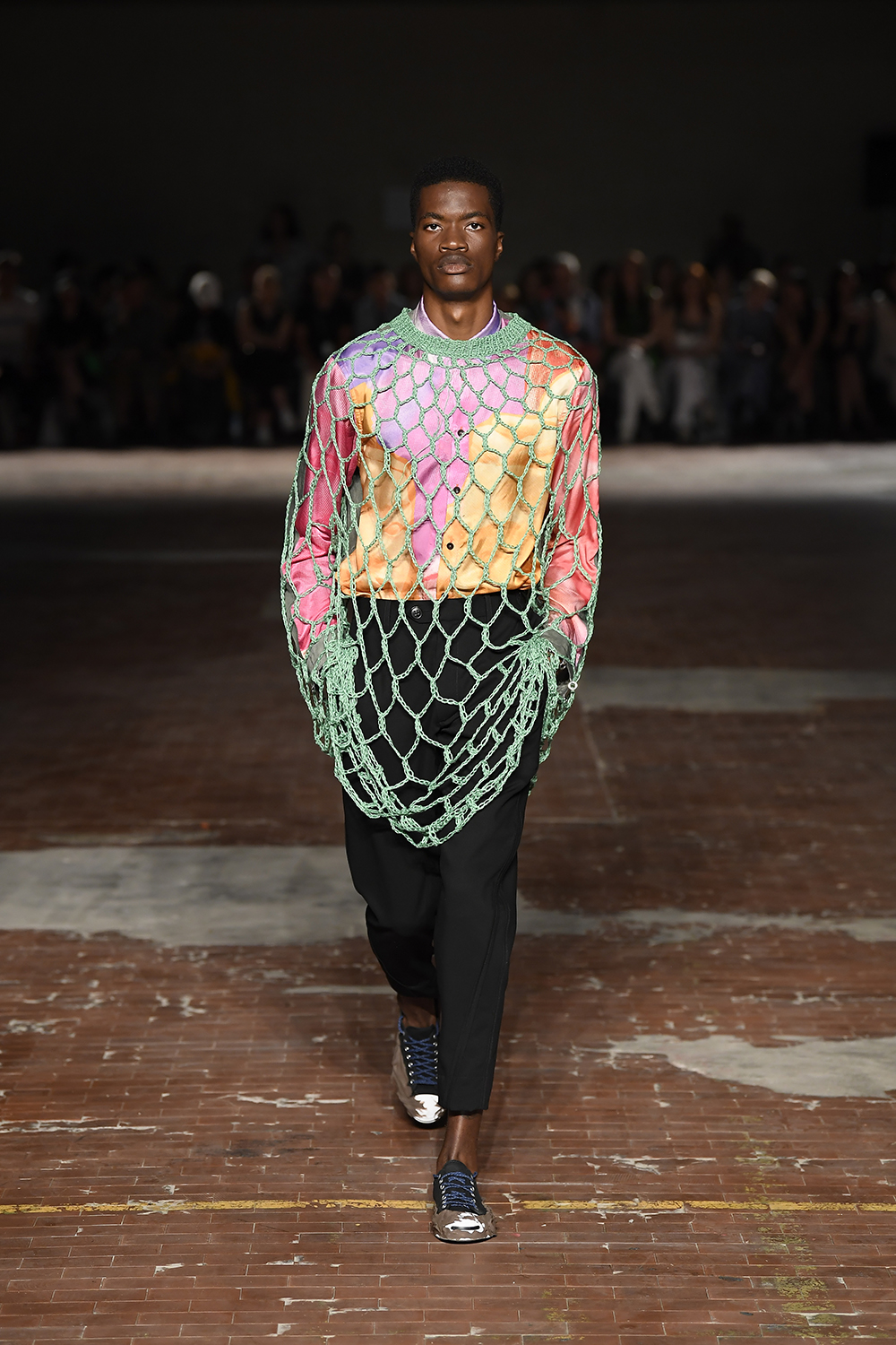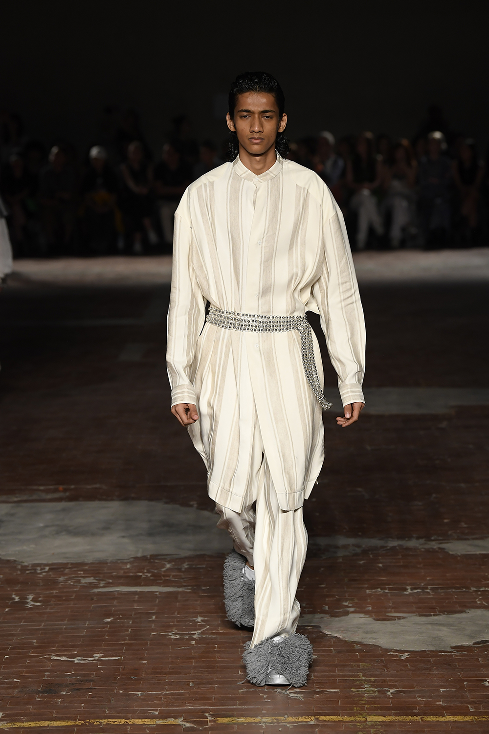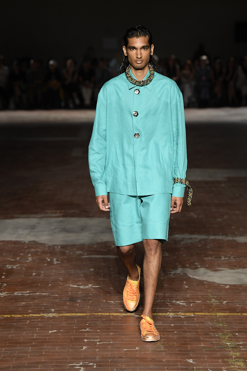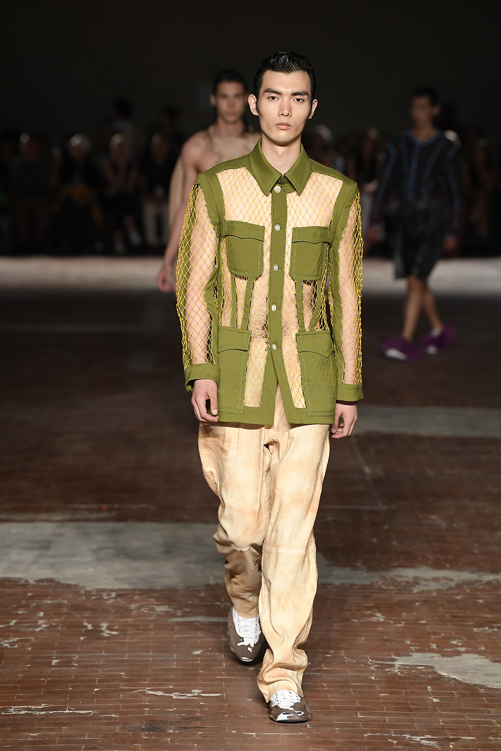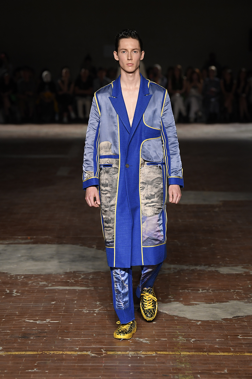 此系列中,来自苏州的迷你竹绣编织技巧被采用,工时高达 1,600 小时的珠绣与苏绣的细腻手法成就了系列中的丰富肌理层次;手工打磨的洗水牛仔与蒙古族艺人手工针织的类似防护网的大孔网衫,也同时在此系列中被介绍;当代中山装的延续用新颖的设计手法继续在系列中呈现。另外,CONVERSE x PRONOUNCE 合作的概念鞋款也在秀上进行了首发,PRONOUNCE 用最擅长的手工艺技巧与硬软材料的结合,与 CONVERSE Jack Purcell 系列产生了有趣碰撞。