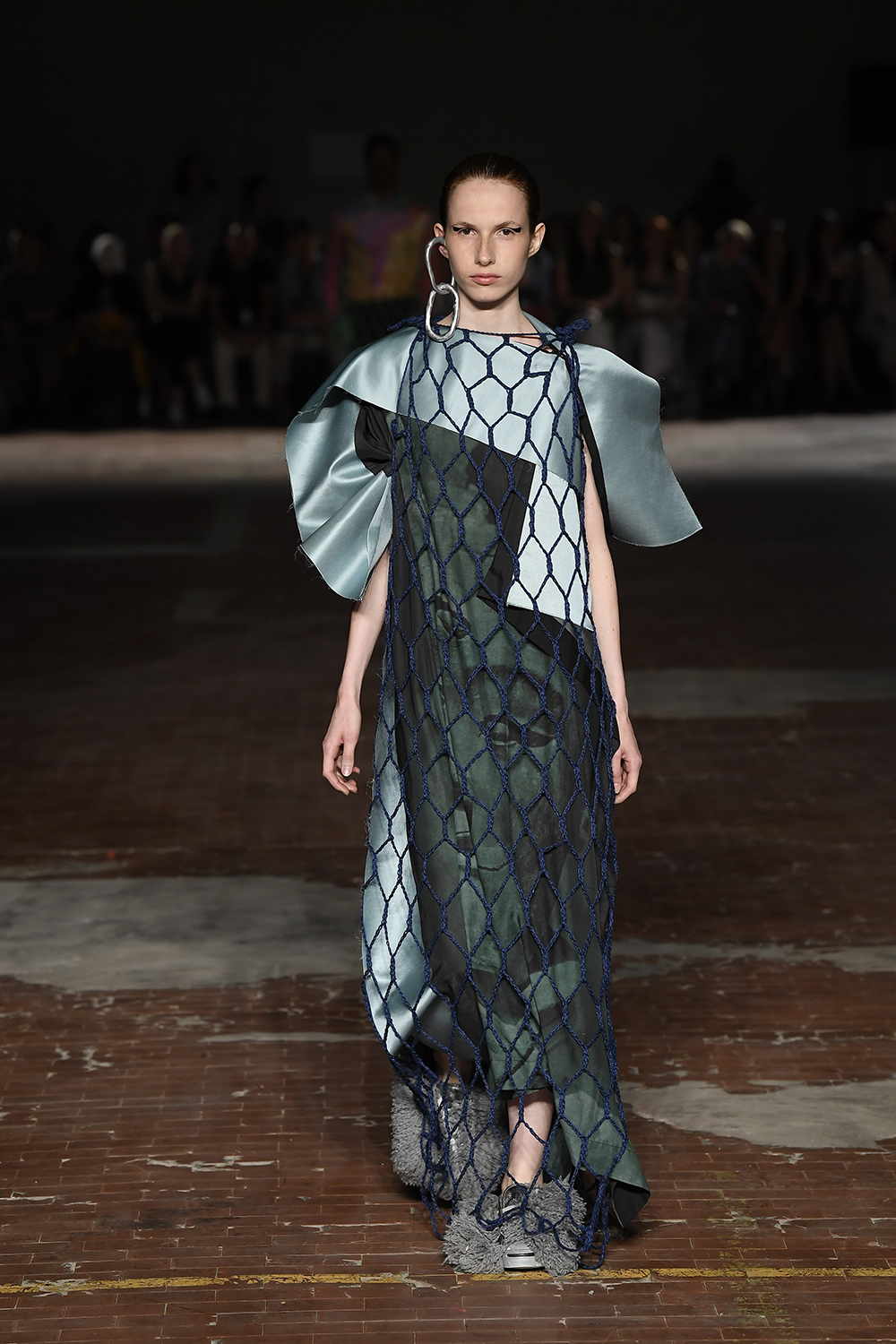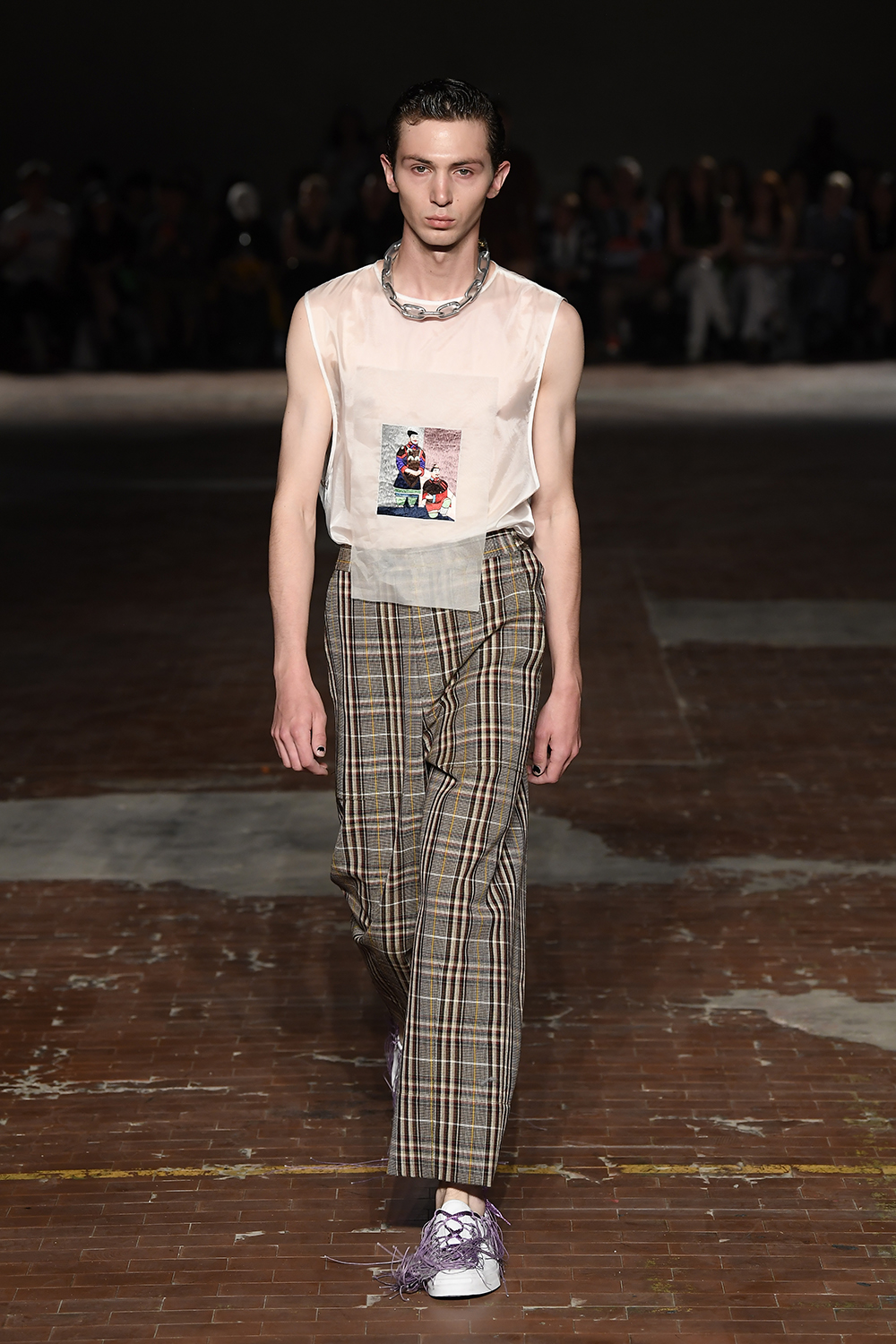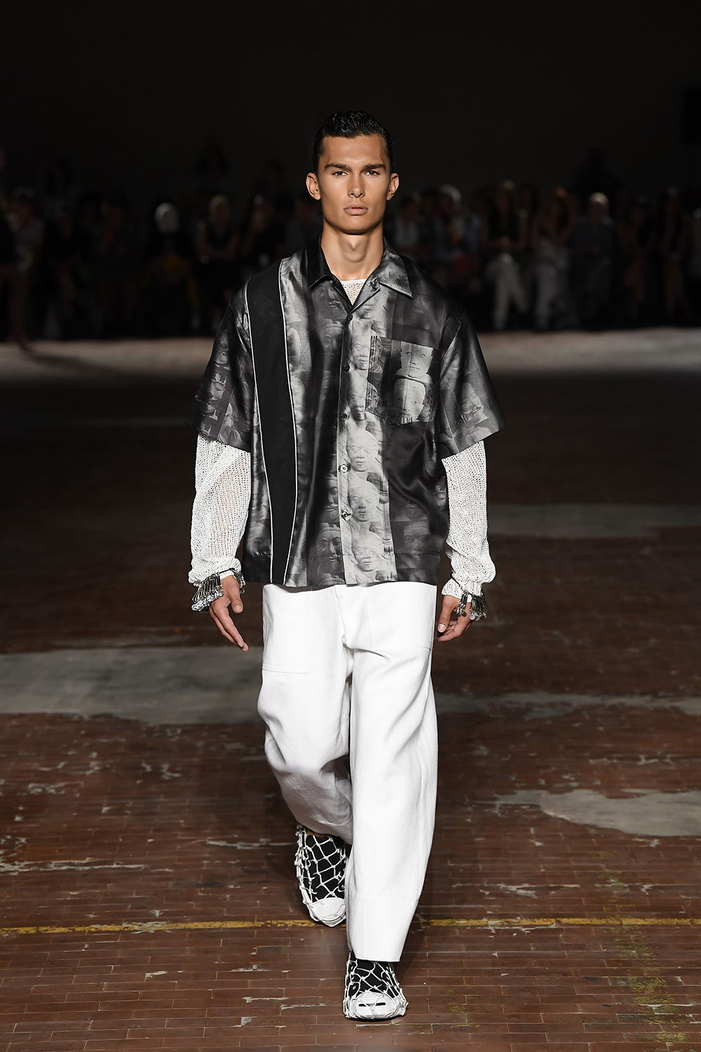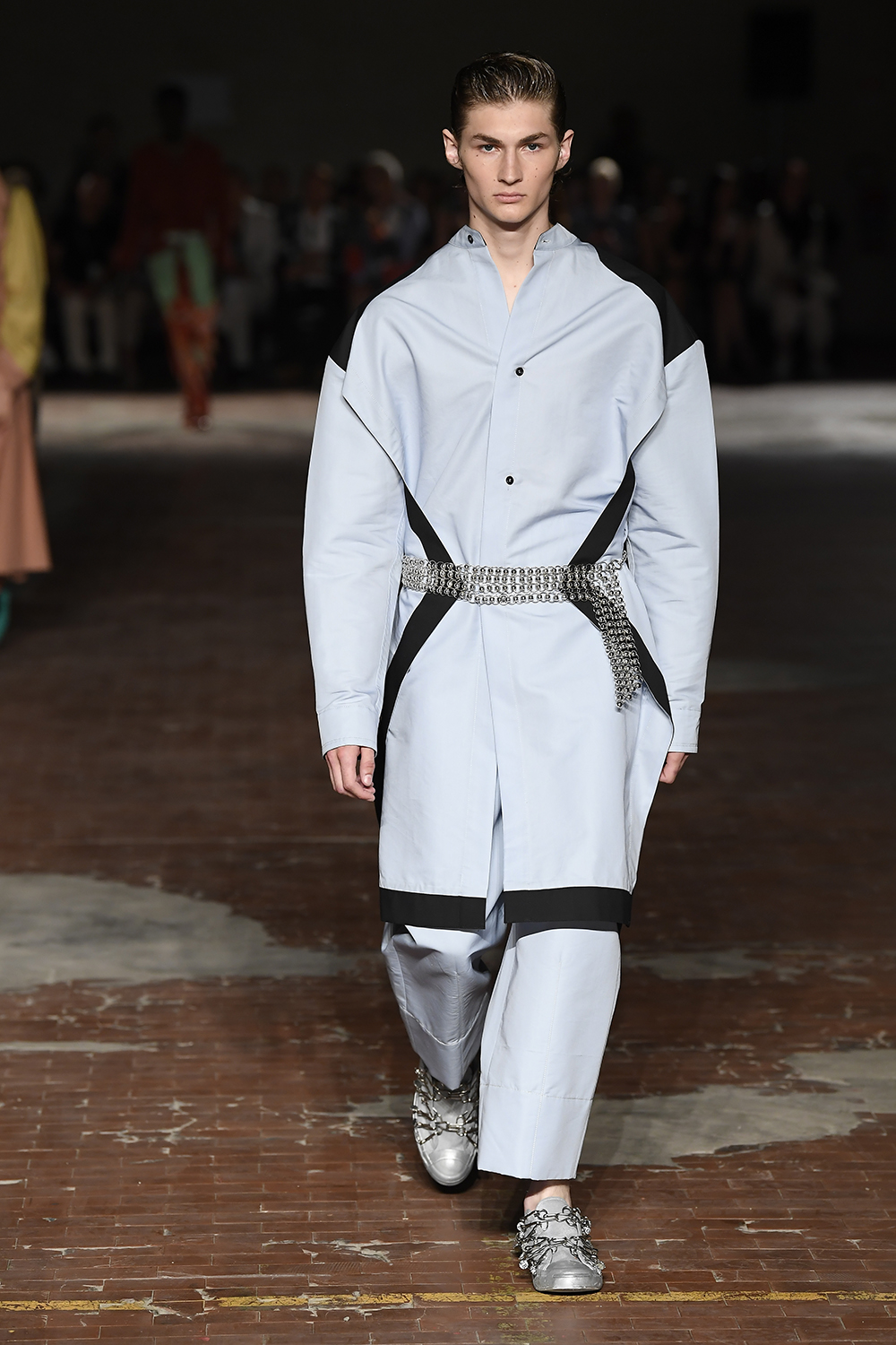 此系列中,来自苏州的迷你竹绣编织技巧被采用,工时高达 1,600 小时的珠绣与苏绣的细腻手法成就了系列中的丰富肌理层次;手工打磨的洗水牛仔与蒙古族艺人手工针织的类似防护网的大孔网衫,也同时在此系列中被介绍;当代中山装的延续用新颖的设计手法继续在系列中呈现。另外,CONVERSE x PRONOUNCE 合作的概念鞋款也在秀上进行了首发,PRONOUNCE 用最擅长的手工艺技巧与硬软材料的结合,与 CONVERSE Jack Purcell 系列产生了有趣碰撞。