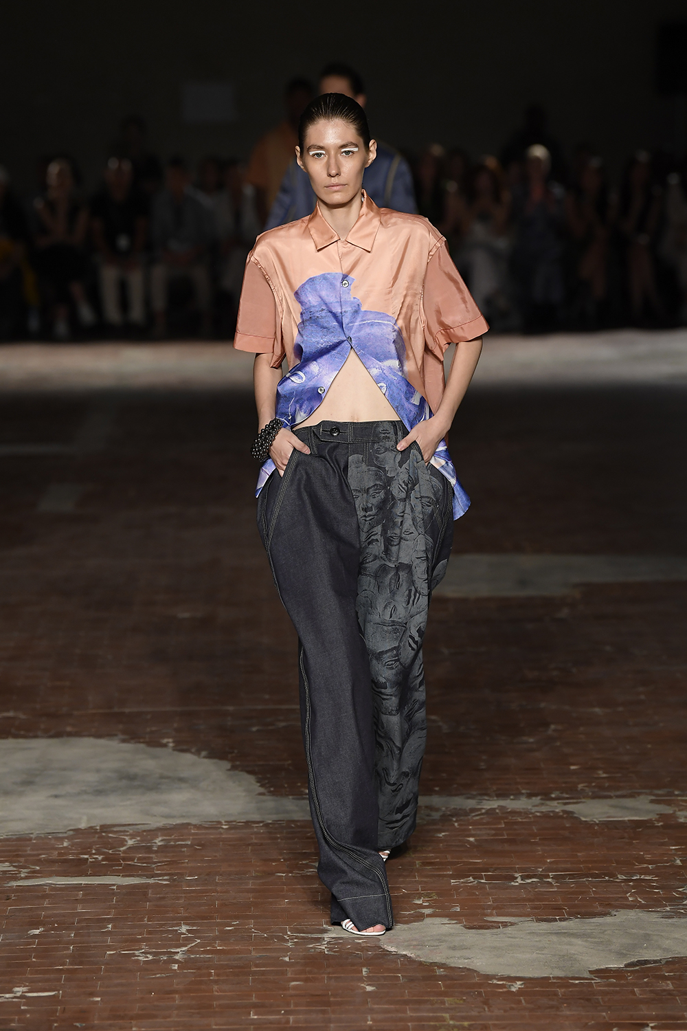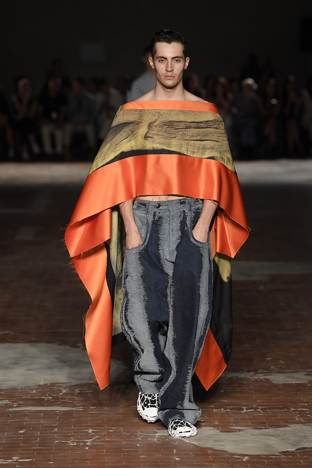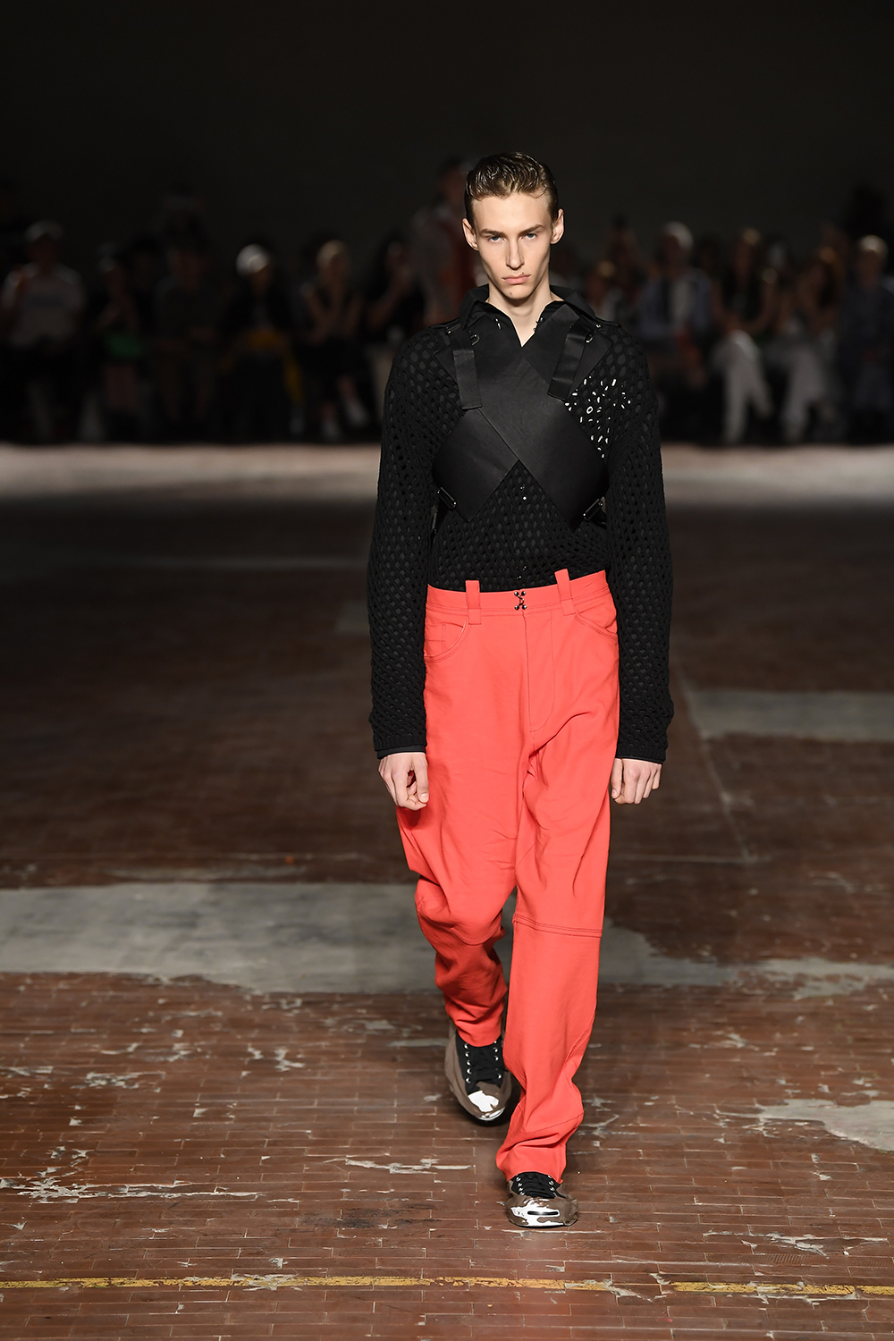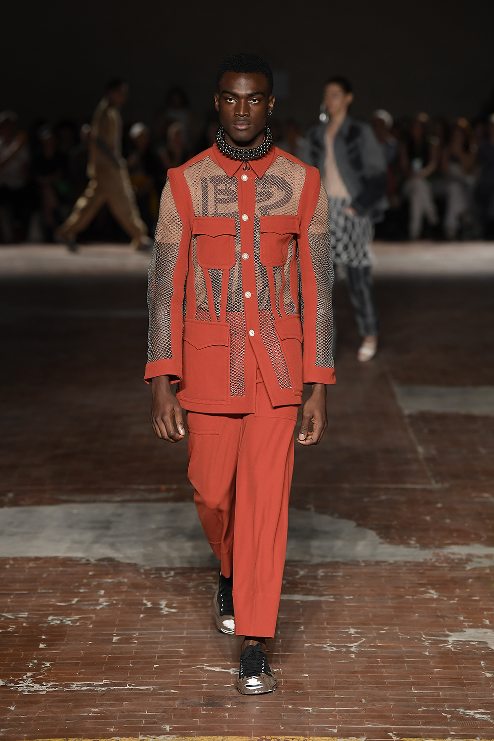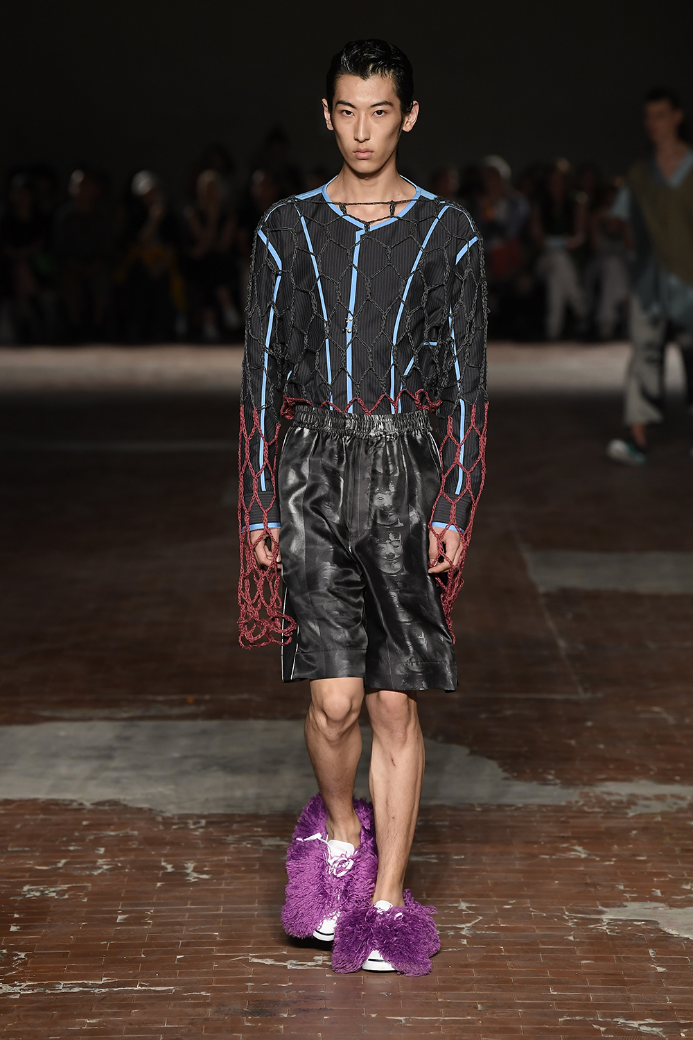 此系列中,来自苏州的迷你竹绣编织技巧被采用,工时高达 1,600 小时的珠绣与苏绣的细腻手法成就了系列中的丰富肌理层次;手工打磨的洗水牛仔与蒙古族艺人手工针织的类似防护网的大孔网衫,也同时在此系列中被介绍;当代中山装的延续用新颖的设计手法继续在系列中呈现。另外,CONVERSE x PRONOUNCE 合作的概念鞋款也在秀上进行了首发,PRONOUNCE 用最擅长的手工艺技巧与硬软材料的结合,与 CONVERSE Jack Purcell 系列产生了有趣碰撞。
