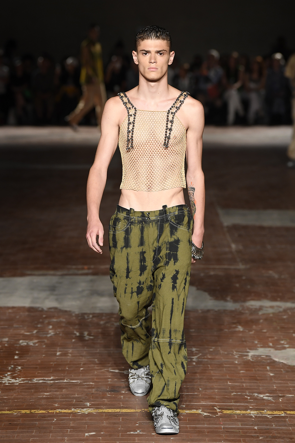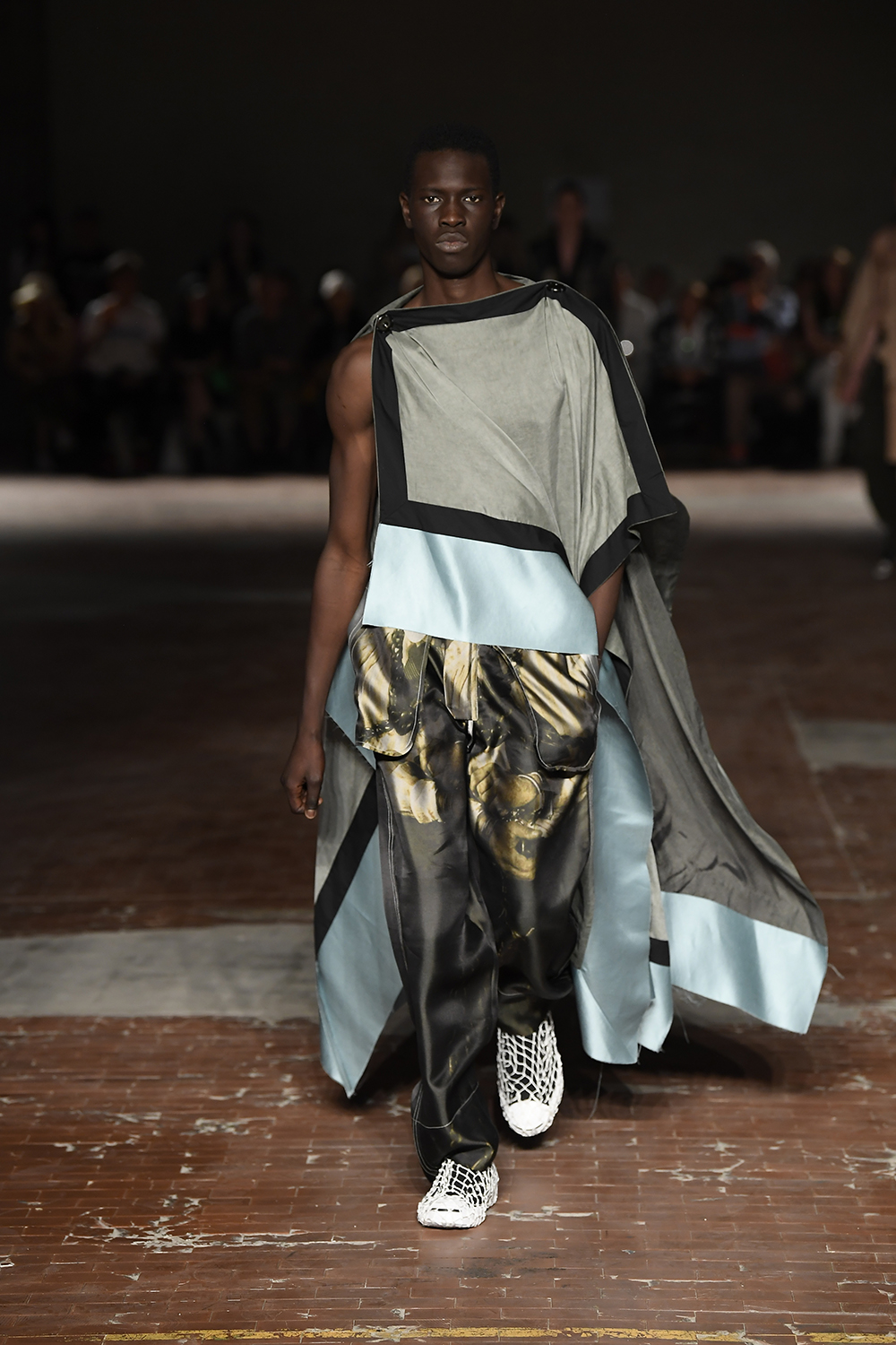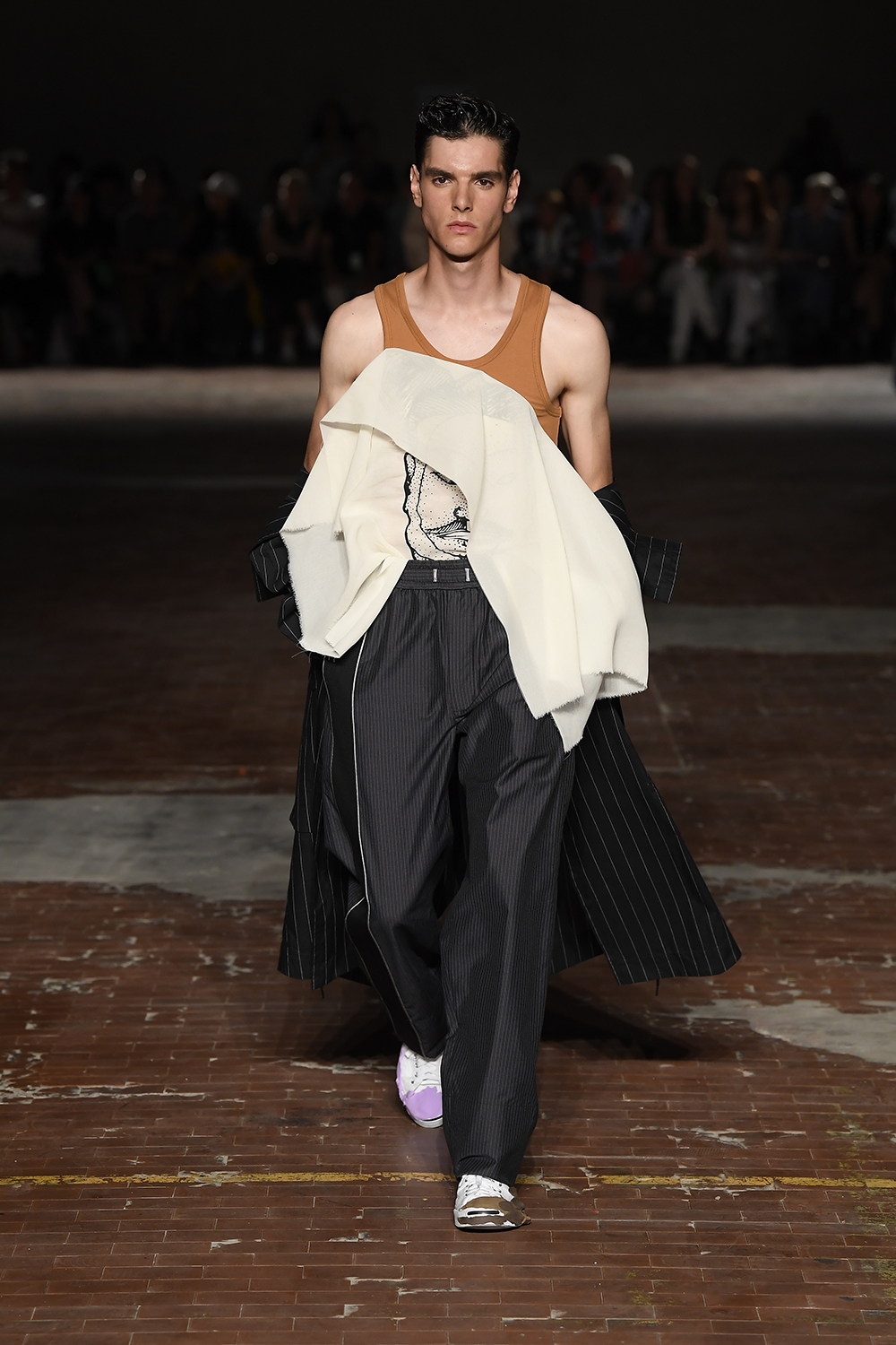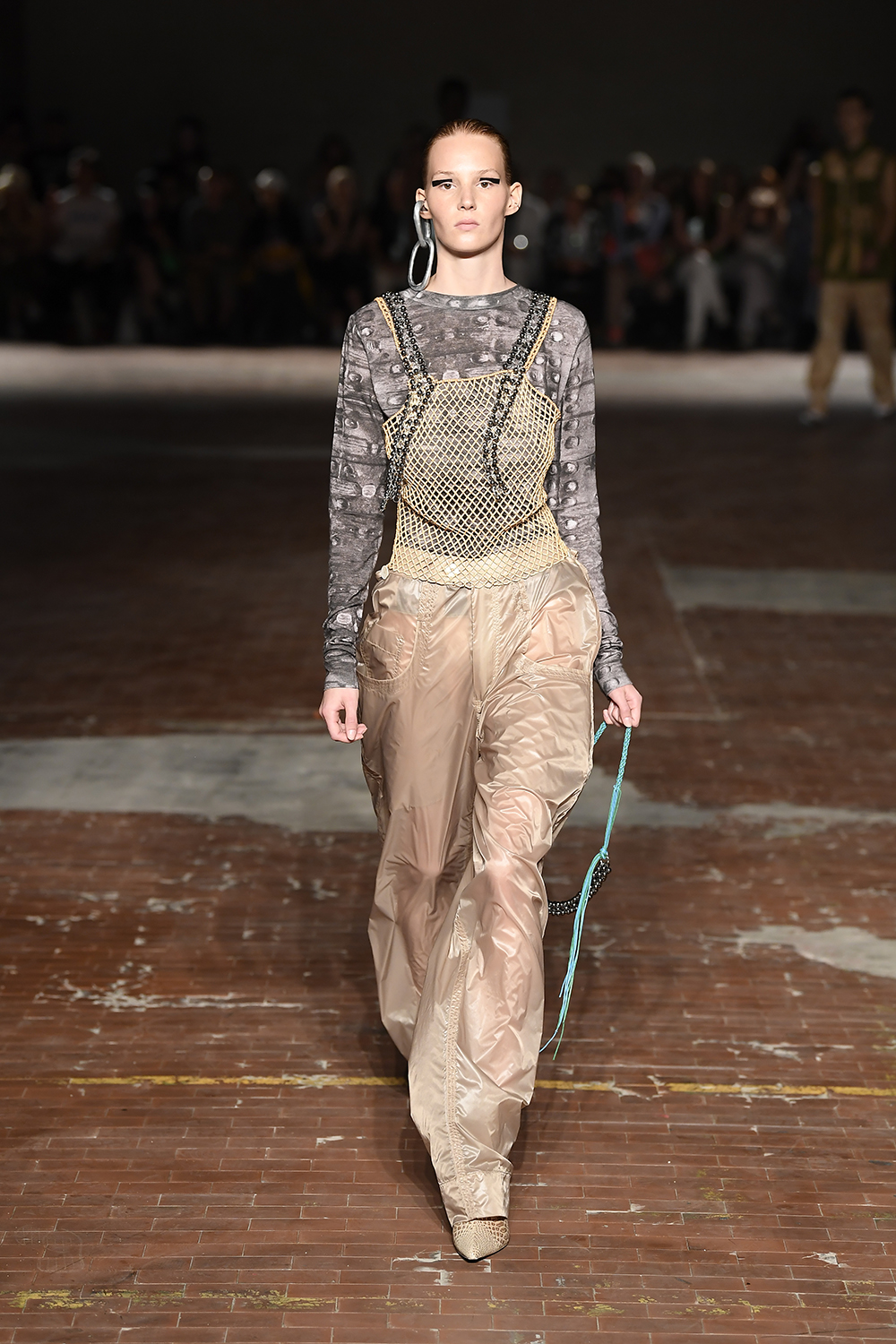 此系列中,来自苏州的迷你竹绣编织技巧被采用,工时高达 1,600 小时的珠绣与苏绣的细腻手法成就了系列中的丰富肌理层次;手工打磨的洗水牛仔与蒙古族艺人手工针织的类似防护网的大孔网衫,也同时在此系列中被介绍;当代中山装的延续用新颖的设计手法继续在系列中呈现。另外,CONVERSE x PRONOUNCE 合作的概念鞋款也在秀上进行了首发,PRONOUNCE 用最擅长的手工艺技巧与硬软材料的结合,与 CONVERSE Jack Purcell 系列产生了有趣碰撞。