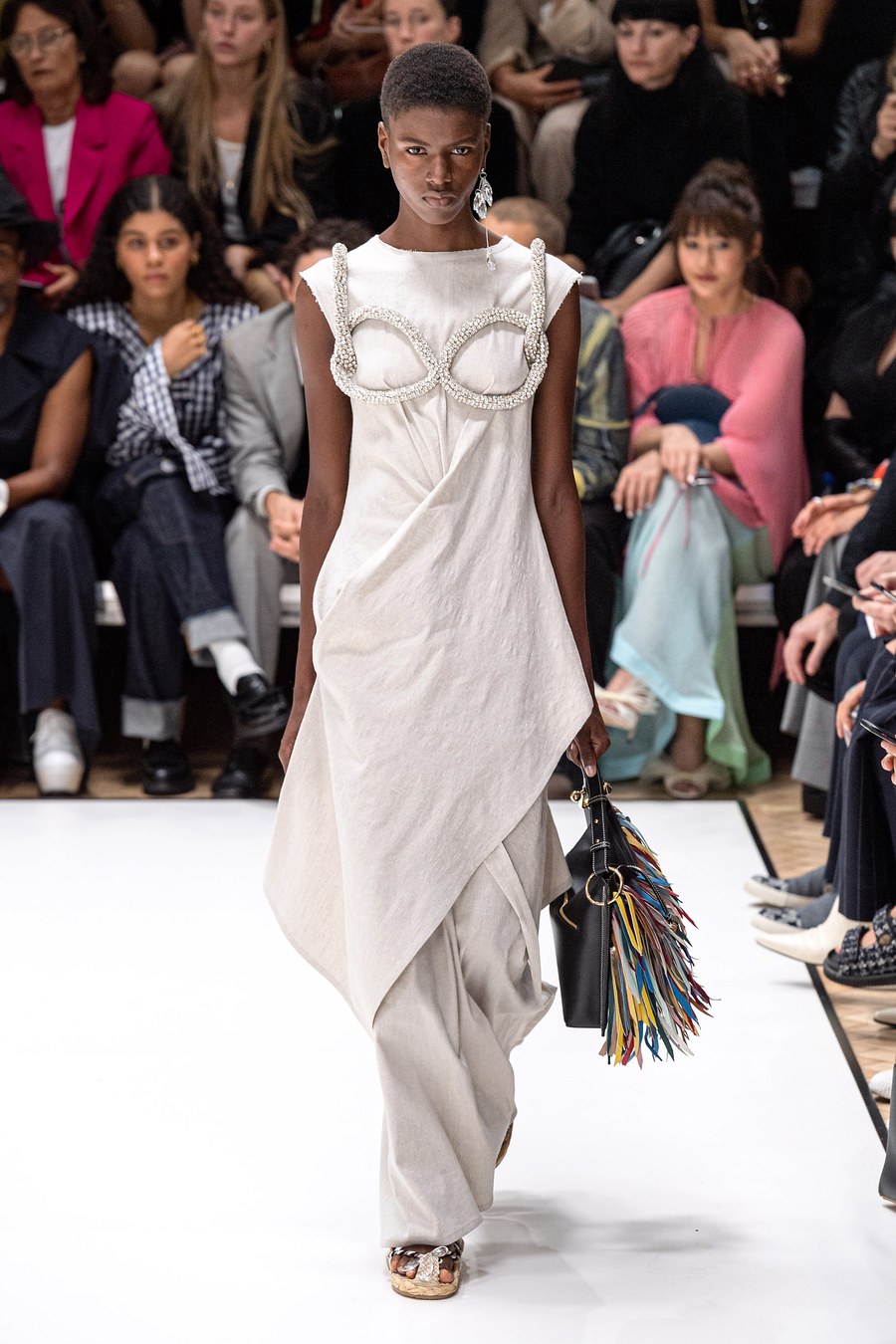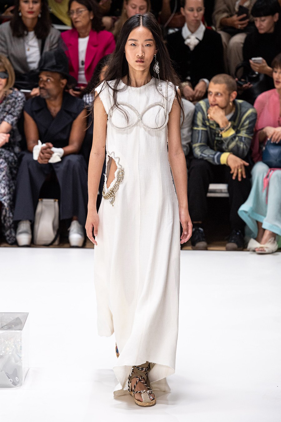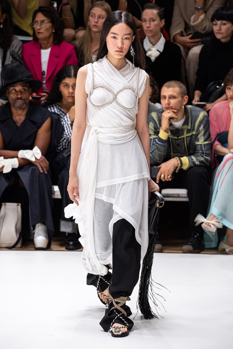 JW Anderson 于 2020 伦敦时装周呈现了一场原始、朴素、中世纪的春夏大秀。模特们走在纯白的 T 台上,衬托出 Jonathan Anderson 设计下标志性的服装廓形和装饰细节。本季最精彩的依然是配饰部分,别致的胸衣设计在此前 2018 春夏系列也使用过,这一季索性设计出一个独立的 “胸衣” 配饰出现在成衣上,极具辨识度。