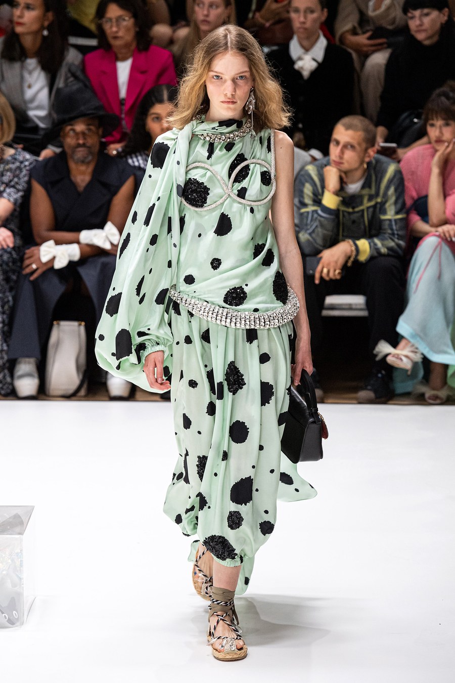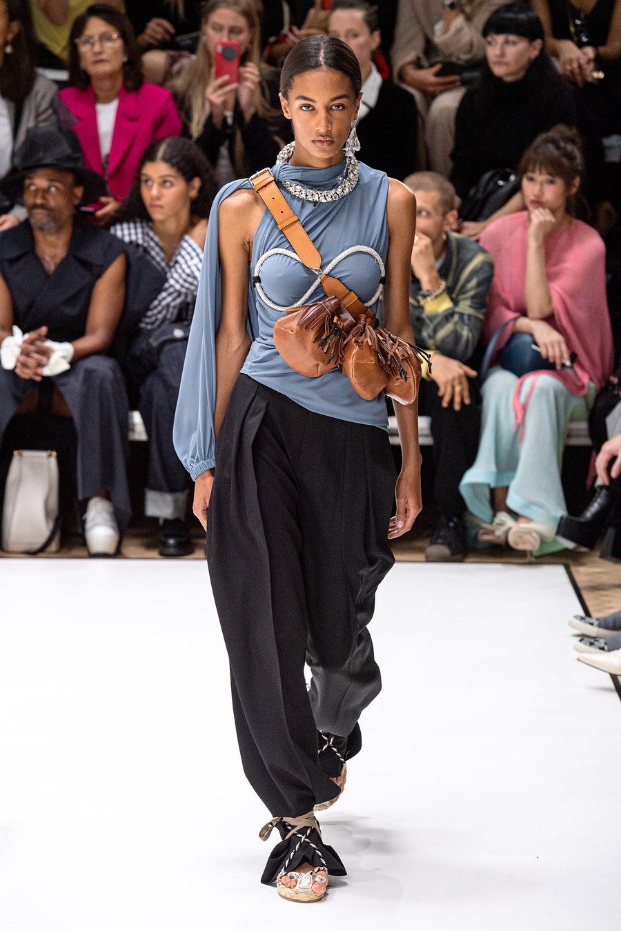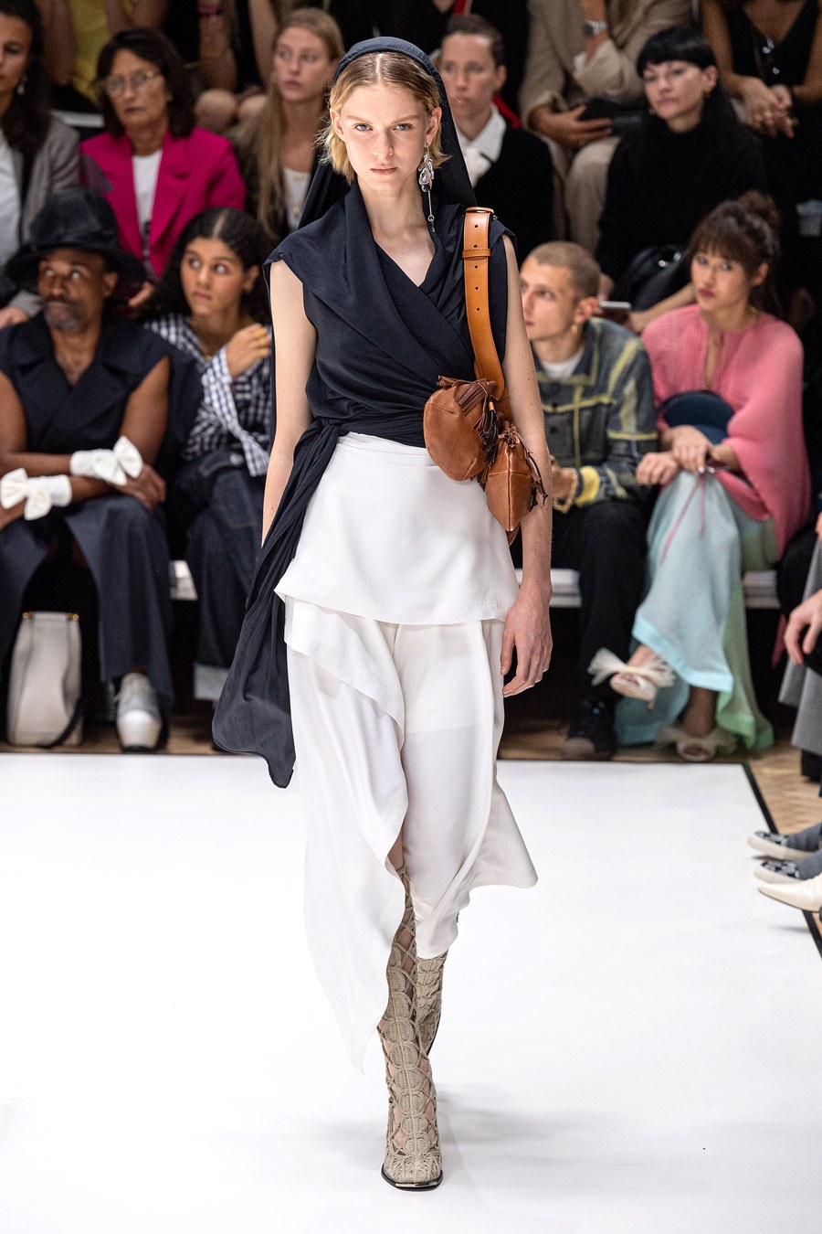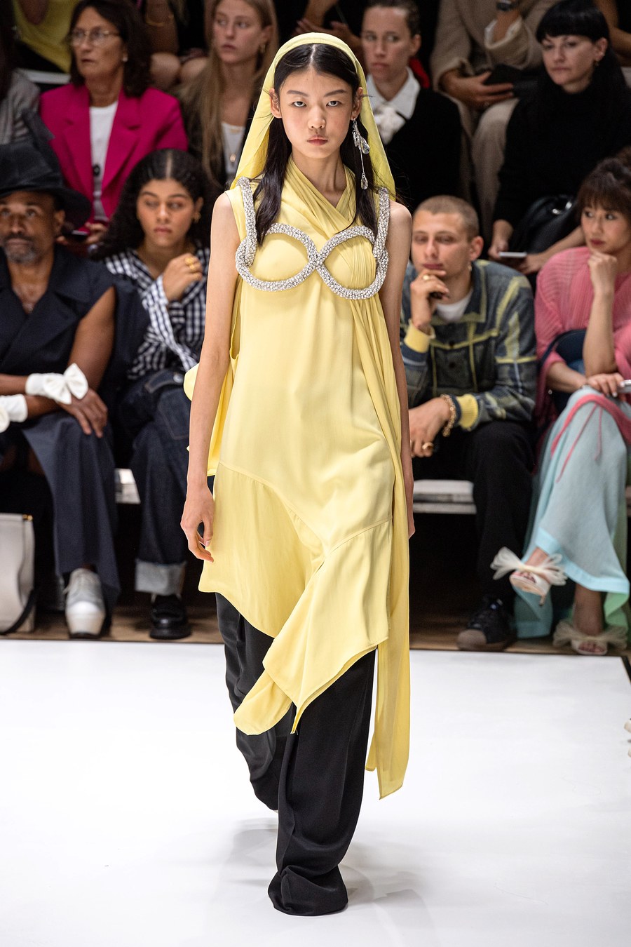 JW Anderson 于 2020 伦敦时装周呈现了一场原始、朴素、中世纪的春夏大秀。模特们走在纯白的 T 台上,衬托出 Jonathan Anderson 设计下标志性的服装廓形和装饰细节。本季最精彩的依然是配饰部分,别致的胸衣设计在此前 2018 春夏系列也使用过,这一季索性设计出一个独立的 “胸衣” 配饰出现在成衣上,极具辨识度。