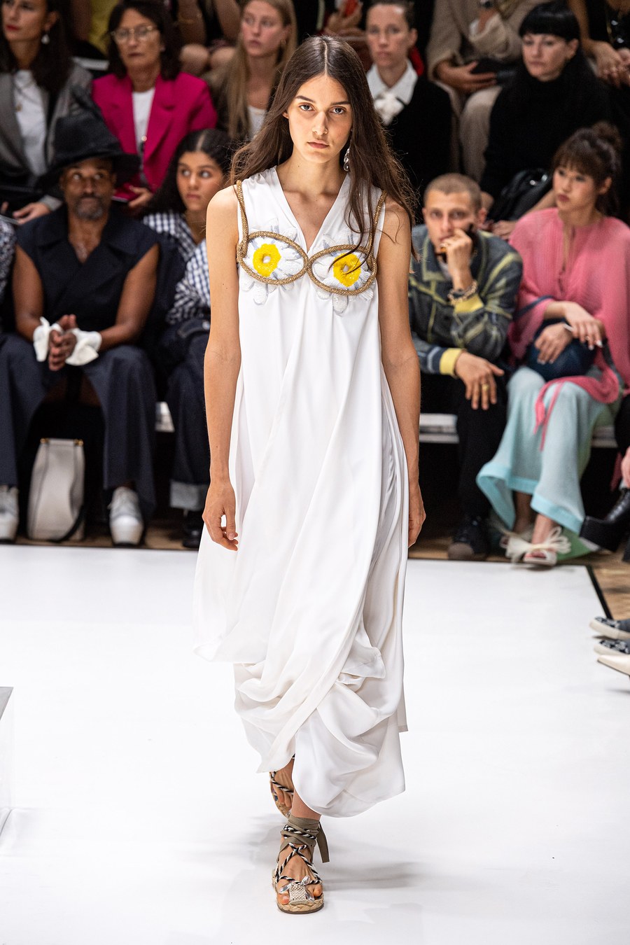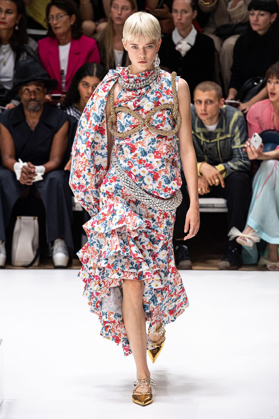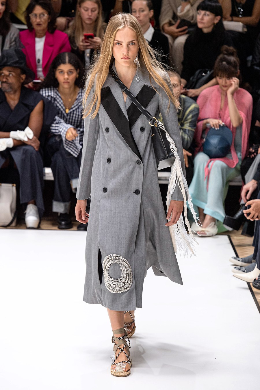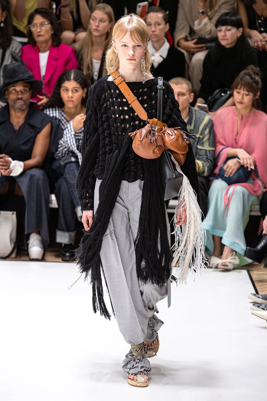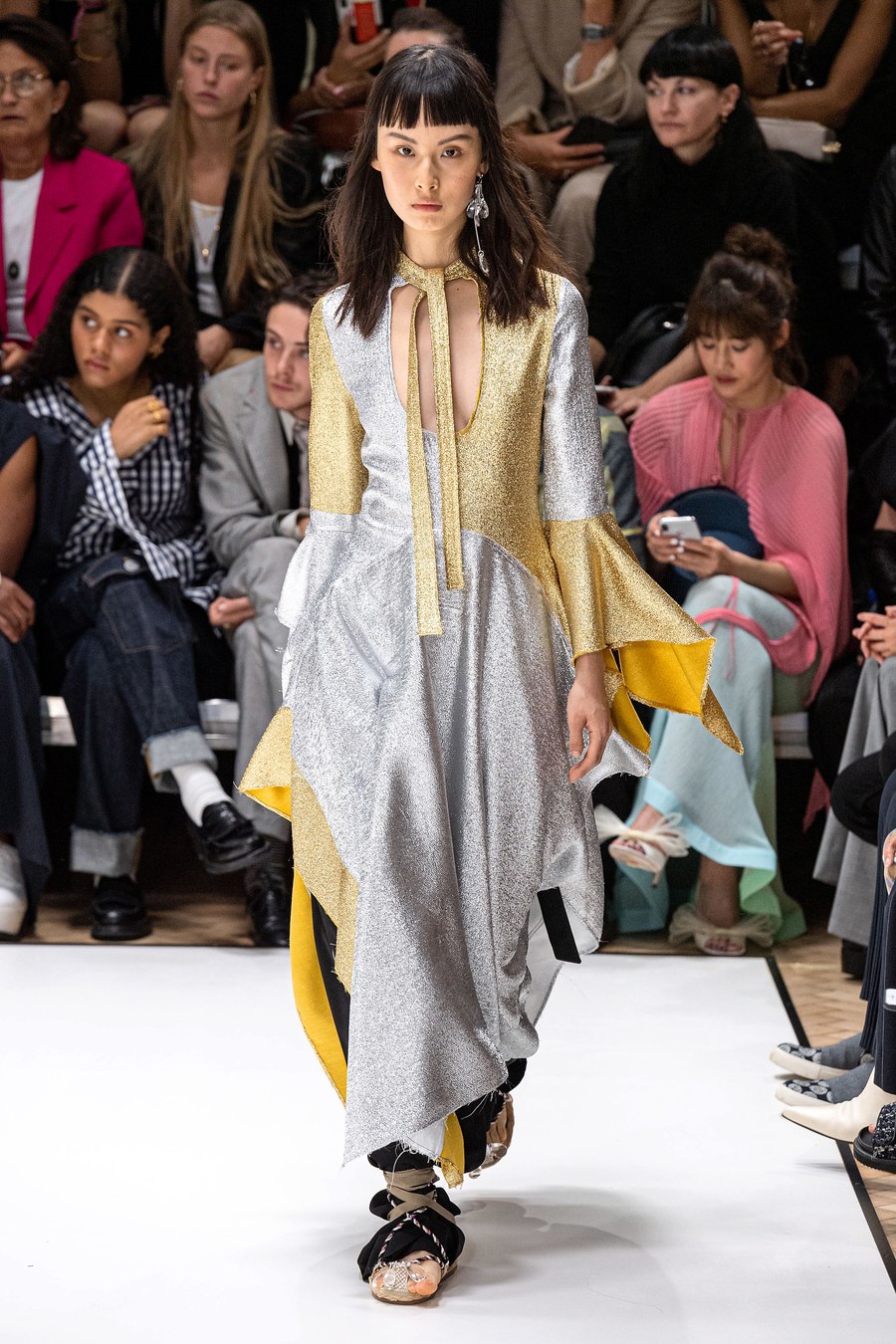Anderson 对于廓形剪裁的把握也是一如既往的精湛,延续品牌一直以来对女性线条的独特抽象表现。解构式风衣、镂空细节、多彩流苏、低饱和度配色和不对称抽褶… 这些都构成了 JW Anderson 独一无二的时装符号。就连单边耳饰及绑带草凉鞋也被 Anderson 玩出了花样。