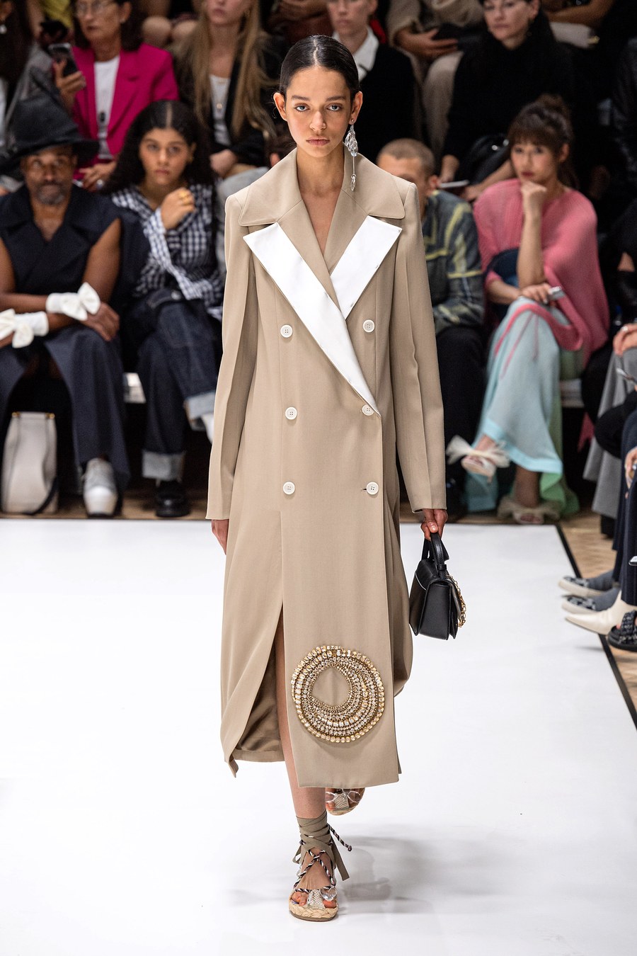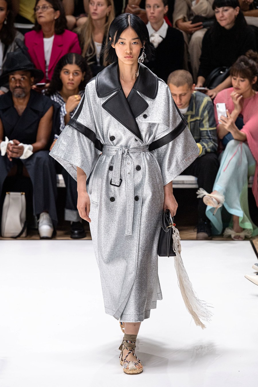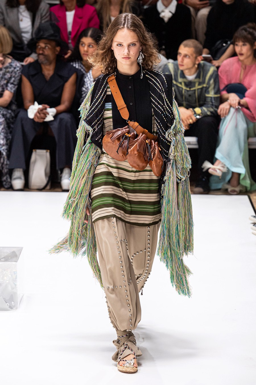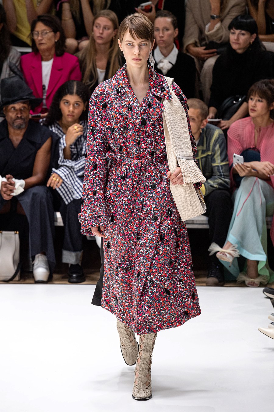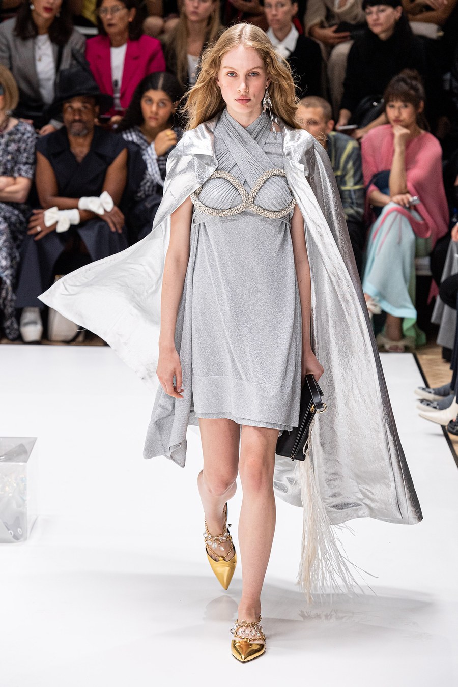 Anderson 对于廓形剪裁的把握也是一如既往的精湛,延续品牌一直以来对女性线条的独特抽象表现。解构式风衣、镂空细节、多彩流苏、低饱和度配色和不对称抽褶… 这些都构成了 JW Anderson 独一无二的时装符号。就连单边耳饰及绑带草凉鞋也被 Anderson 玩出了花样。