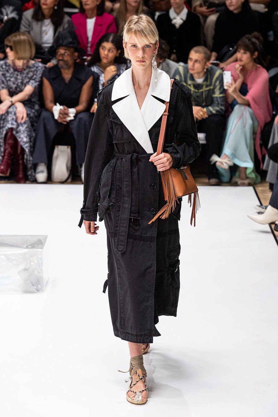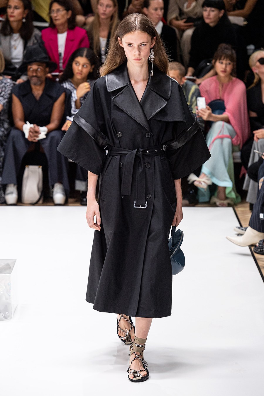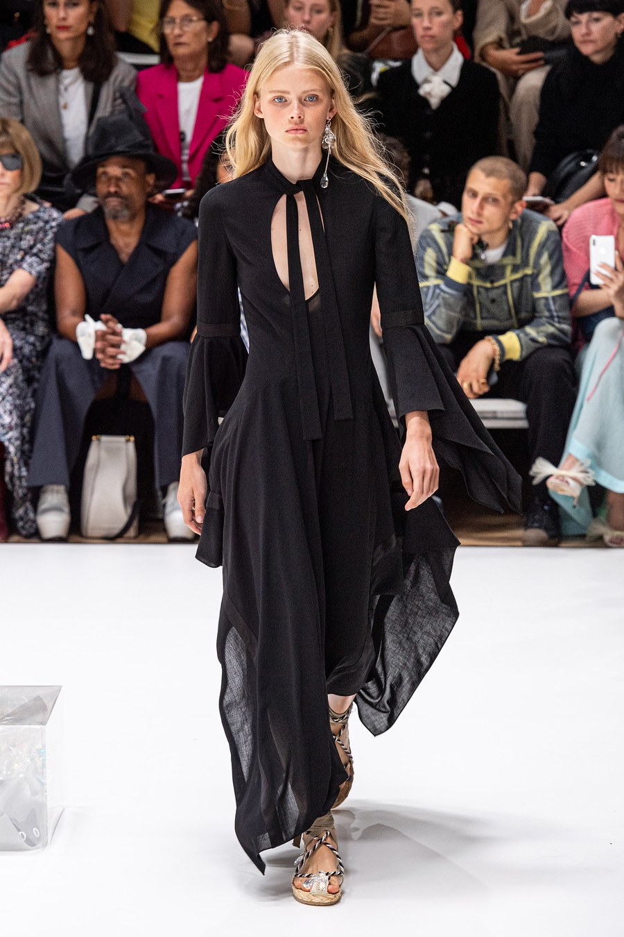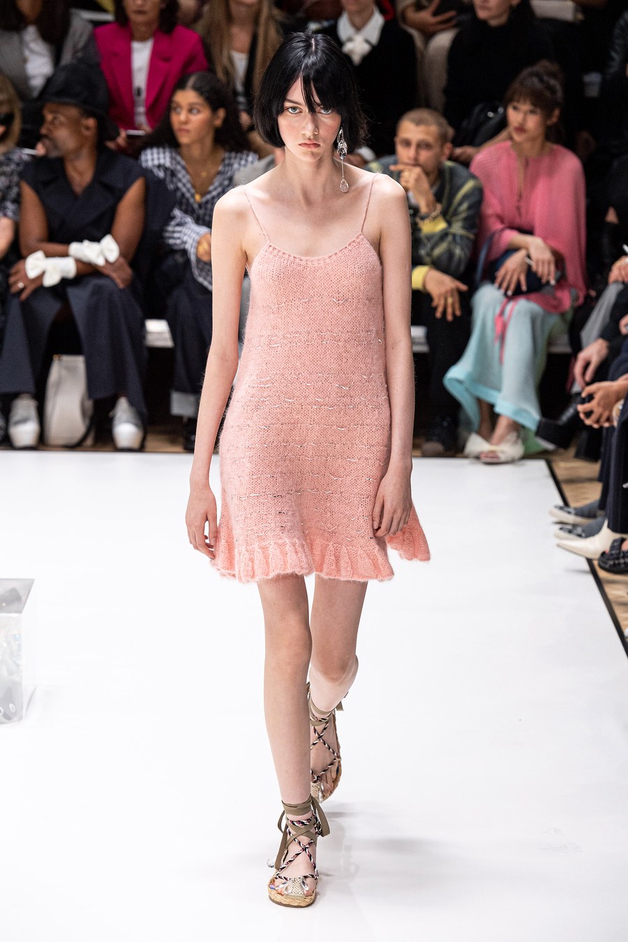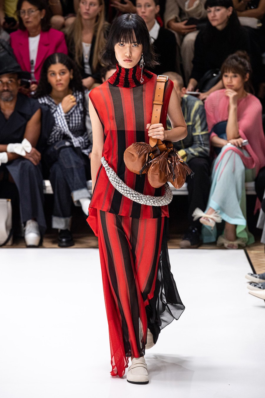 Anderson 对于廓形剪裁的把握也是一如既往的精湛,延续品牌一直以来对女性线条的独特抽象表现。解构式风衣、镂空细节、多彩流苏、低饱和度配色和不对称抽褶… 这些都构成了 JW Anderson 独一无二的时装符号。就连单边耳饰及绑带草凉鞋也被 Anderson 玩出了花样。