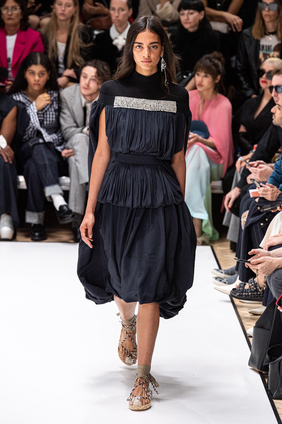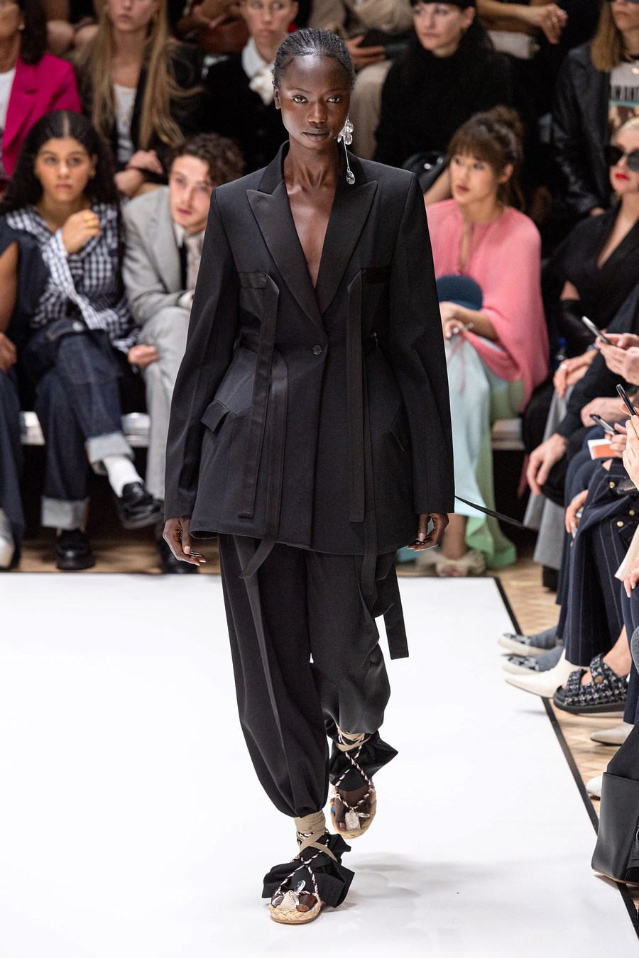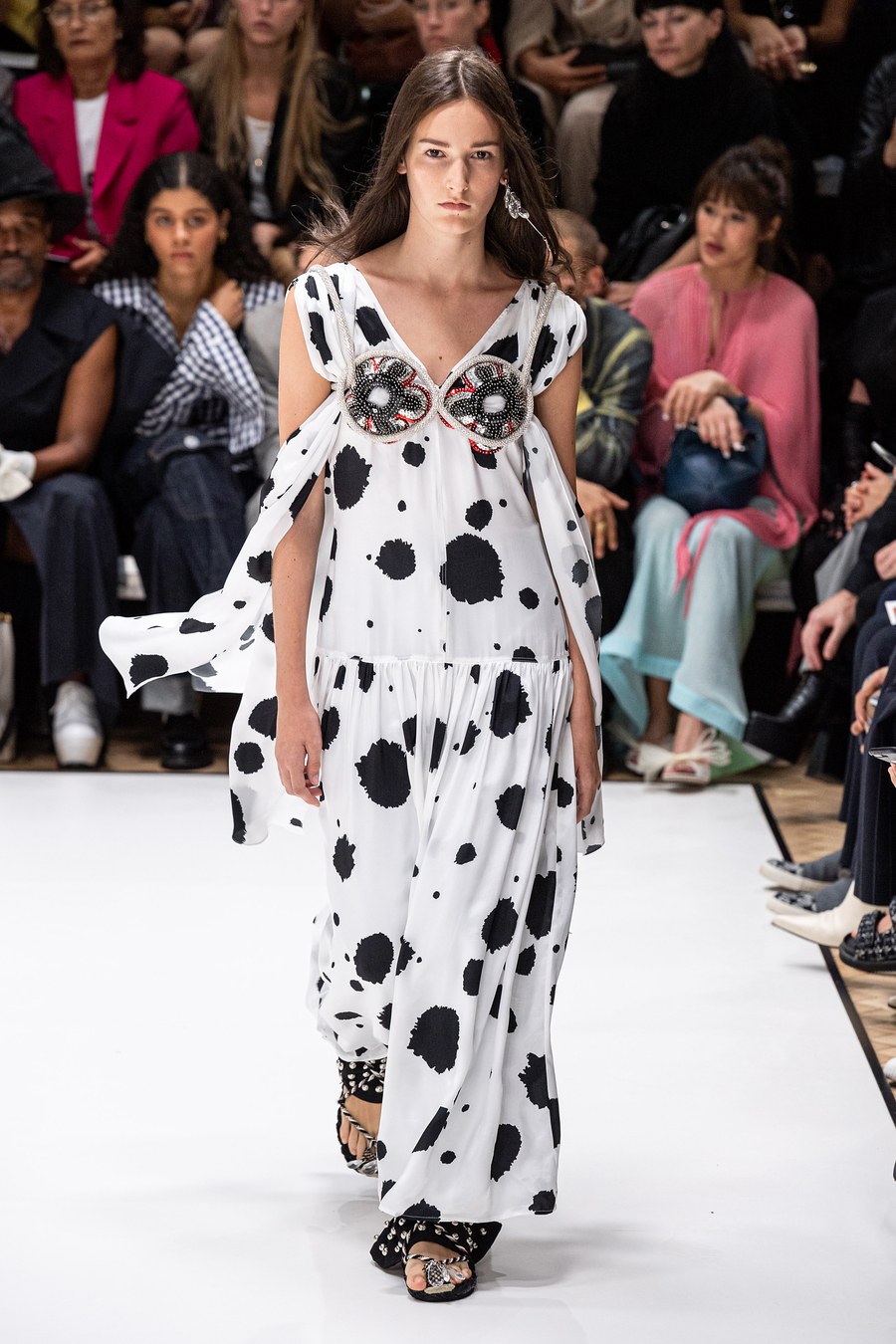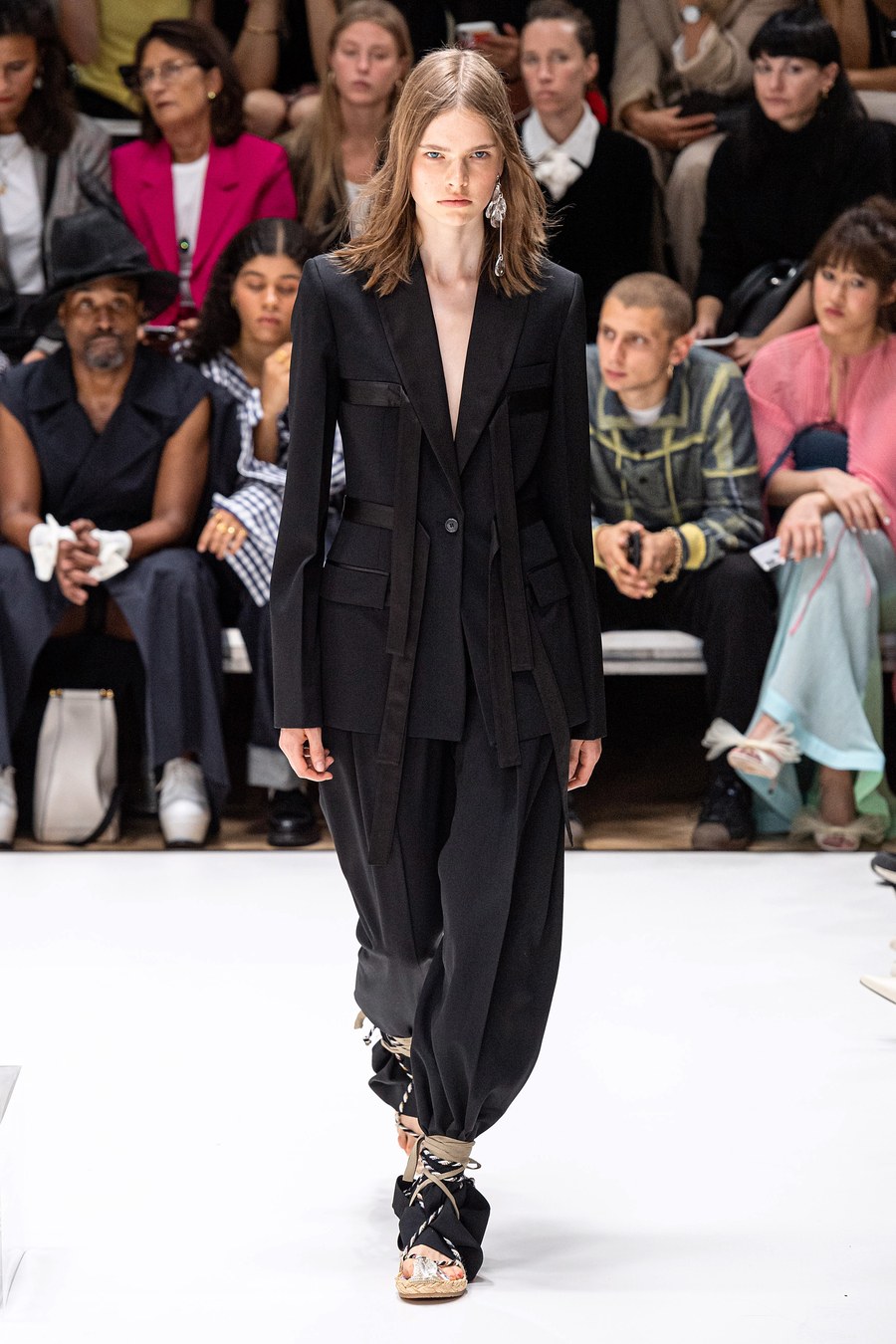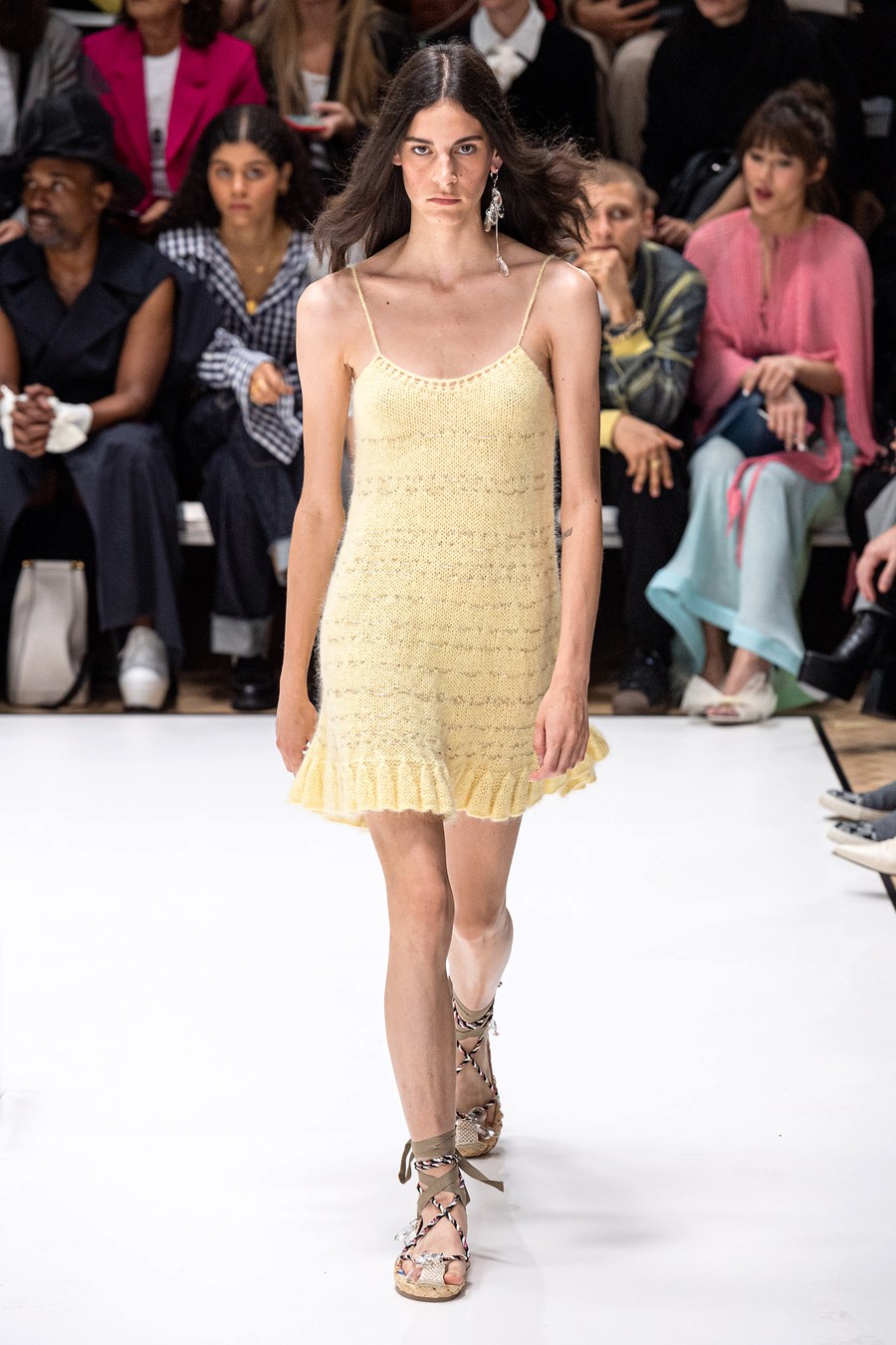 Anderson 对于廓形剪裁的把握也是一如既往的精湛,延续品牌一直以来对女性线条的独特抽象表现。解构式风衣、镂空细节、多彩流苏、低饱和度配色和不对称抽褶… 这些都构成了 JW Anderson 独一无二的时装符号。就连单边耳饰及绑带草凉鞋也被 Anderson 玩出了花样。