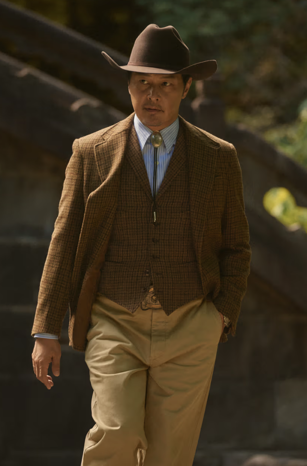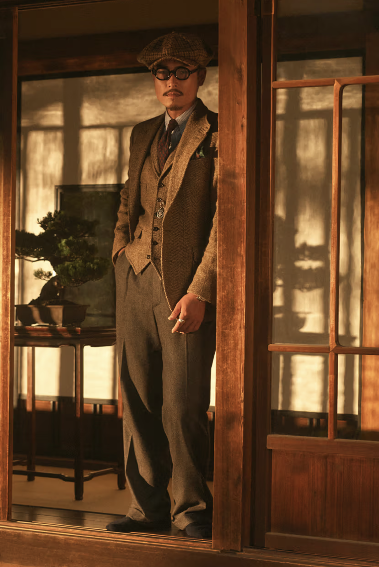 演员连凯用细格纹西服、马甲和复古帽,演绎出好莱坞黄金时代的绅士风度;AaronChang 将棒球夹克与衬衫领带大胆组合,重新定义了商务与休闲的界限;而 HirokiKoda 的演绎更让人眼前一亮:大地色系的三件套西装搭配随性的贝雷帽,既有英伦绅士的优雅,又不失艺术家的洒脱气质。