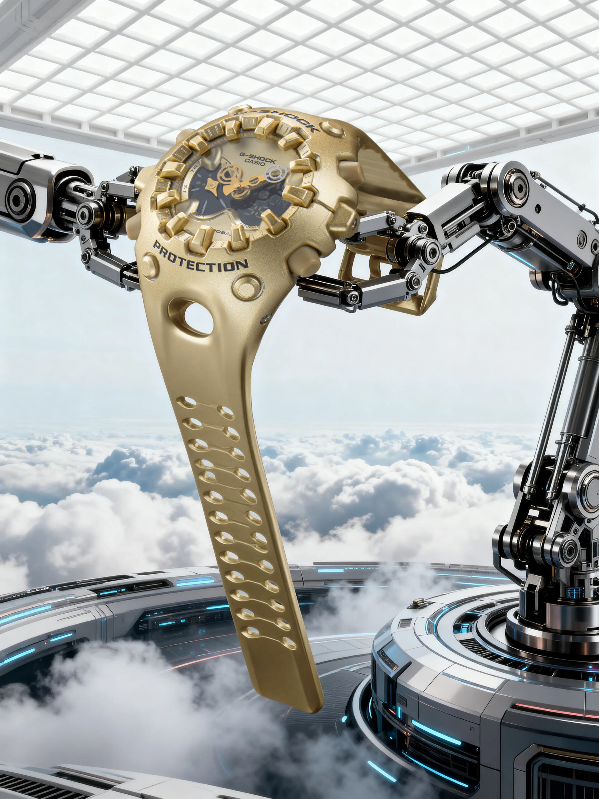 而另一款「GA-V01A-9A 流光金」则为表款赋予一种几近神圣的恢弘之感。在未来主义美学中,充满张力的金色往往象征着神性、权力和未知的高级文明。例如《银翼杀手 2049》里华莱士公司内部的金色色调,配合极简的建筑结构与空旷的大空间,置身其中会有种人生而渺小的感觉。这是对未知的敬畏,亦是对未来无限可能性的窥探。