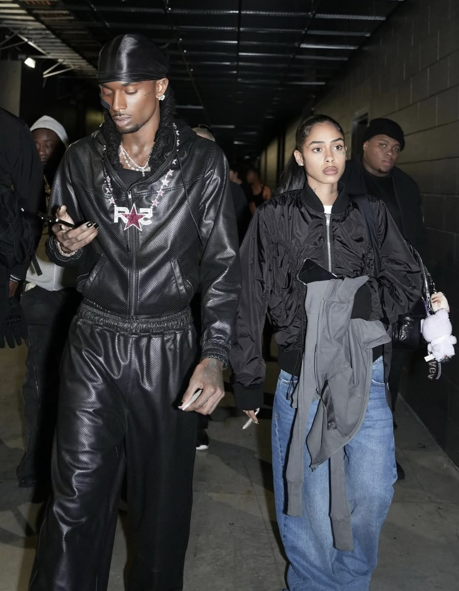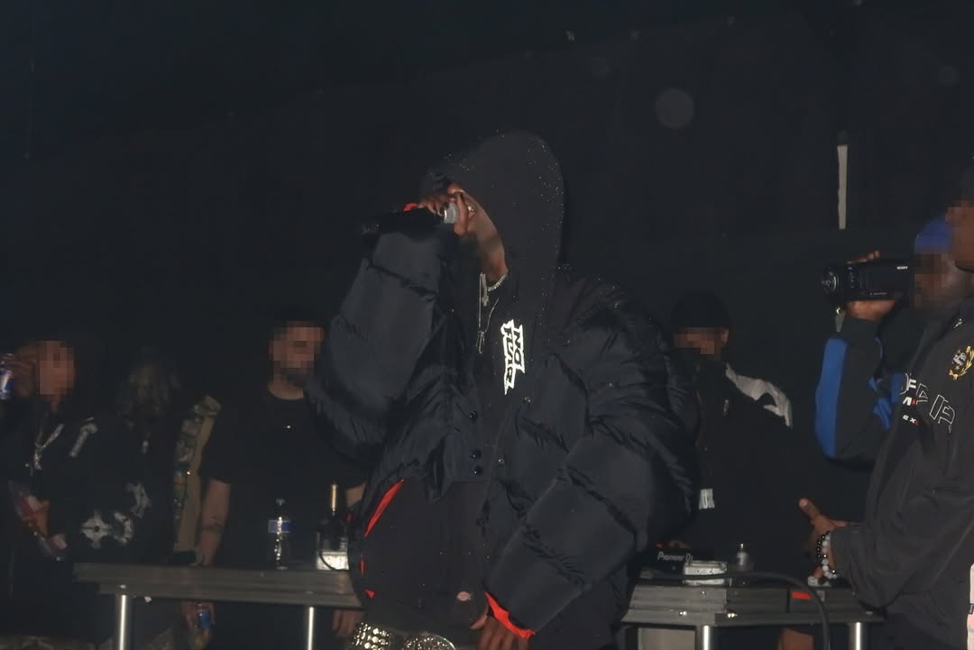 与这件最吸睛外套配套、同样是全孔洞羊皮的皮裤,也被 Carti 成套穿着出现在各种 after party 等私下场景中。此外,No Fear 25 秋冬系列单品,也被 Carti 上身——黑外红内带有专辑标识的短宽阔型羽绒服、印有反光条 No Fear 标识的帽衫,在暗黑神秘氛围中加入了些许恰当的反叛活泼。