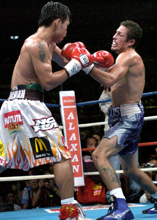 不光越野摩托车,在千禧年初的拳击擂台赛上,年轻的拳王帕奎奥,也多次穿着 No Fear 的短裤、头巾等服装配饰「血洒赛场」。