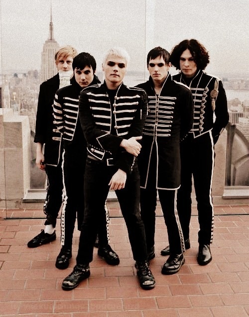 再到 2000 年代,《The Black Parade》专辑时期的 My Chemical Romance 则彻底把拿破仑夹克重新定义,成员身穿黑底银线的统一制服给人们留下深刻印象,同时也塑造了一种极具戏剧性的浪漫表达。