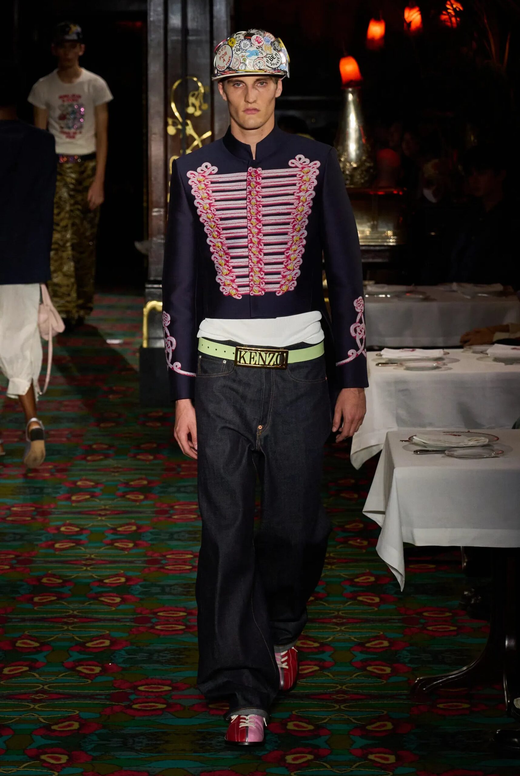 男装部分——Enfants Riches Déprimés 在 2026 春夏系列中带来了更具结构感与成熟气息的轮廓,将拿破仑夹克以长大衣呈现,配以珠宝纽扣的奢华细节;NIGO 在新一季的秀场上以拿破仑夹克向披头士乐队的标志性专辑《Sgt. Pepper’s Lonely Hearts Club Band》致敬。