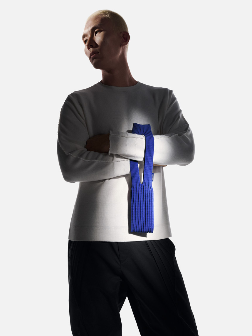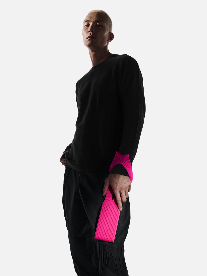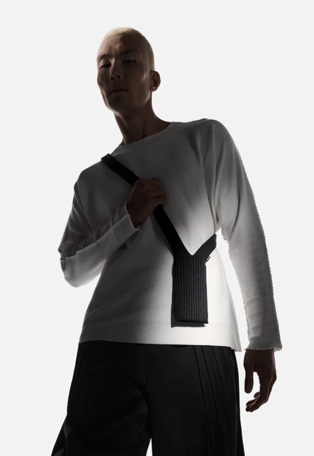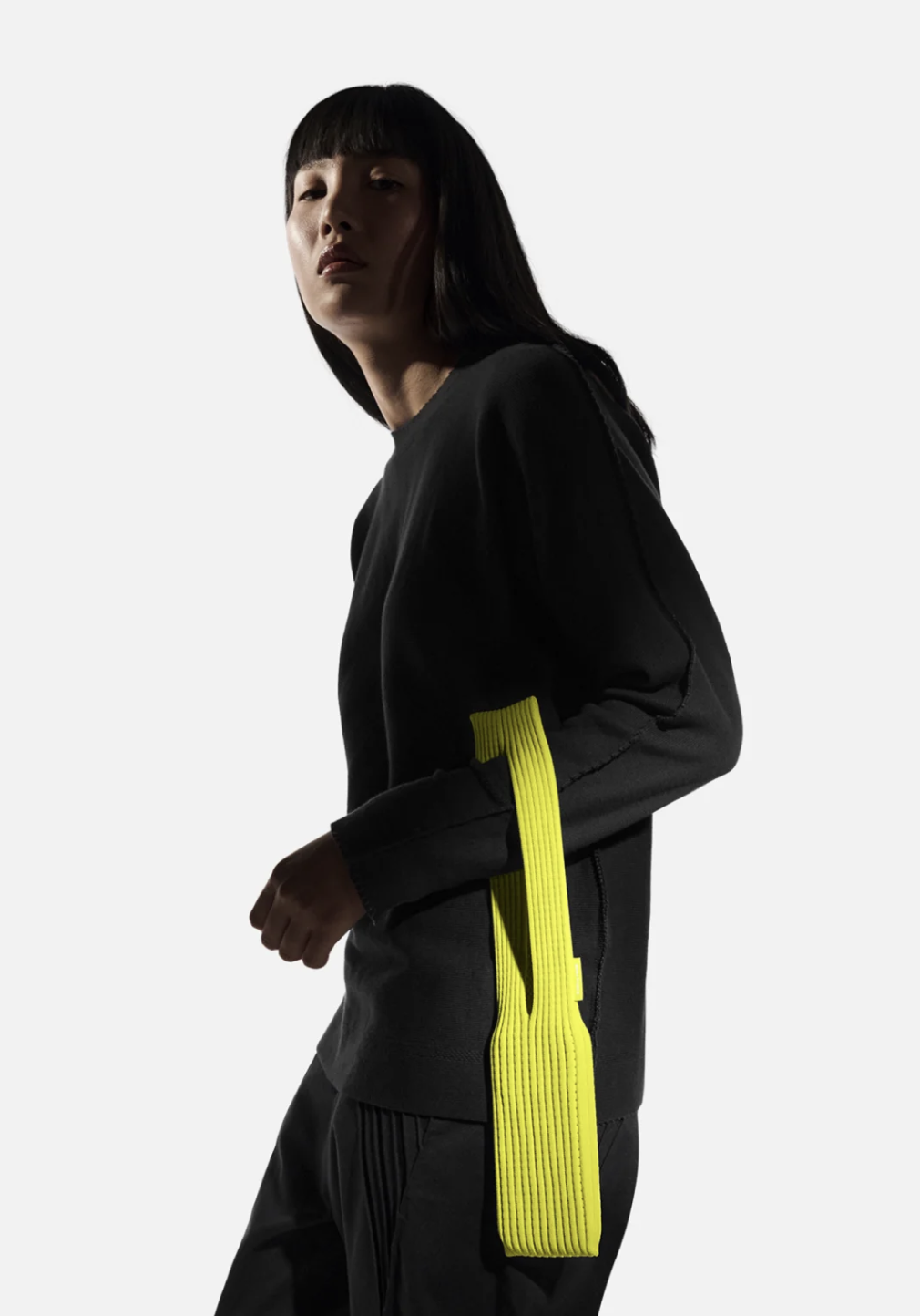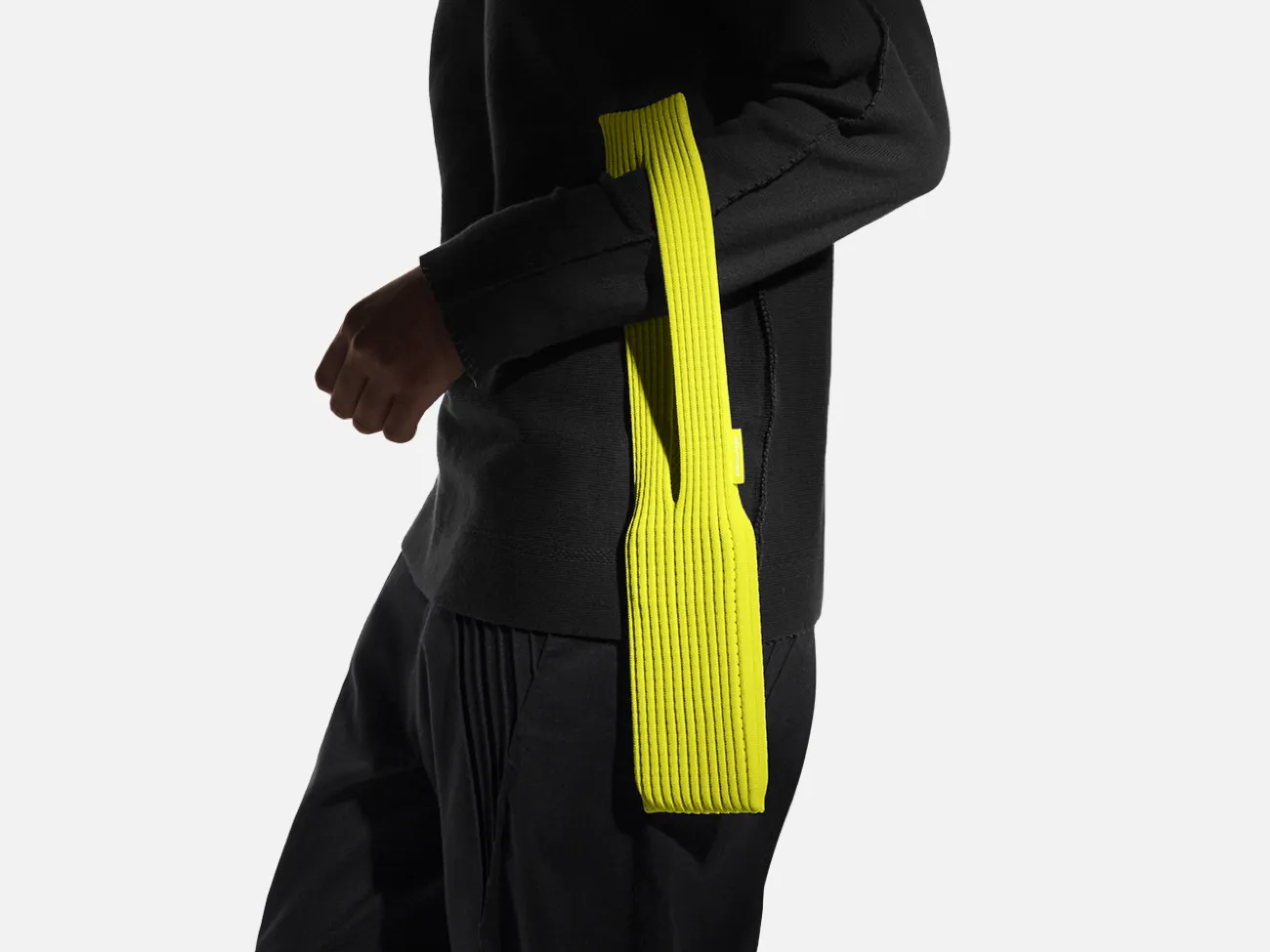 不过,抛开它作为官方定义的「手机收纳袋」的功能不谈,我的关注点更多在于其作为「身体配饰」的价值。理性来看,它确实拥有一些吸引我个人的设计元素: ISSEY MIYAKE 标志性的 3D 针织结构和质感,以及荧光色系。对于喜欢穿一套深色的我来说,或许能增加一个具有设计感的视觉焦点。