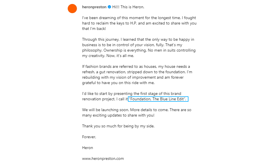 从 2022 年开始,他便不断尝试从 NGG(New Guards Group)手中收回 Heron Preston 品牌的所有权。过程比外界想象得更曲折:NGG 在 Off-White™ 时代经历了巨额商业化扩张,再之后又被 Farfetch 收购,资产不断冻结、整合、重组,管理层经历过多次更迭,NGG 旗下多个品牌被纳入更大规模的企业运营体系,各类权益被锁在法律架构内。