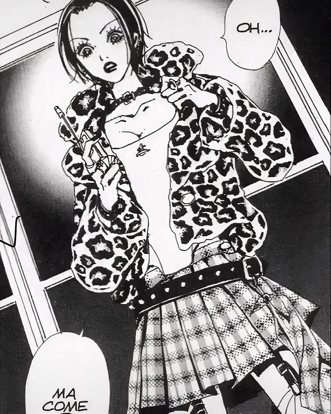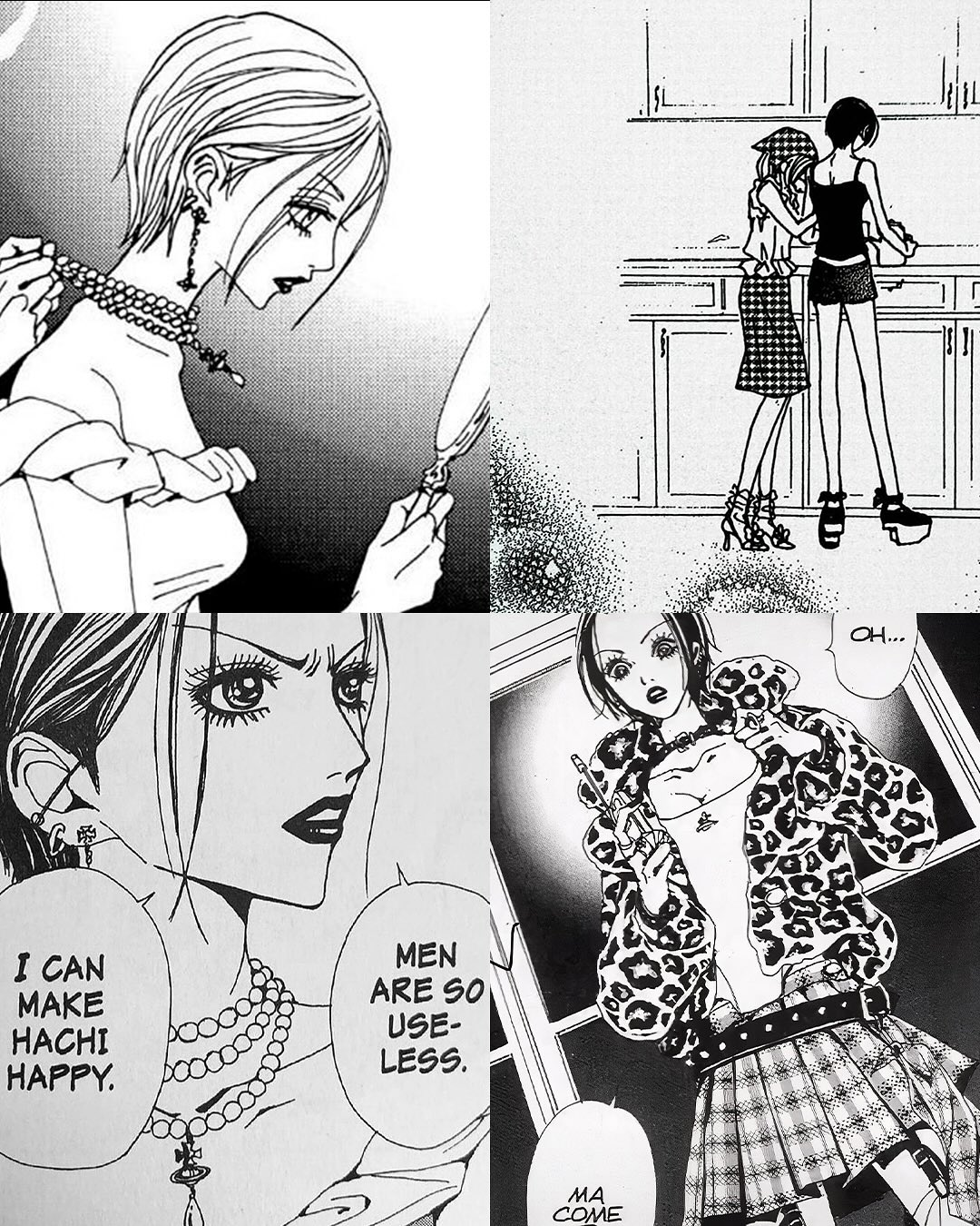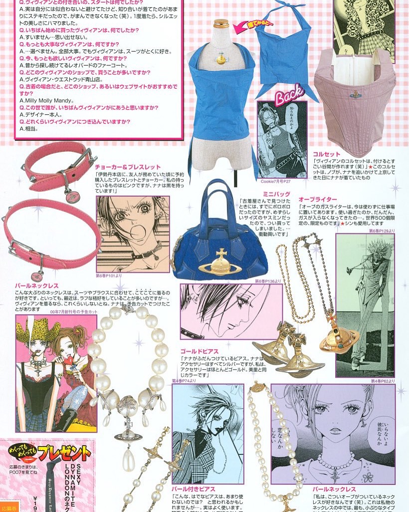 作为 Vivienne Westwood 的忠实粉丝,矢泽爱提到自己在 90 年代末期经常频繁前往代官山与表参道的店铺,这份个人审美喜好最终全部注入作品之中,在创作时她几乎是以西太后的美学来构建角色的时尚体系,核心人物的造型也几乎是对自身审美的一种延展,而不是简单借用「朋克」这一流行标签。