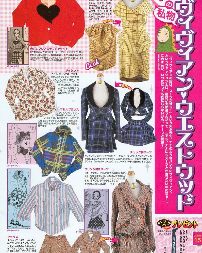 除了胶囊系列中的单品外,大崎娜娜不仅在漫画中十分偏好苏格兰格纹的褶裙与利落的西装外套,也常穿着受 Westwood Mini-Crini 裙撑设计启发的紧身胸衣,以及有维多利亚时代结构感的小型蓬裙等单品,实际上很多单品几乎都能在现实中找到原型。