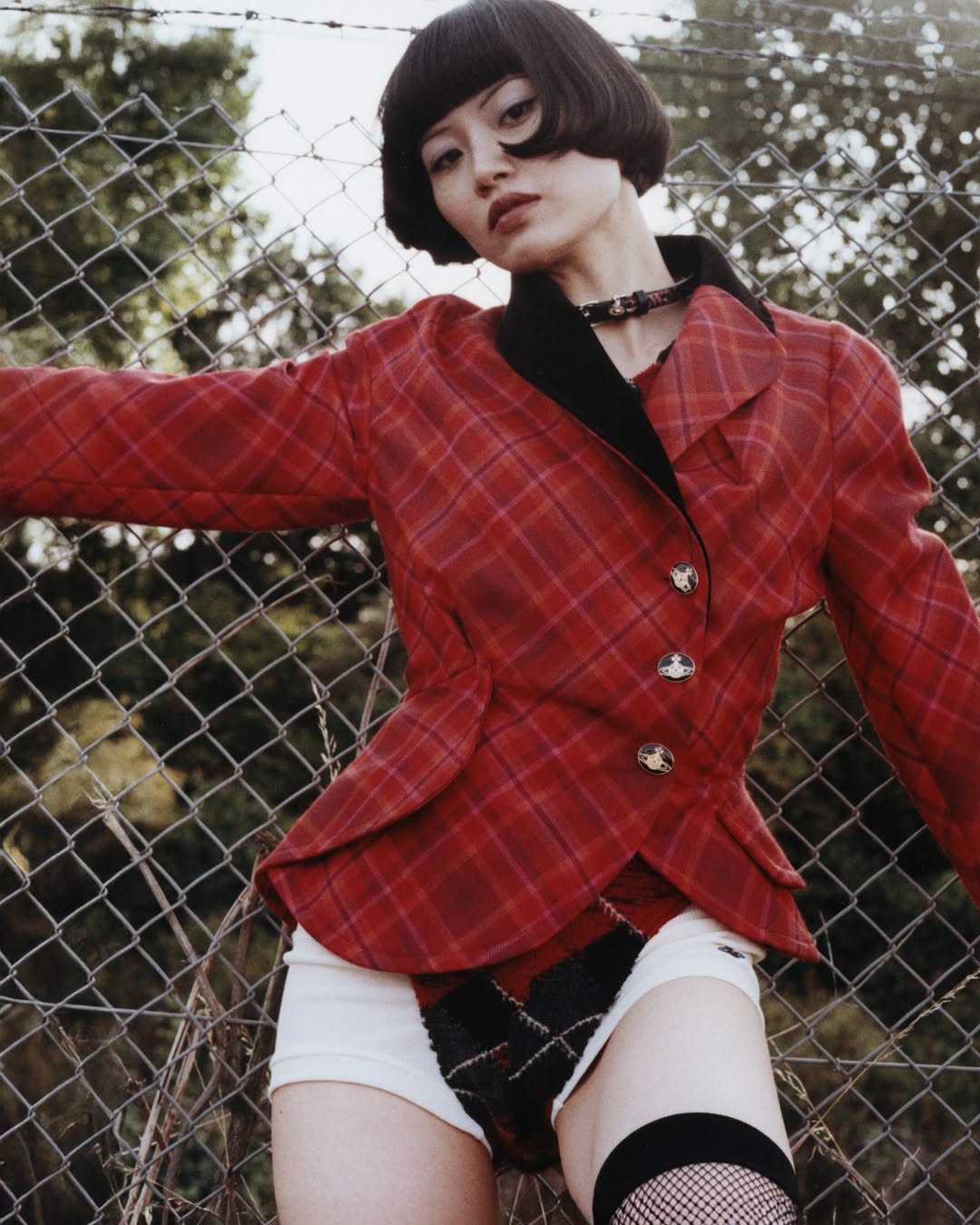 一些单品也以合作契机直接致敬了西太后的 archive 设计,例如格纹 Stormy 夹克是源于品牌 1996/97 秋冬「Storm In A Teacup」系列的经典款式。标志性的 Rocking Horse 厚底鞋也在漫画与动画中频频出现,来自于品牌 1987/88 秋冬的「Harris Tweed」系列,还有大崎娜娜演出上身的那件「Milky Way」T 恤,最早在 1990 年推出。