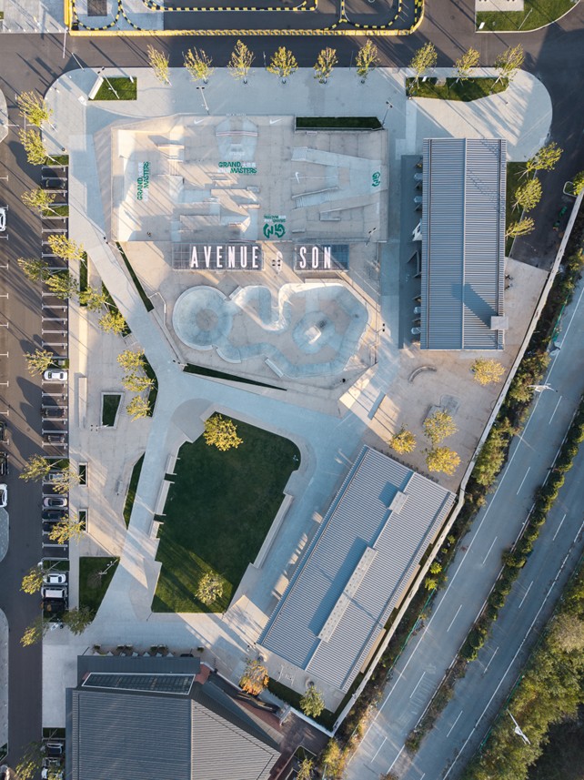假如你从空中看滑板公园,会看到一个明显的「向心结构」:专业街式场地、初级练习区、室内滑板场和舞蹈房、大道之子零售店、儿童区、居民休闲区,所有这些,都是围绕绿芯排布。