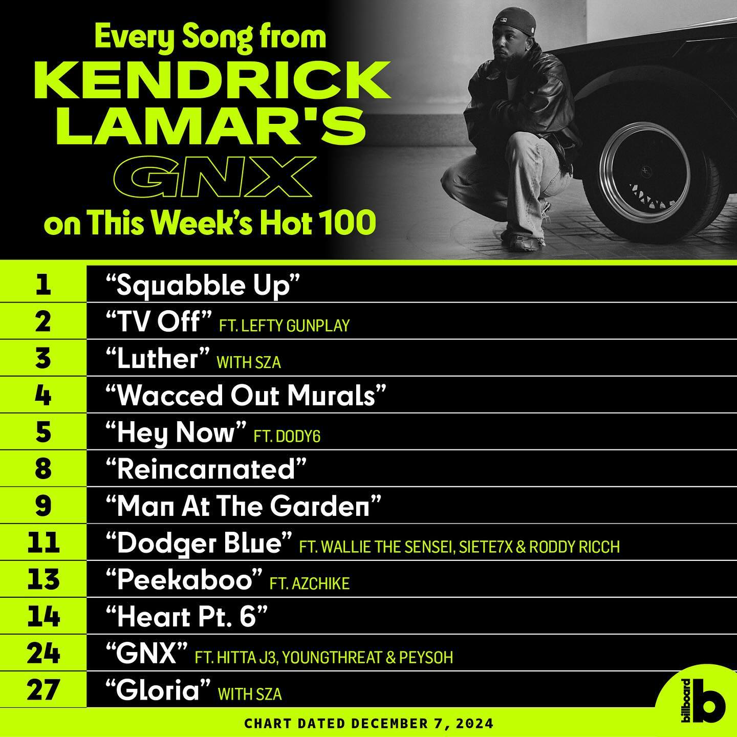 《GNX》在 2025 年初因 Super Bowl 表演的宣传与实体发行推动,再次冲回 Billboard 200 第 1 名,并一度使 Kendrick 成为首位同时有三张专辑进入 Billboard 200 前 10 的说唱艺人(《GNX》+两张旧专辑同时上榜)。单曲也表现强劲——多首歌冲入 Billboard Hot 100 前五,其中「Squabble Up」「Luther (with SZA)」为主打。整张专辑曲目几乎全面冲击主流流行榜。