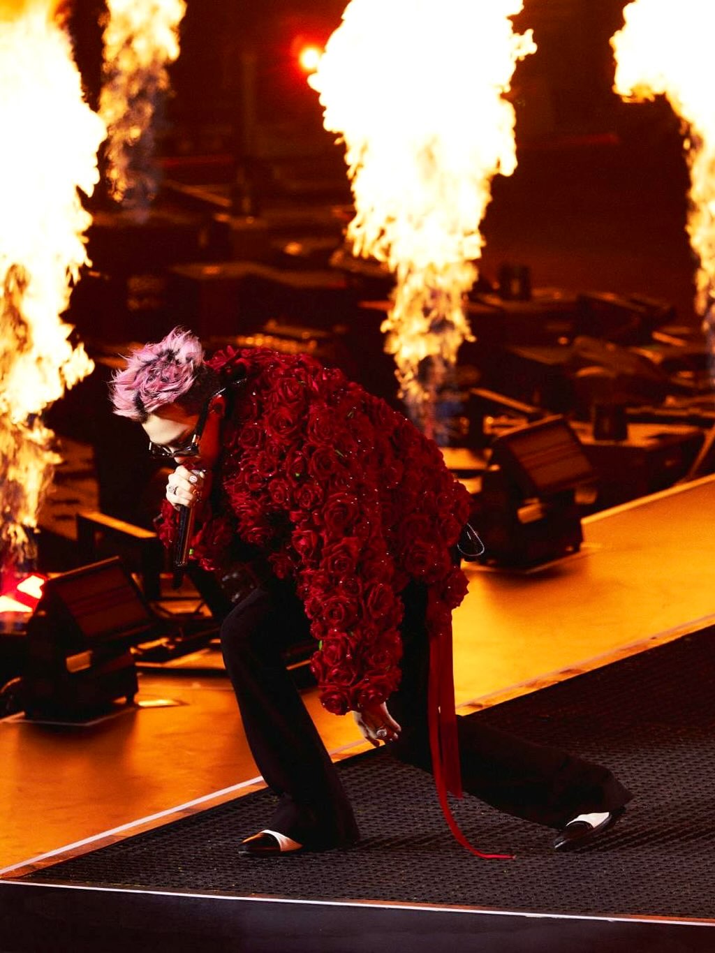 舞台上的 G-DRAGON,依然具备极强的控场能力——什么时候该把麦克风交给观众,什么时候该用肢体和灯光制造情绪峰值,他依然非常清楚。