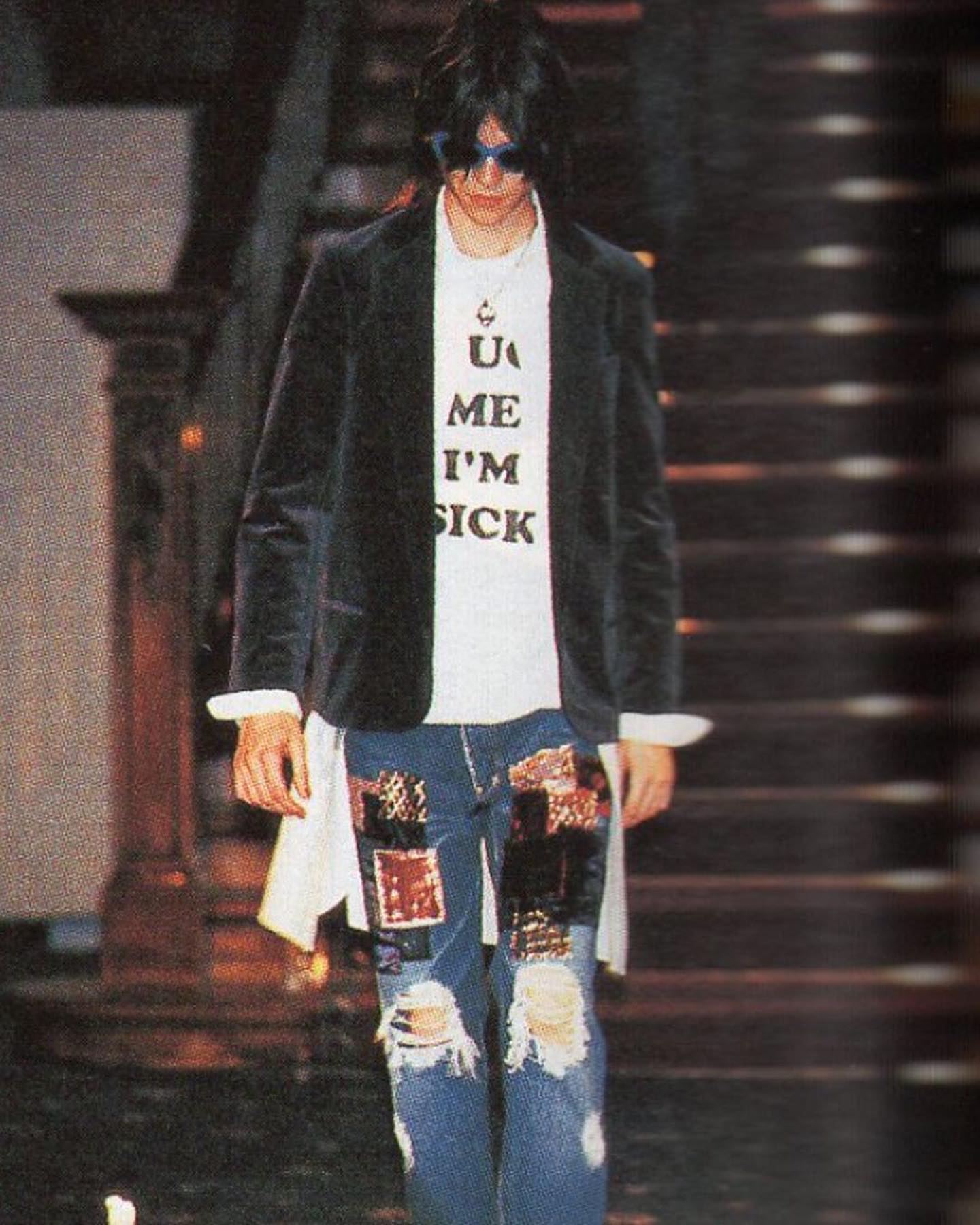 这个系列诞生于宫下贵裕深入研究了 Kurt Cobain 的衣橱和精神状态的背景,但不是简单的款式模仿,而是将垃圾摇滚的粗粝与日式设计精细剪裁和概念化叙事相结合。回顾这个系列的秀场,T 台上充斥着 Kurt Cobain 的符号:不同的图案印花,以及散落在服装上的语录和对 Nirvana 歌曲的微妙暗示。