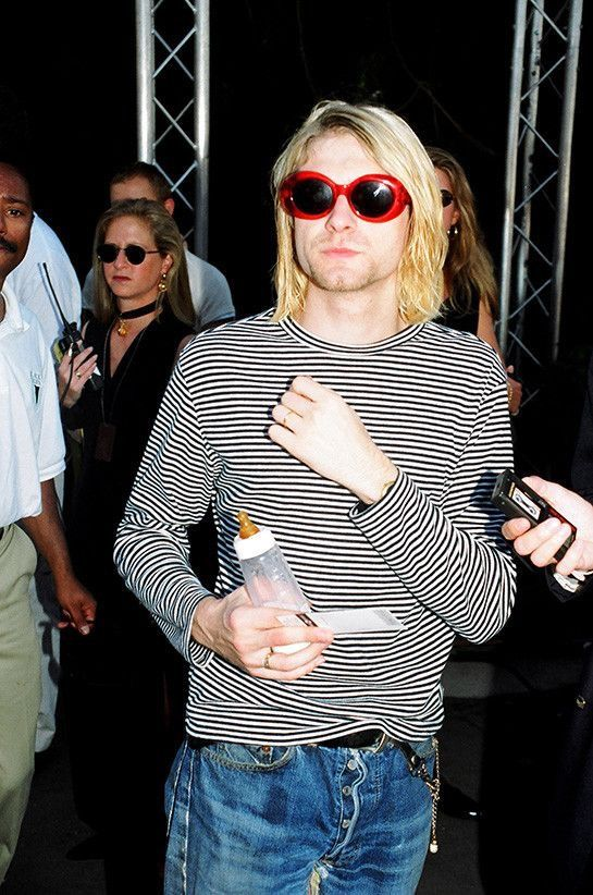 1993 年 9 月 MTV Video Music Awards 颁奖典礼,Kurt Cobain 无视了红毯严格的着装规范,选择了一件布列塔尼条纹长袖、打补丁的 Levi’s 牛仔裤,以及一副与妻子 Courtney Love 红色口红呼应的红色 Roth 墨镜,这个极具标志性的造型巩固了他作为反主流代表的人设。