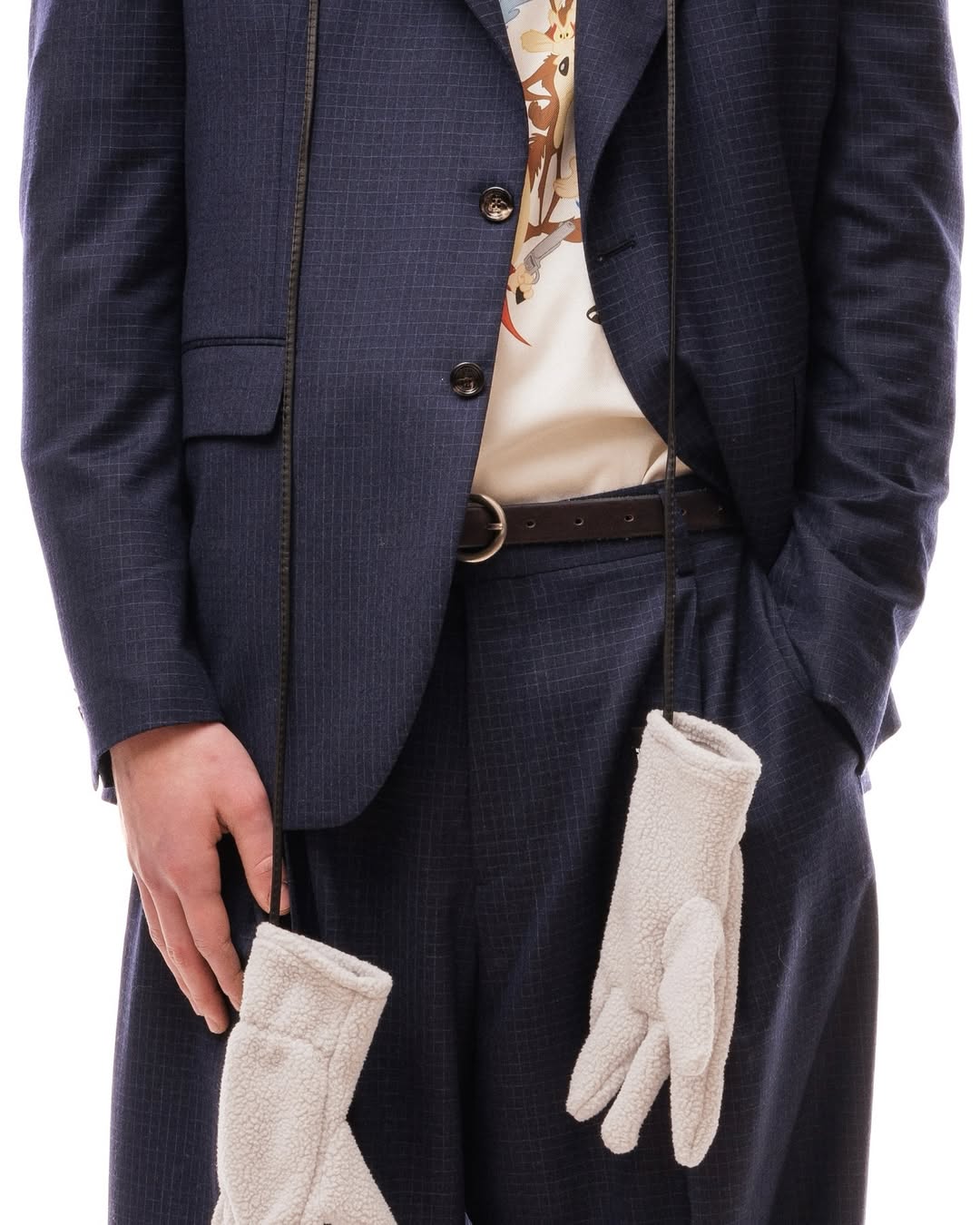 而在服装部分,同样延续了这种工艺导向的设计逻辑:例如融合正装与运动服的套装、带有手工针织和定制纹理的衬衣与传统 Tracksuit、刺绣图案 T 恤,甚至是粗织领带等等。针织单品强调织物纹理本身的表现力,部分服装通过手工缝制或拼接完成,在面料选择和成衣结构上都强调了意大利成衣工艺的影响与运动服功能之间的融合。