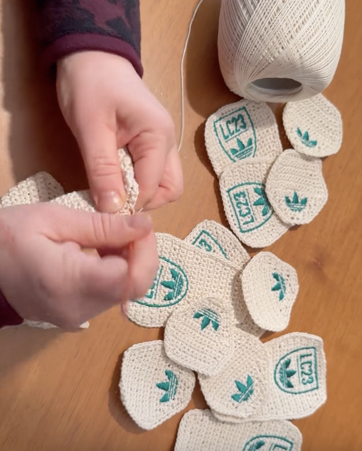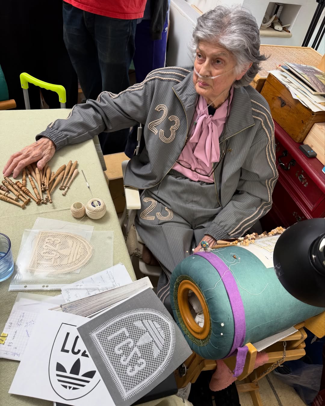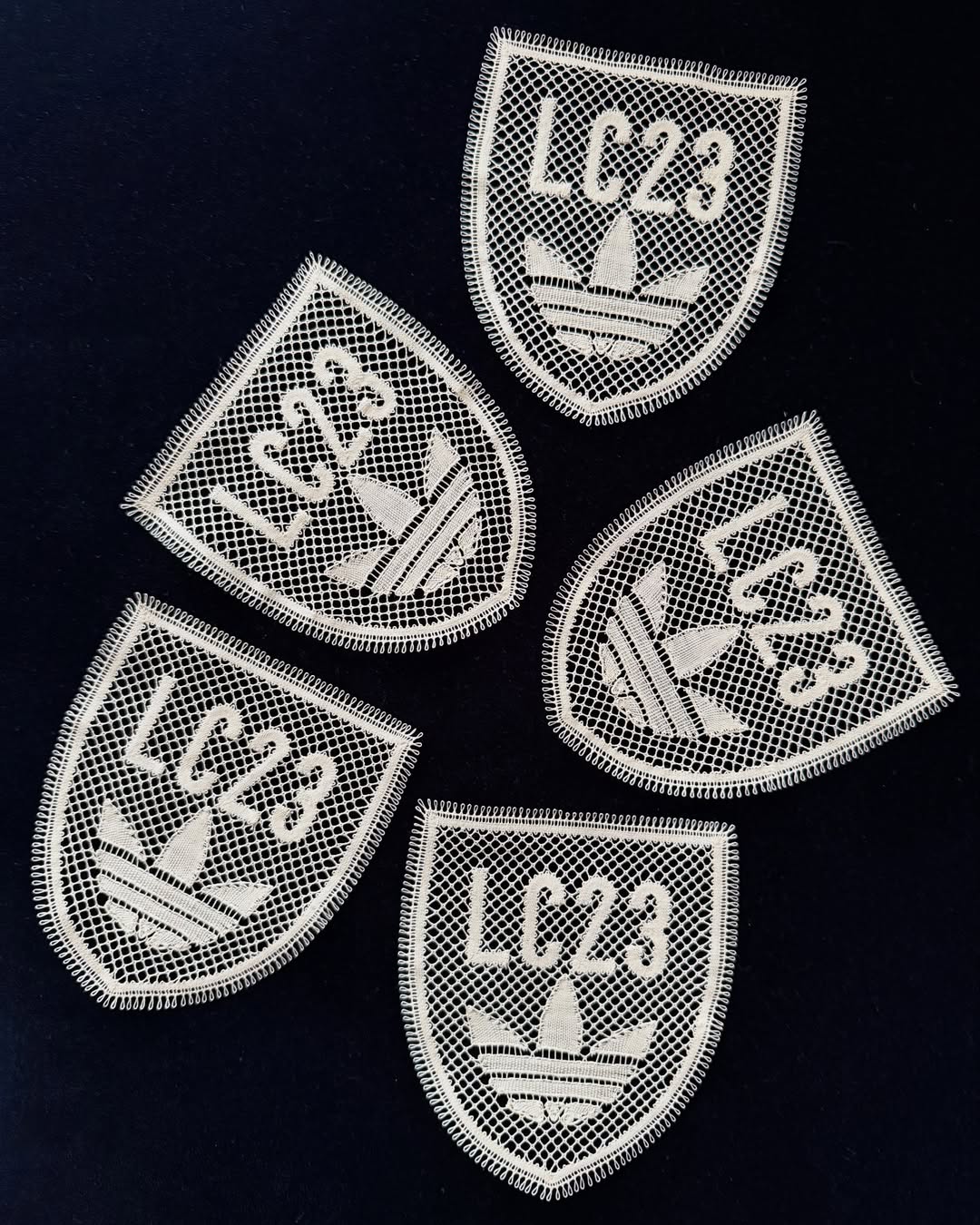 关于这一点,通过 LC23 在社交媒体上发布的制作工艺背后的故事,你就能有更深刻的感受:「Tombolo」是一种极其古老的刺绣工艺,在意大利许多地区代代相传。而在这一次与 adidas 的合作中,实际上是有 Marilena 这种已经头发花白的传奇工匠参与,与几位搭档一起完全手工制作服装上的那些刺绣贴片。而这种工艺连同其他古老的手工艺技法,也是这次合作项目的核心之一,对于 LC23 来说,这些才是代表着真正需要双手倾注情感的作品。