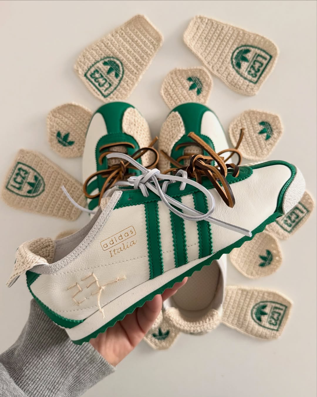从最核心的产品部分来说,围绕着双方最具代表性的特质进行融合与重塑,对于三叶草显然是品牌的运动基因与复古氛围,而 LC23 则是将自身所代表的南意特质和手工艺制作作为核心表达方式之一与之相融合。