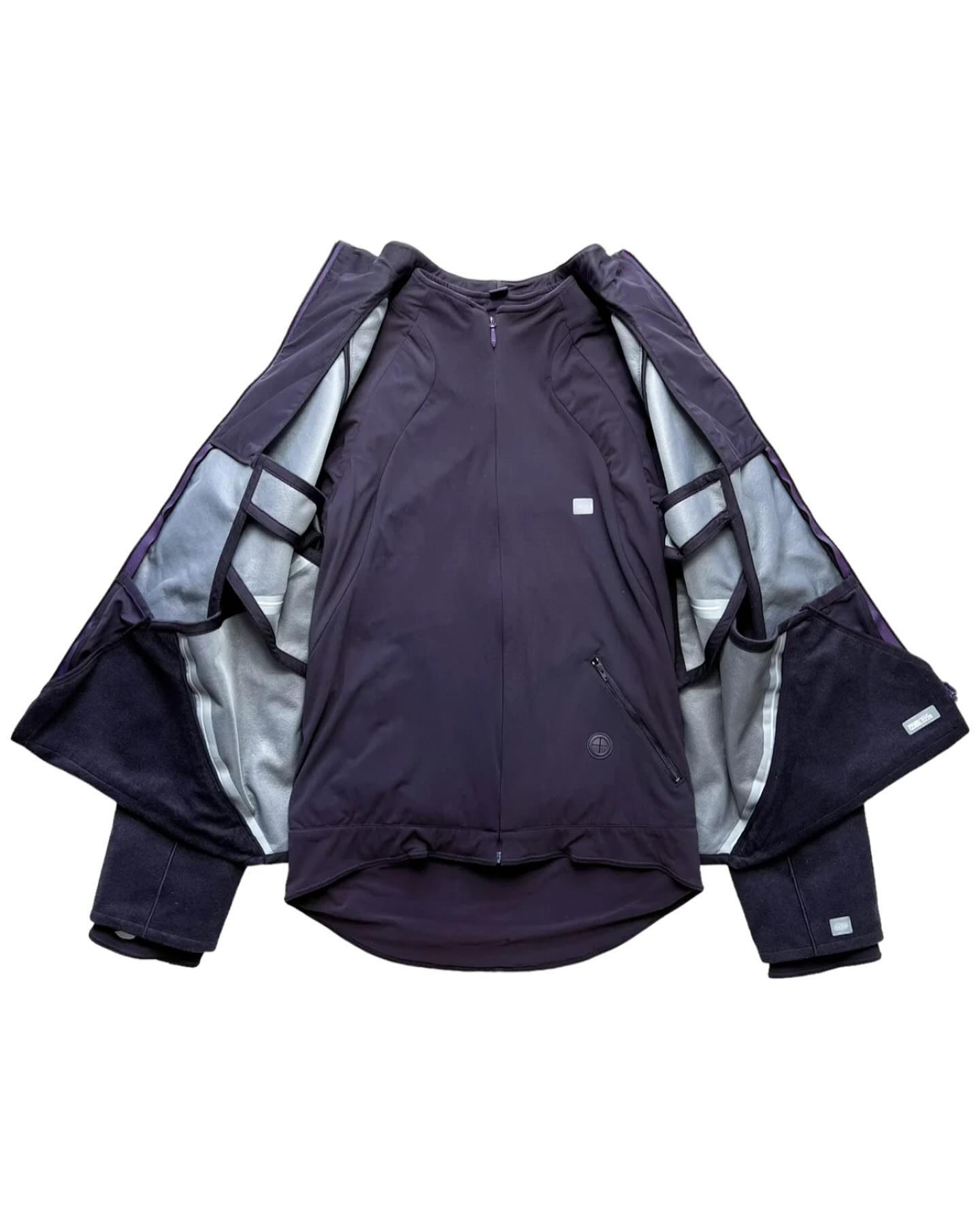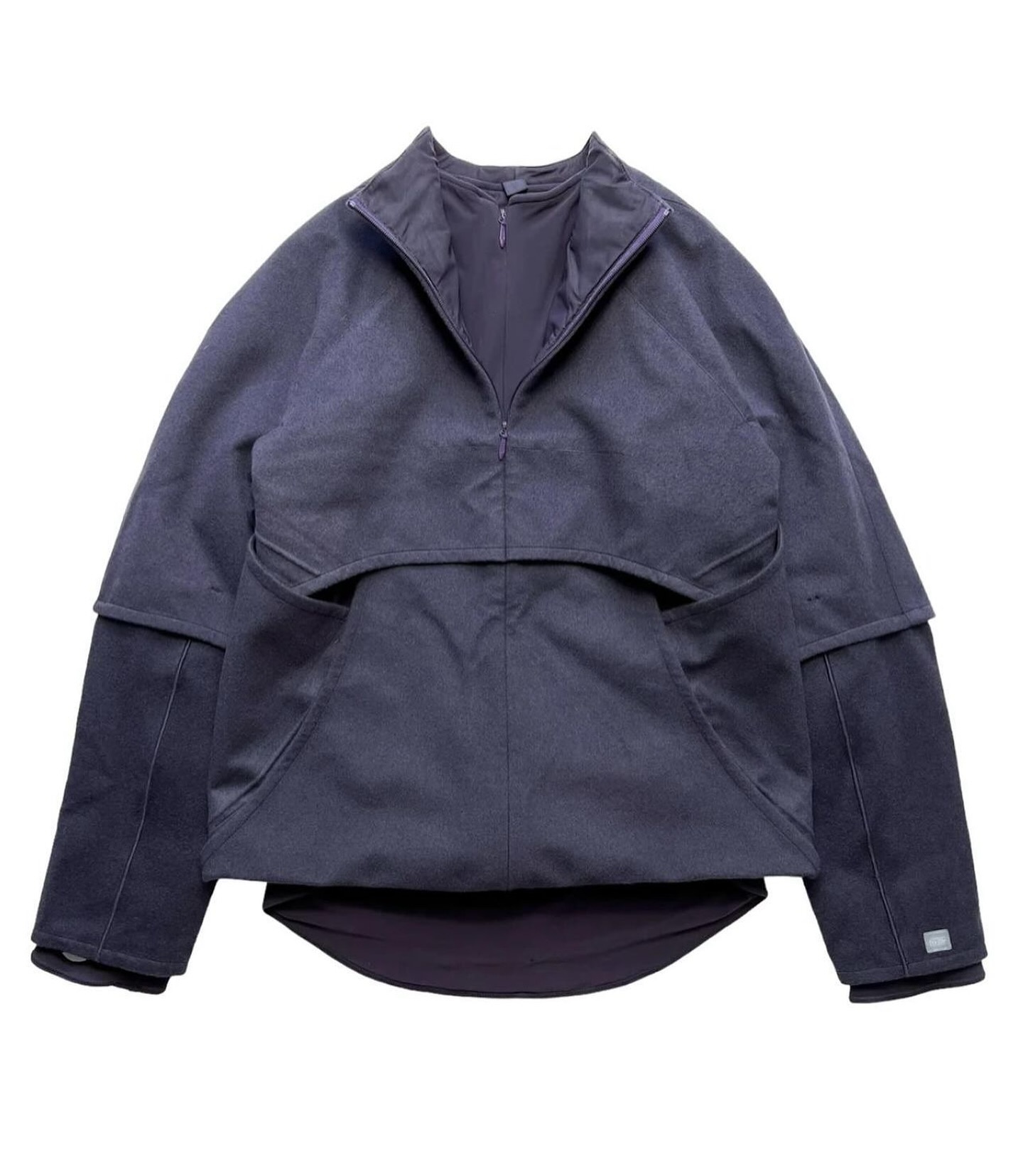 相比于 CODE 的实验单品,Mobius 更具实穿性。而 CODE 系列中那些晦涩的科技细节被整合进更为简洁的服装廓形中。最显著的特征是其标志性的复杂版型切割,例如袖子肘部的铰接式开口,前长后短的异形剪裁,配合后背的三角拉链网眼结构,使服装在视觉上呈现出一种类似「反穿」的未来感。同时,为了配合更好的身体运动,夹克通常还搭载有线耳机的出线孔。