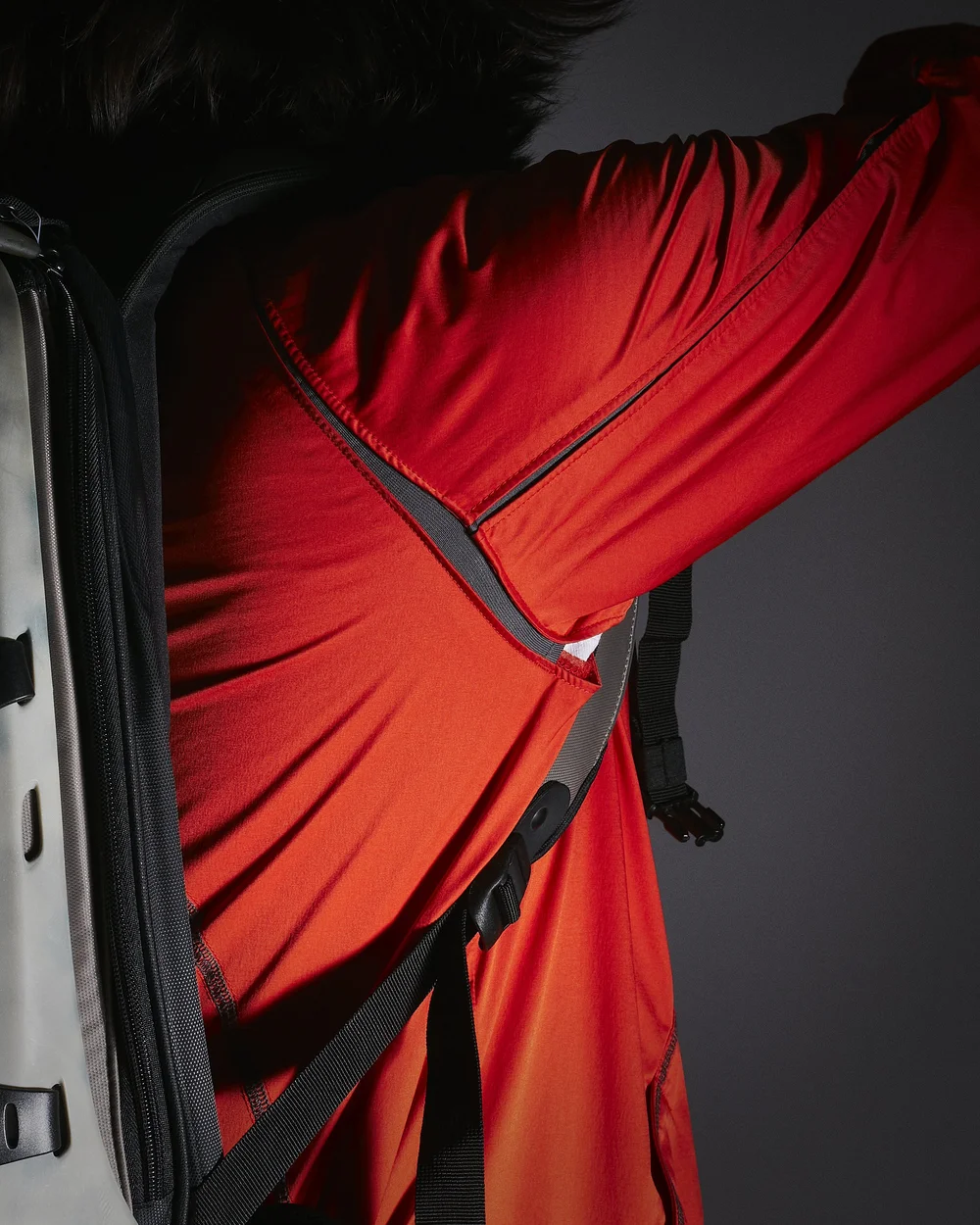 Mobius 的名称直接源自「Mobility」(流动性/移动性),其设计核心依然围绕着人体工学。虽然它在面料选择上稍显内敛,多采用尼龙与合成纤维替代 CODE 的昂贵面料,但完美保留了 CODE 的视觉语言。