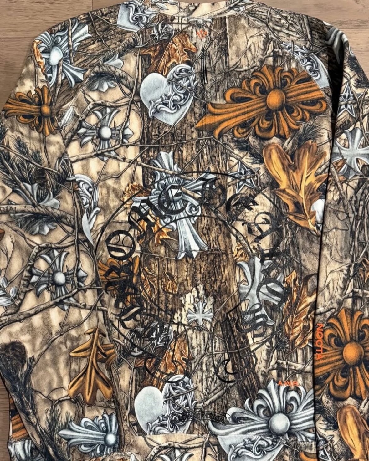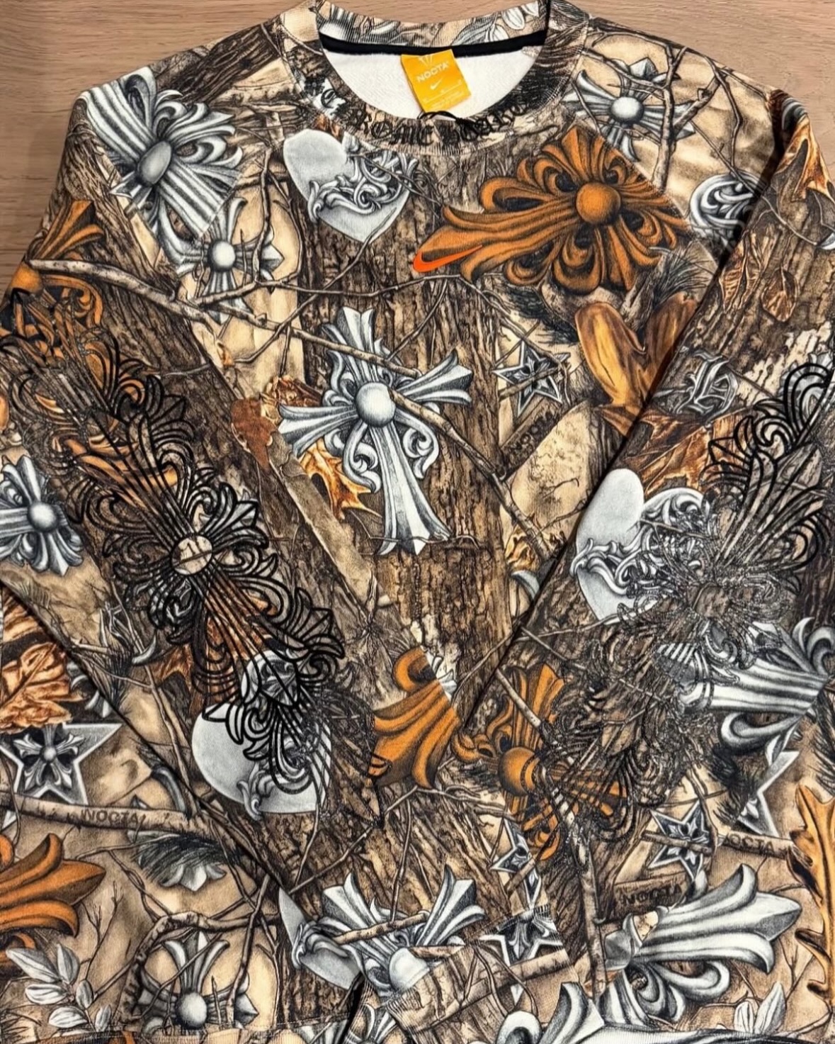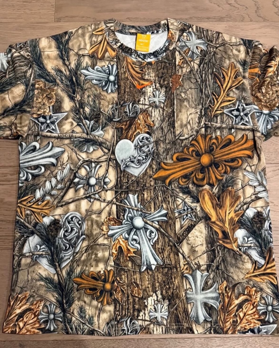 NOCTA 与 CHROME HEARTS 的连接,虽然没有被包装成一次夸张的跨界,官方的宣发显得异常低调,但系列中的灵魂单品羽绒外套定价高达 39,000 美元,表面以特别订制的 Realtree 迷彩为基底,全面转化为 CHROME HEARTS 标志性的十字图腾,外层采用顶级意大利皮革压纹雕刻,搭配纯银匕首拉链与满布十字的金属钮扣,细节极致繁复,堪称「投资等级」单品。NOCTA 因此蒙上一层高端奢侈化的色彩,这为品牌的日后发展或拓展增添了一条可能的道路。