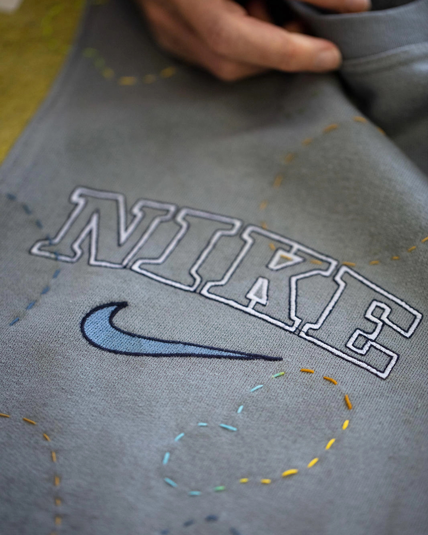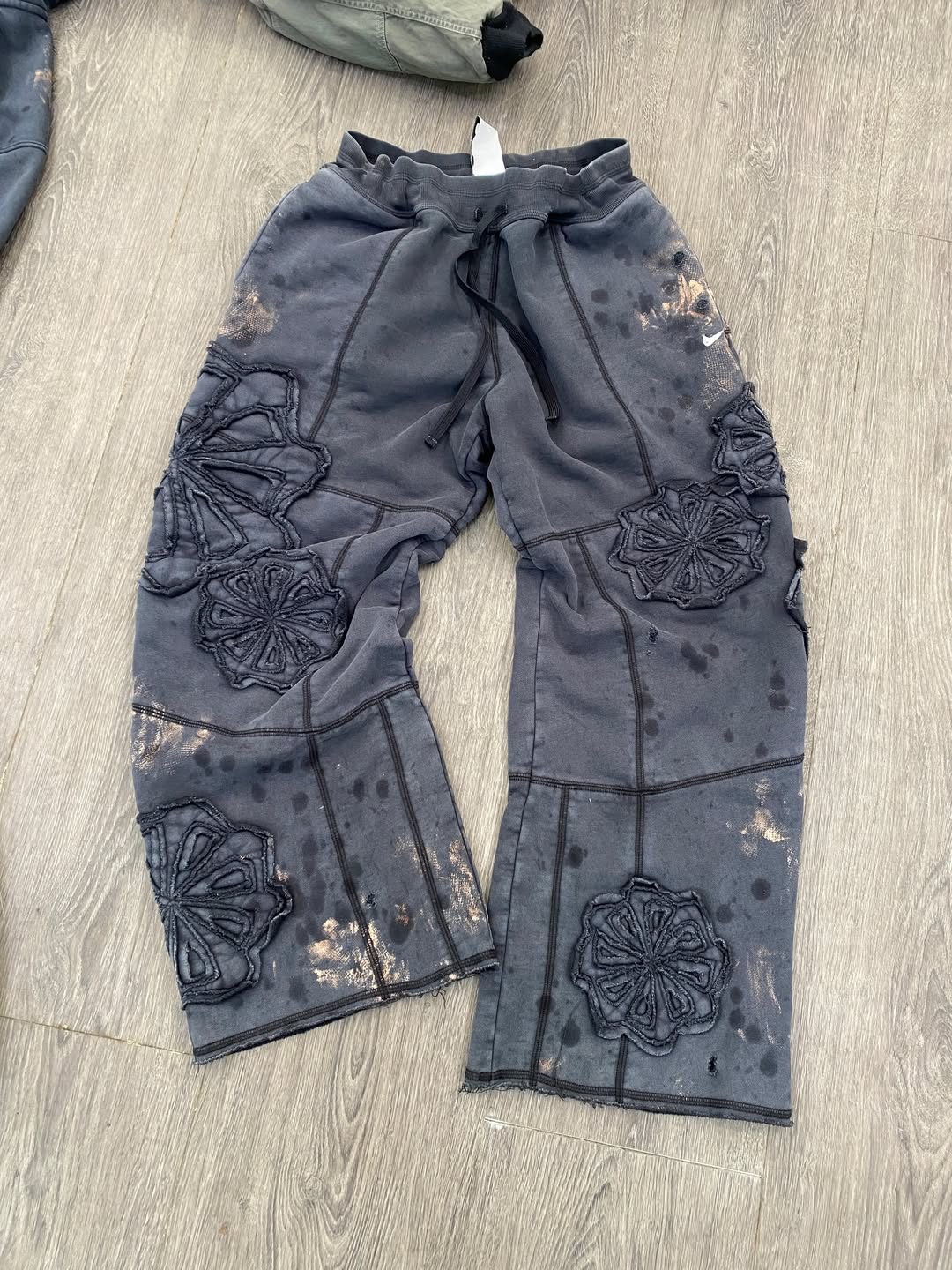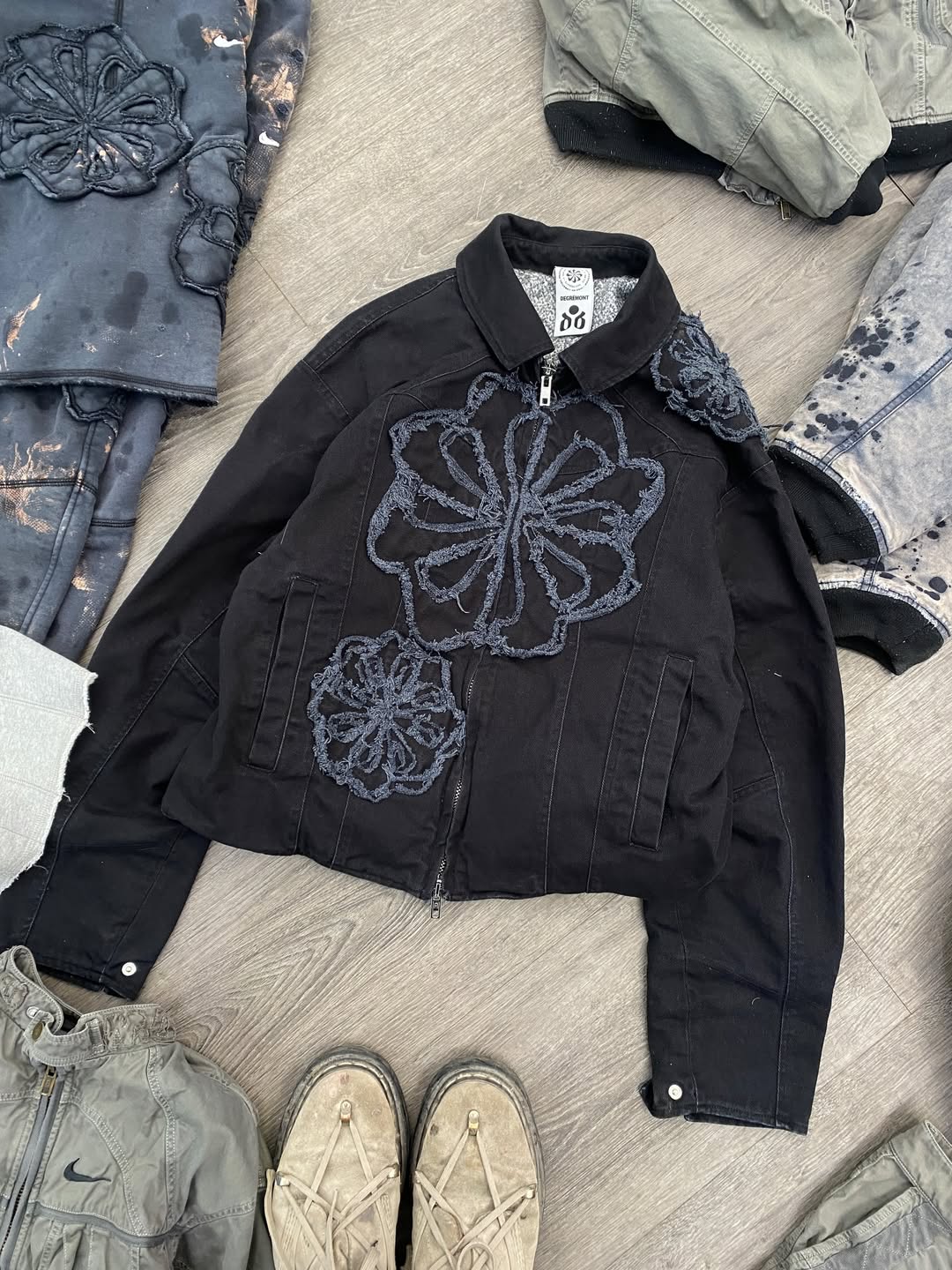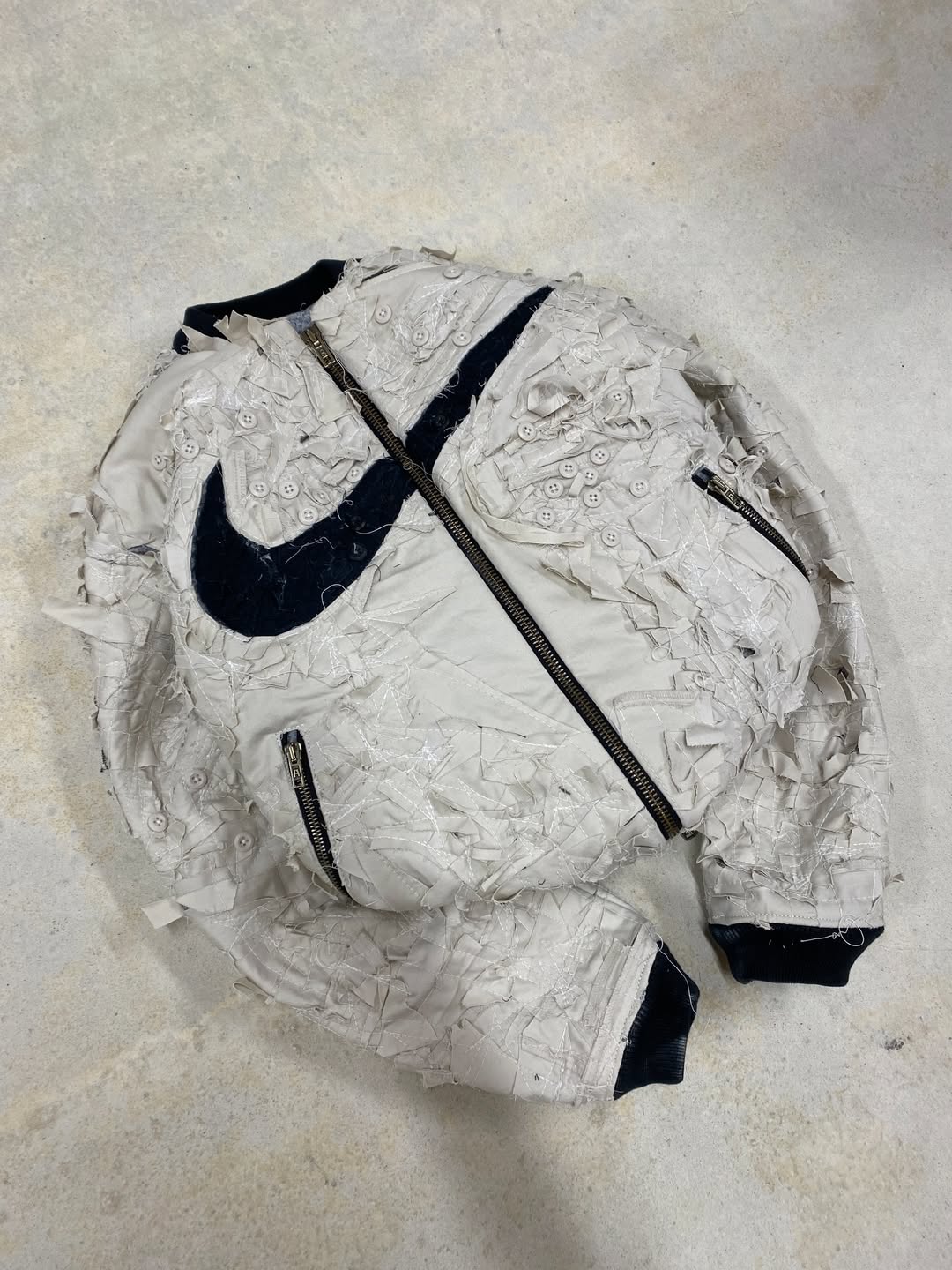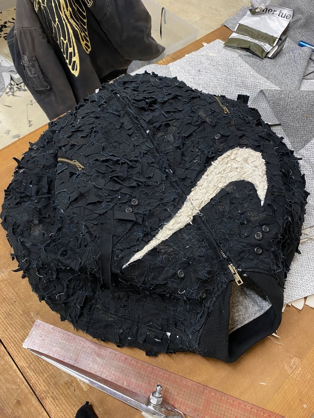 不难看出,设计本身仍然是围绕 remake 的概念展开,但过程中大量利用了 Nike 既有的旧库存与生产废料作为此次创意的核心重点。Degrémont 在自己社交媒体上展示出了一些设计过程,可以看到他通过对这些原本废弃布料的细分、切割与缝补,再重新组合成为完整设计的细节零部件。