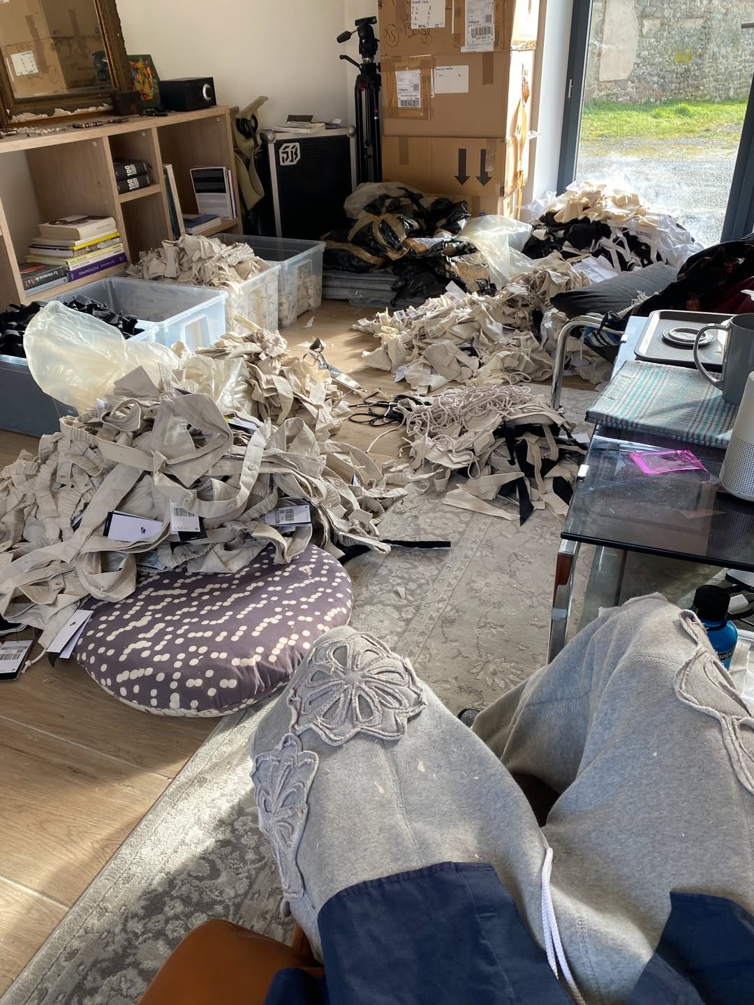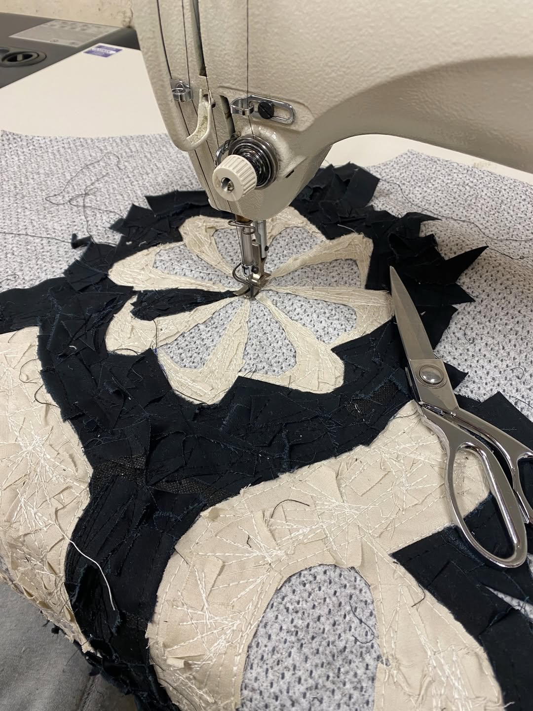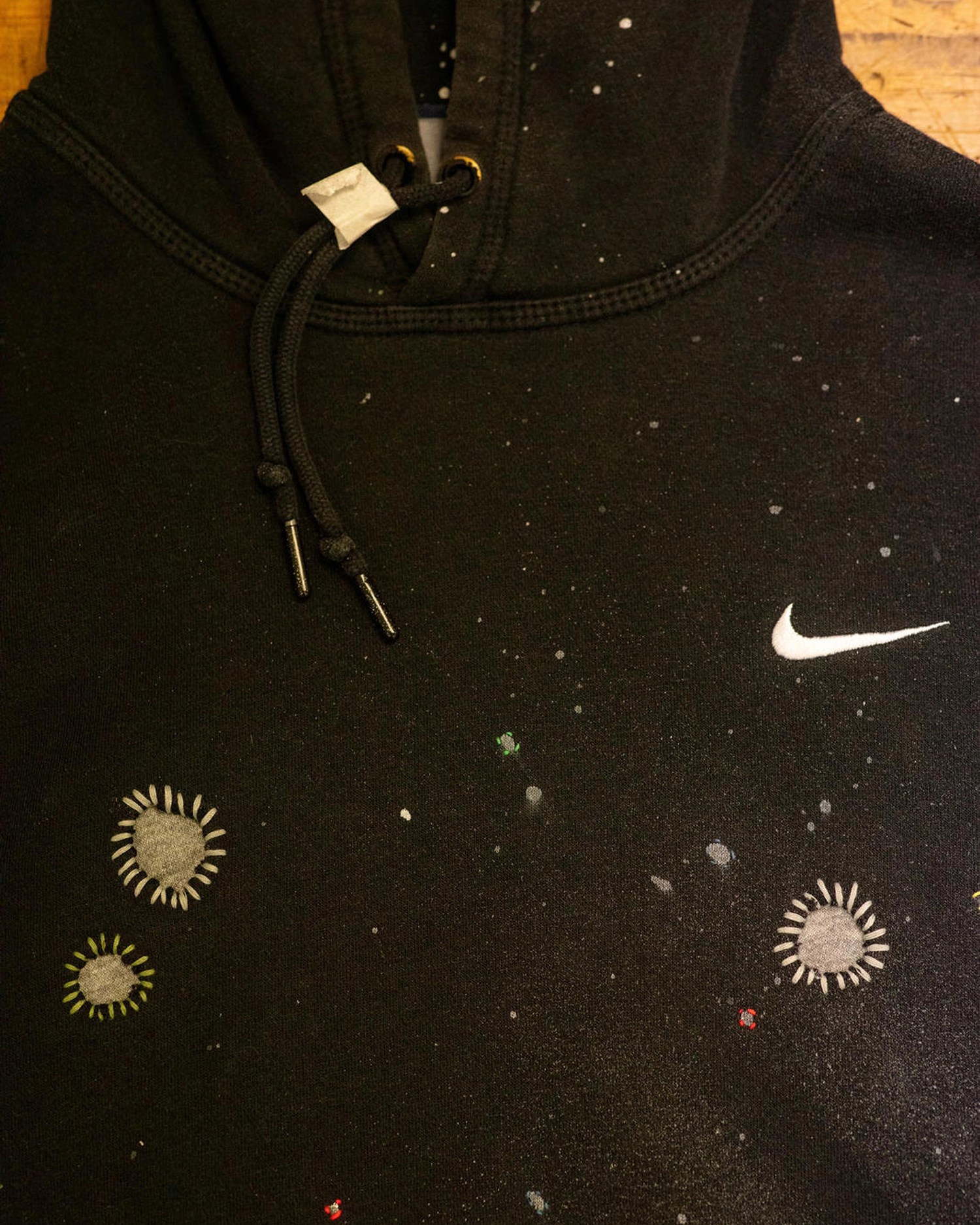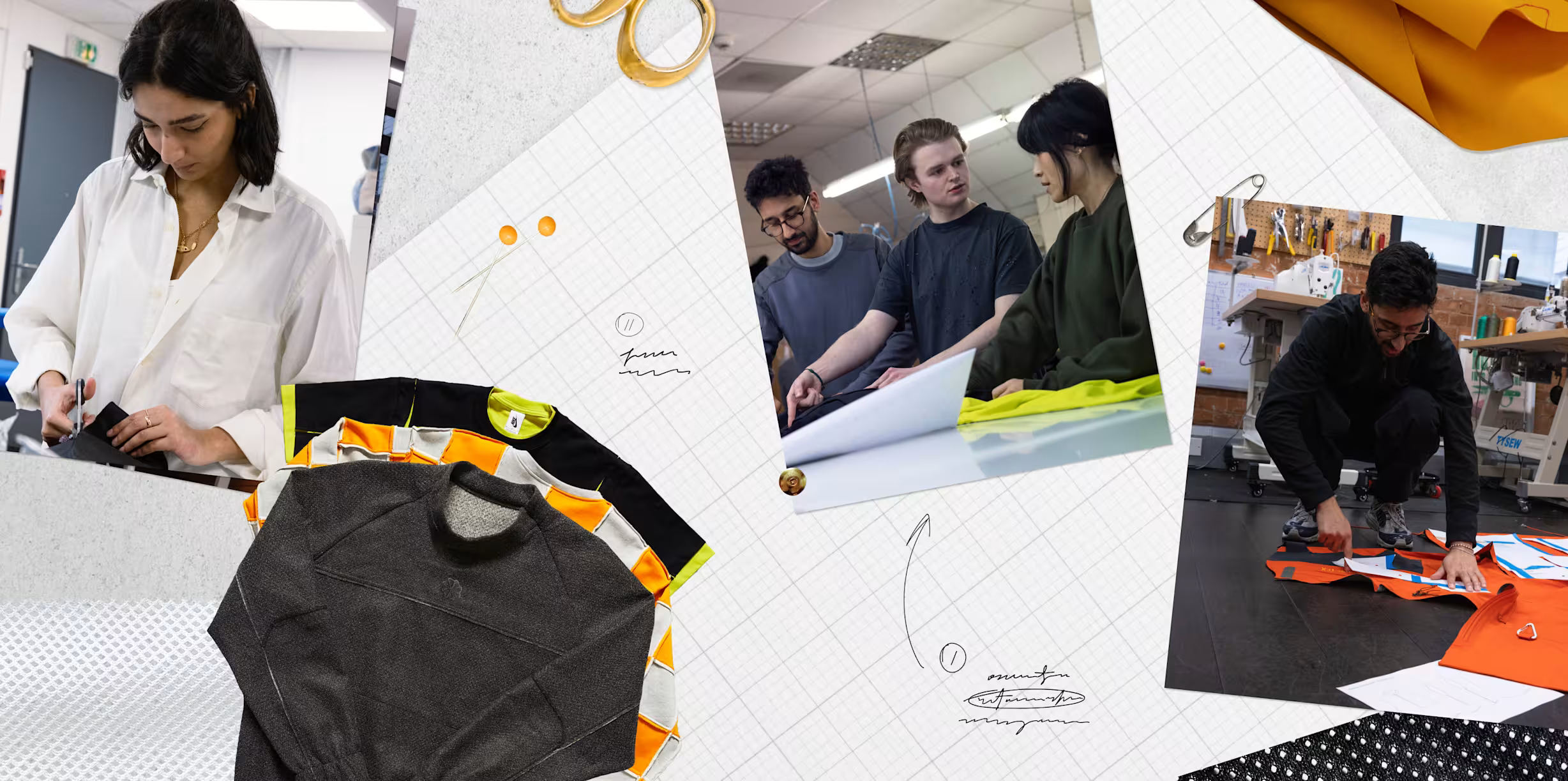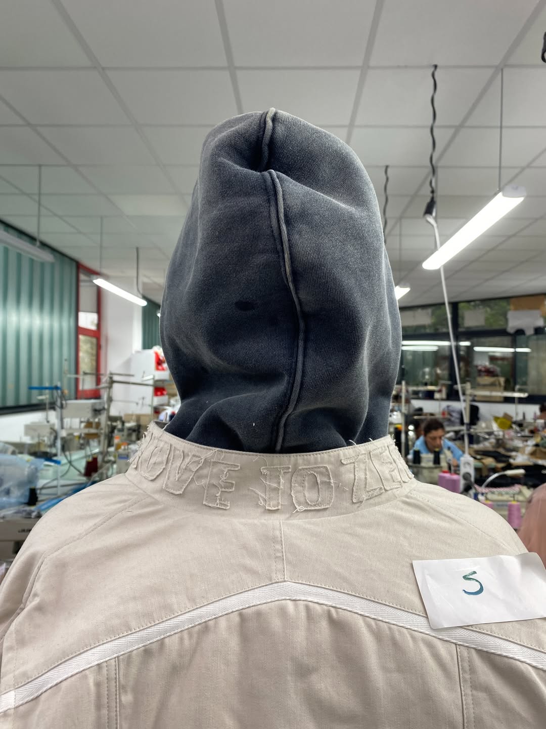 不难看出,设计本身仍然是围绕 remake 的概念展开,但过程中大量利用了 Nike 既有的旧库存与生产废料作为此次创意的核心重点。Degrémont 在自己社交媒体上展示出了一些设计过程,可以看到他通过对这些原本废弃布料的细分、切割与缝补,再重新组合成为完整设计的细节零部件。