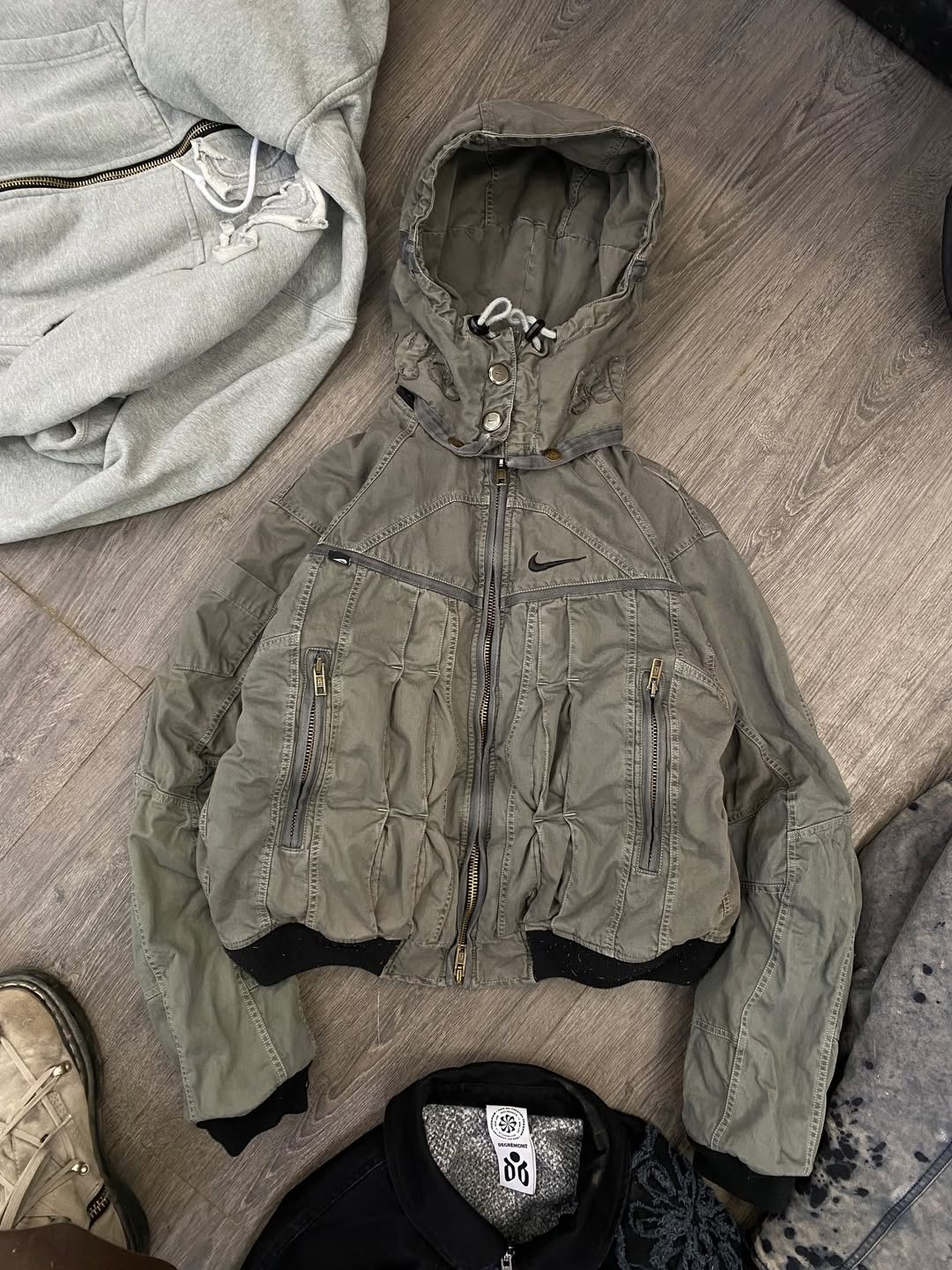 此外在 Bodega 上架的 UTOPIA 合作系列中,Peder Cho 展示了他对功能性材料的实验性探索,包括裁剪利落的短款羽绒背心、带有模块化拼接结构的外套,以及特殊结构和功能性的手提包与配件。Nike 标志性的 Tech Fleece 套装在改造中被彻底重构,通过更宽松的比例、更复杂的拼接方式,以及对轮廓的重新拆解,转化为一种介于机能服装与实验时装之间的新形态。
