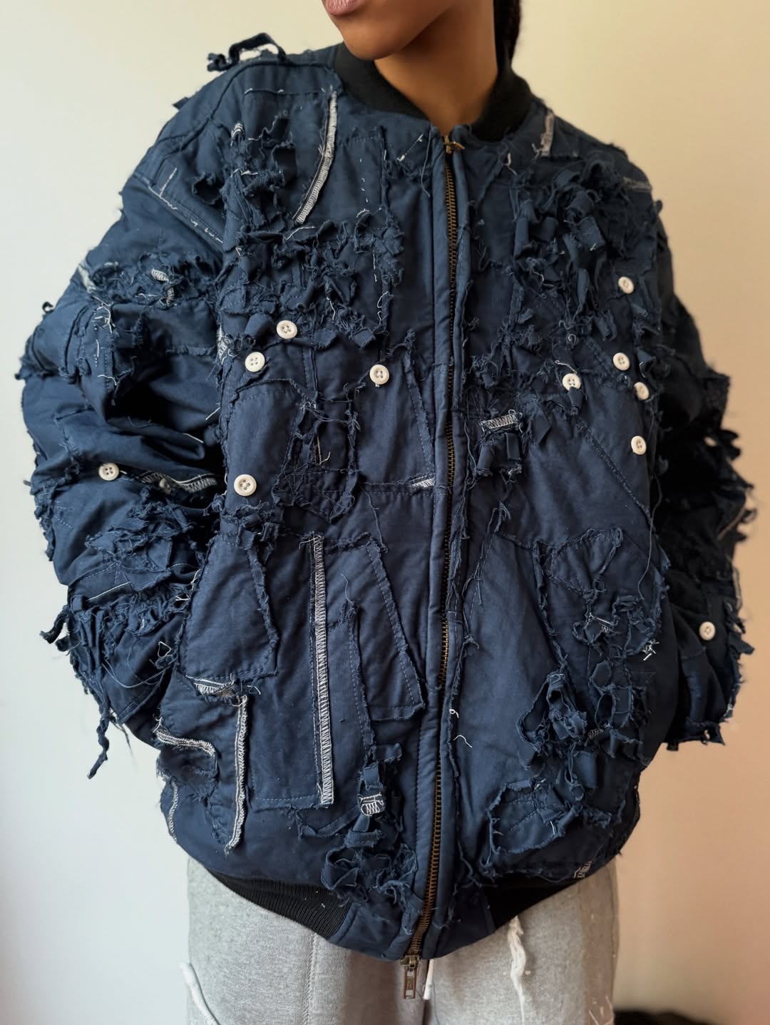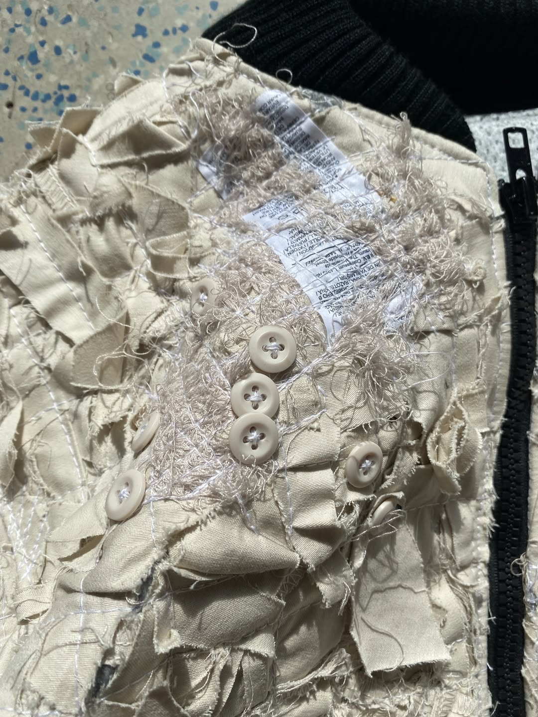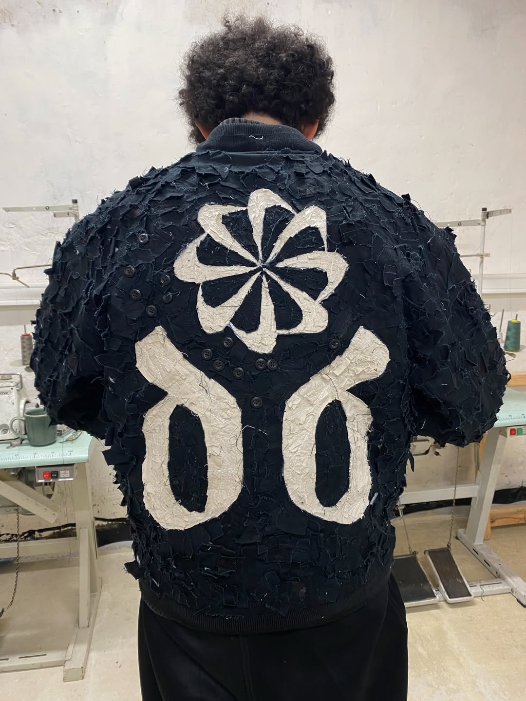 例如细碎的裁片能够转变成为一件夹克的「纹理」,错综繁杂的缝线赋予了独特的轮廓结构,甚至大量纽扣地拼接也能塑造成为标志性的符号元素。