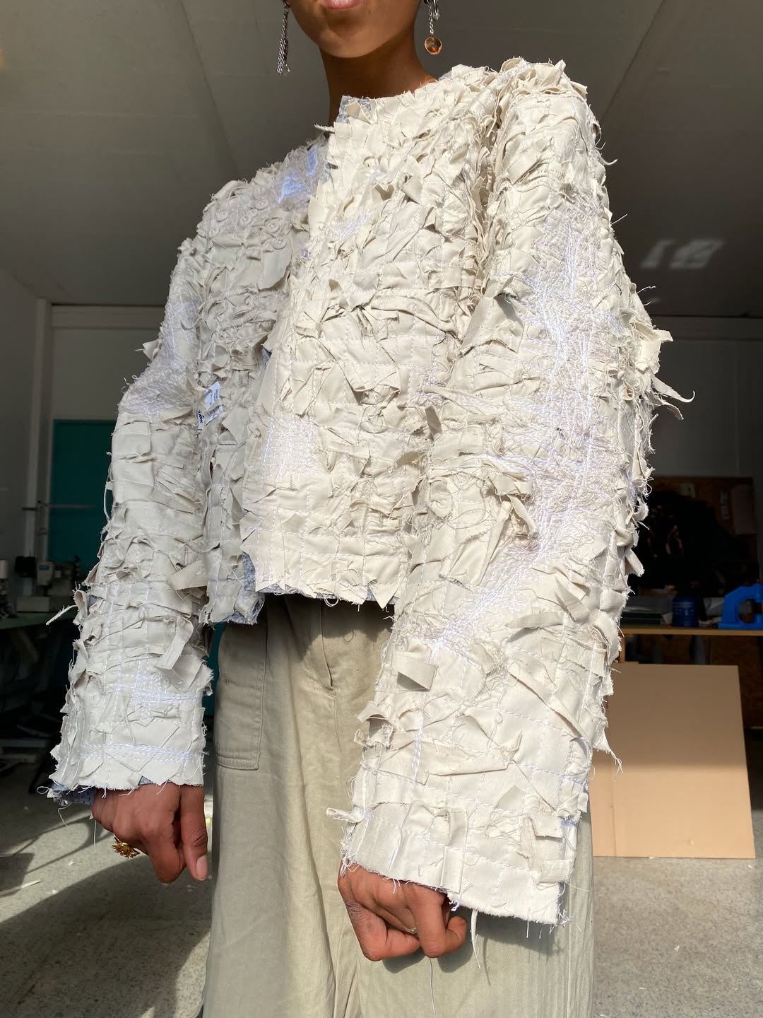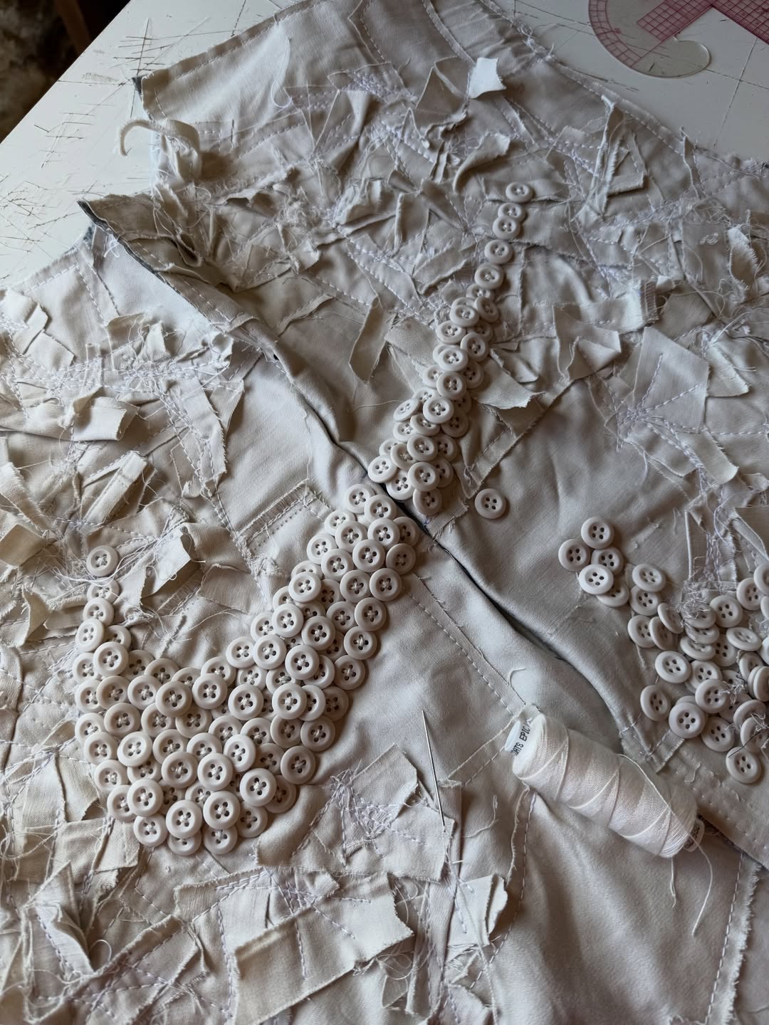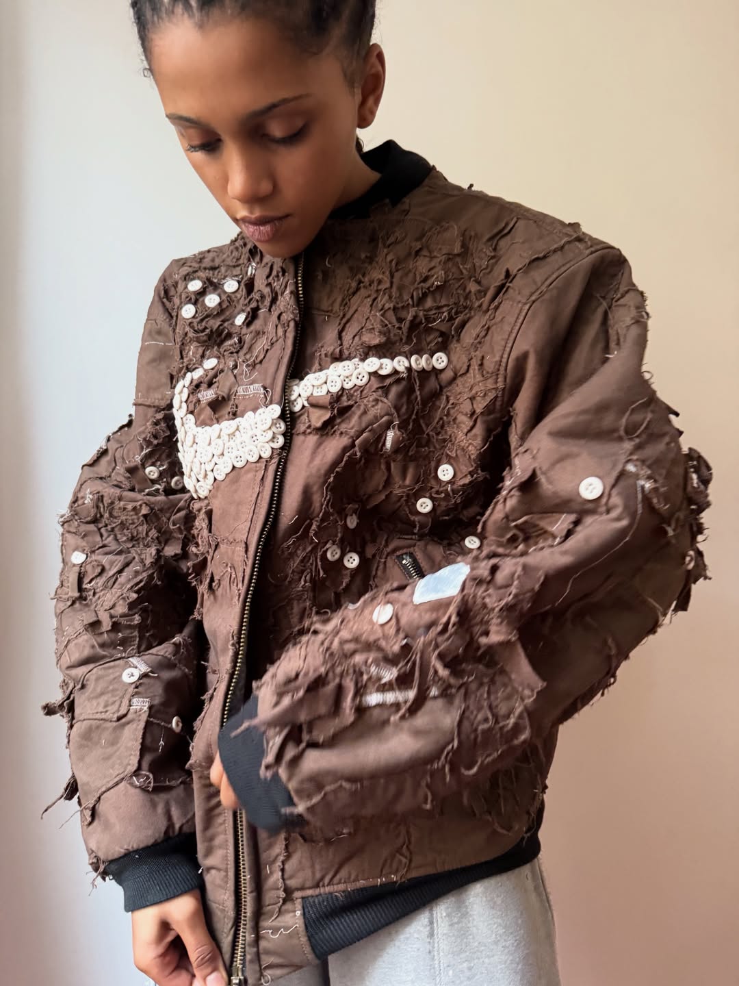 例如细碎的裁片能够转变成为一件夹克的「纹理」,错综繁杂的缝线赋予了独特的轮廓结构,甚至大量纽扣地拼接也能塑造成为标志性的符号元素。