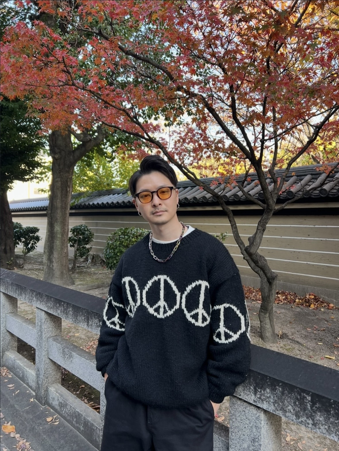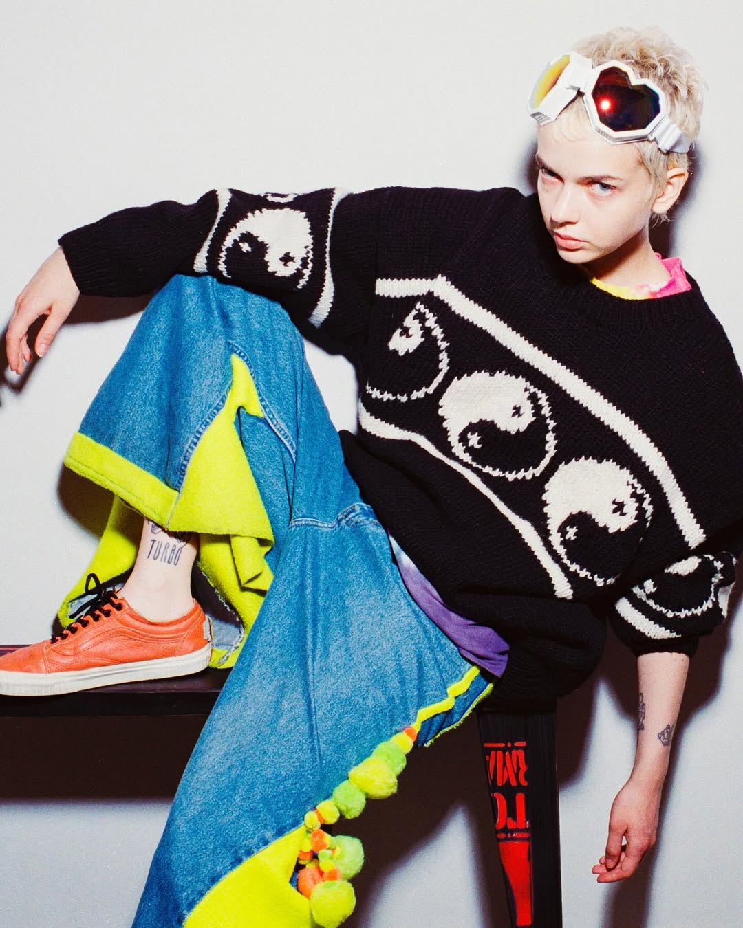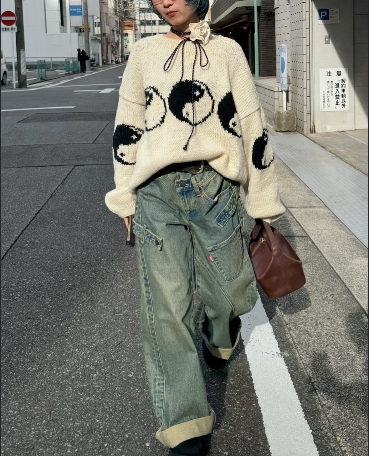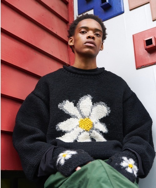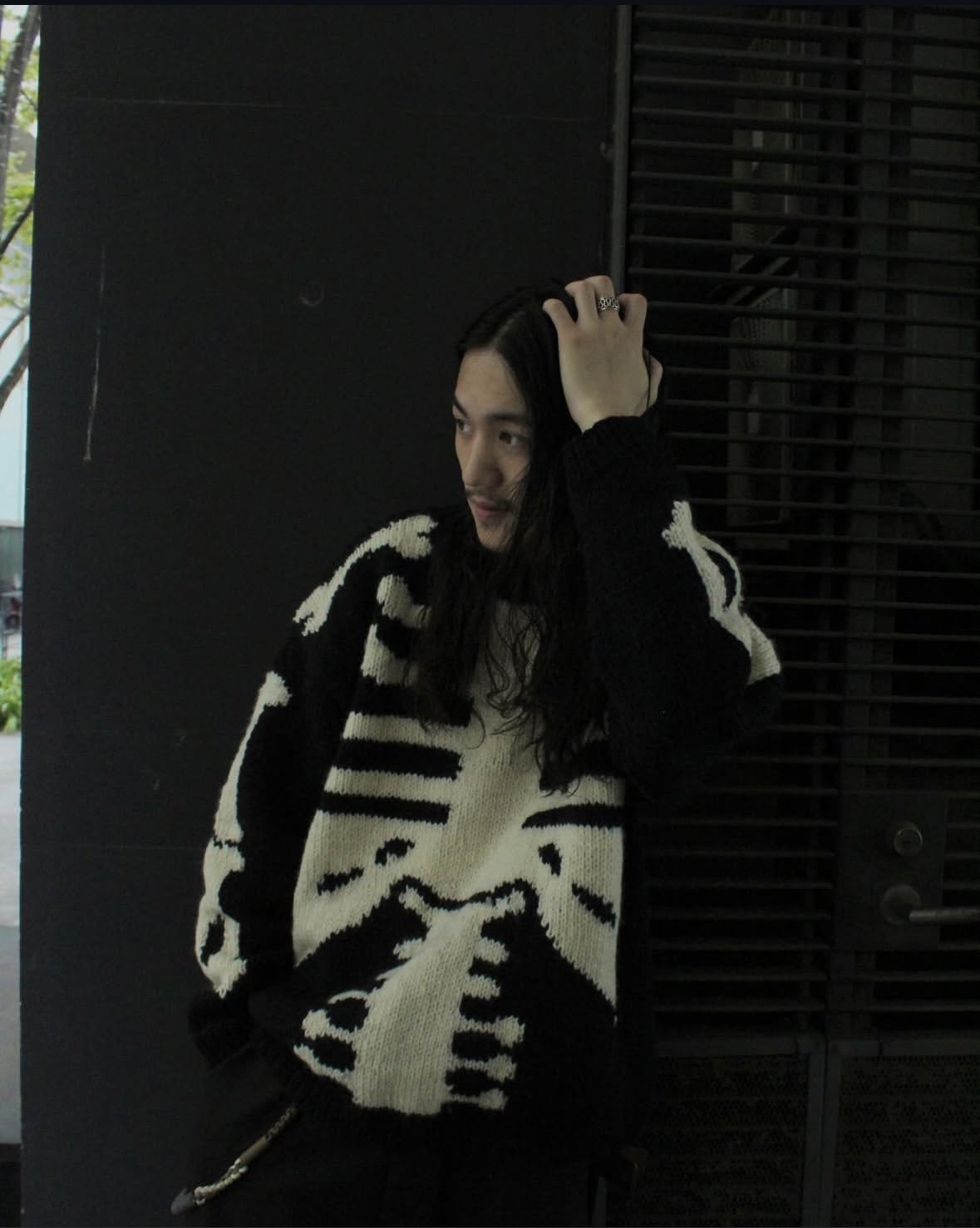 除了如同 vintage 一般的旧物质感和手作痕迹外,MacMahon Knitting Mills 毛衣最显著的特征便是粗针纹理和那些标志性的图案符号——阴阳、骨骼、反战,以及不同的花卉,成为一种 Neo-Folk 式的时尚密码,也塑造了品牌最受欢迎的爆款单品。