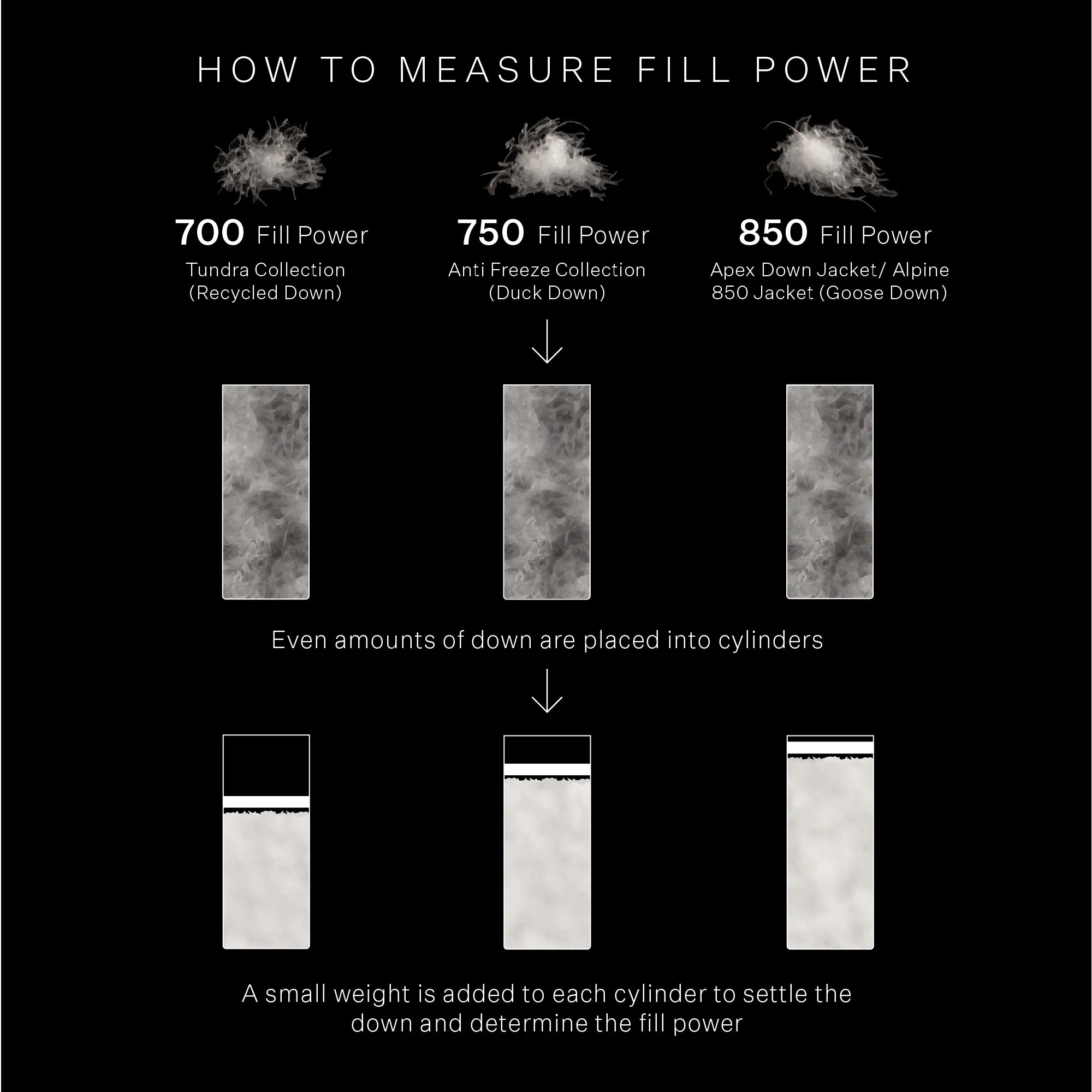 如果「充绒量」代表着的是羽绒的「量」,那么「蓬松度」则可以简单理解为羽绒的「质」,因为羽绒原料决定了蓬松度,数值越高,羽绒越蓬松、隔温的能力越强,同样重量下也会更保暖。