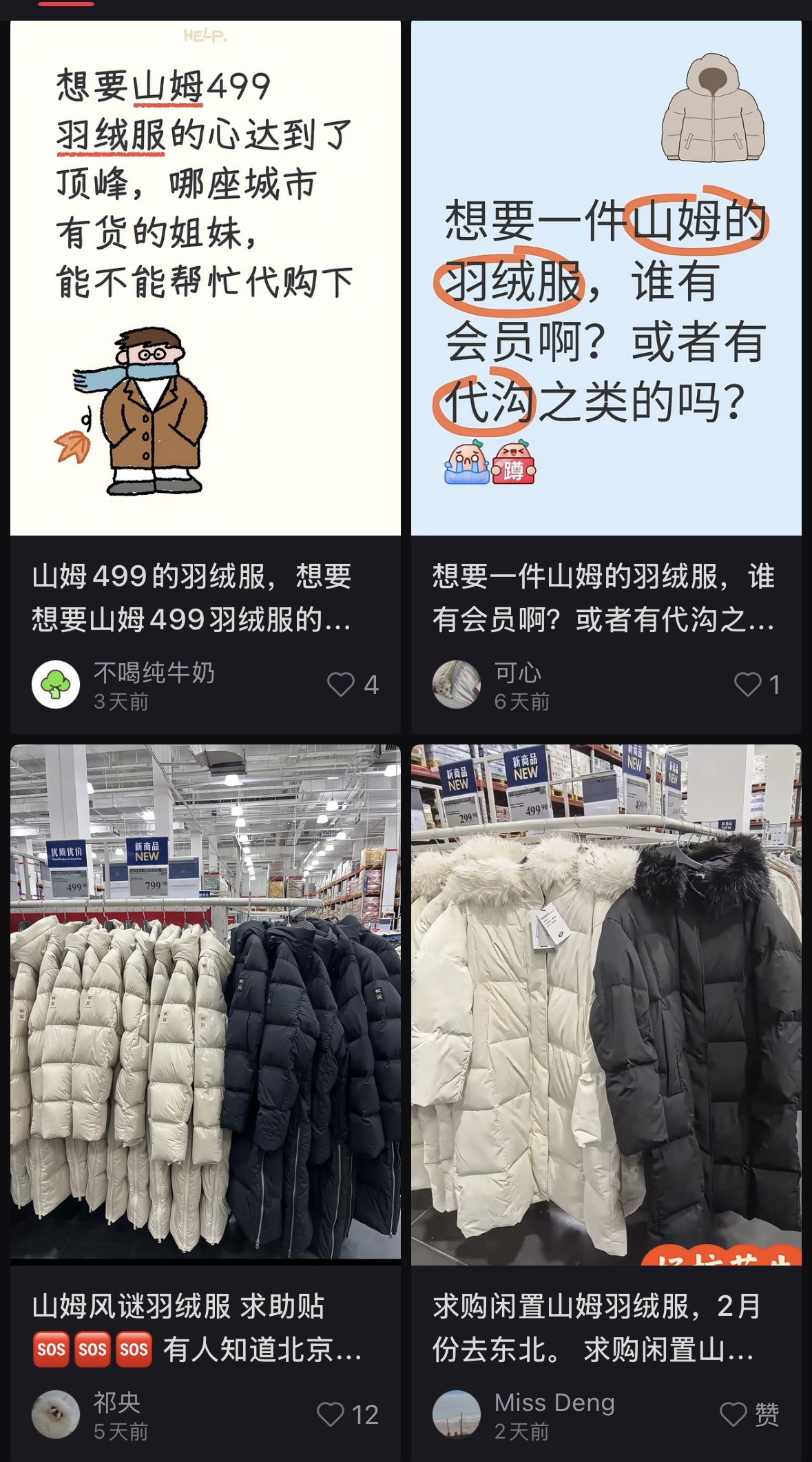 于是在经过社交媒体上的发酵后,这款羽绒服几乎每次上架都会被抢购一空,甚至在广东等相对温暖的南方地区也同样如此。小红书上关于「山姆羽绒服补货」的帖子比比皆是,一些当地没有山姆会员超市的地区也在寻求代购加价购买,足以展现出消费者层面真实而集中的需求。