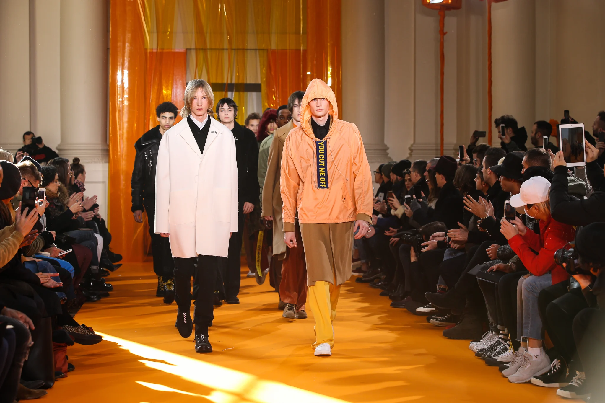 2016 年,OFF-WHITE™ 举办了品牌首场男装秀,街头风格与时装元素巧妙融合。亮点包括受 Raf Simons 启发的 Nebraska 针织衫、人字纹工装连体服,以及带有布料拼接的长款帆布外套。细节亦注入标志性双引号注释:透明纽扣上的 “BUTTON”,拉链拉片写着 “RING”。
