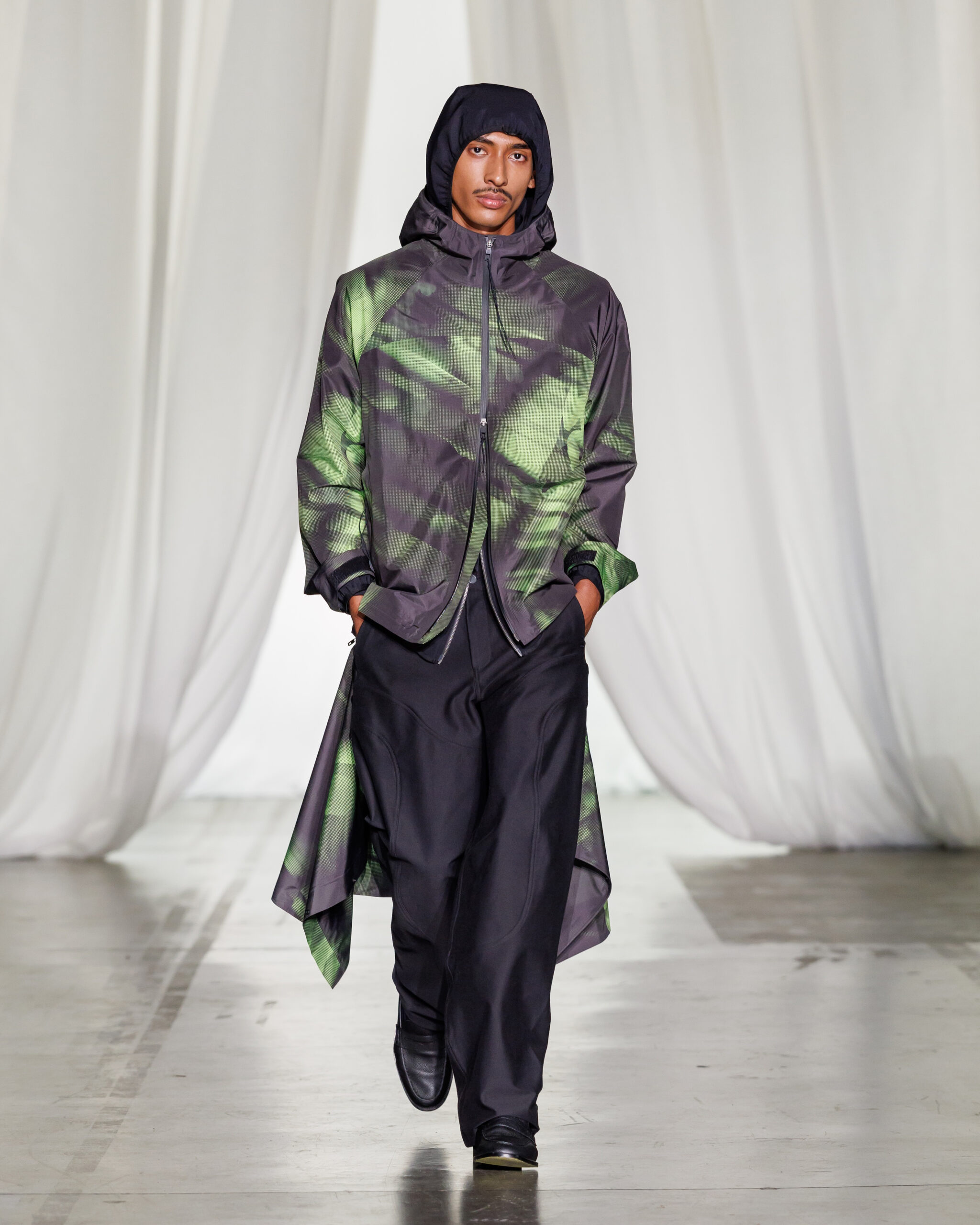 现场模特们根据艺术指导 Vanessa Beecroft 的构想进行站立编排,整体呈现出如同装置艺术般的视觉感受,模特不再承担传统走秀的功能,而是成为背景、成为结构的一部分。