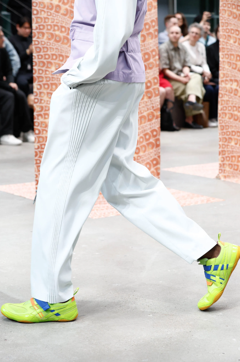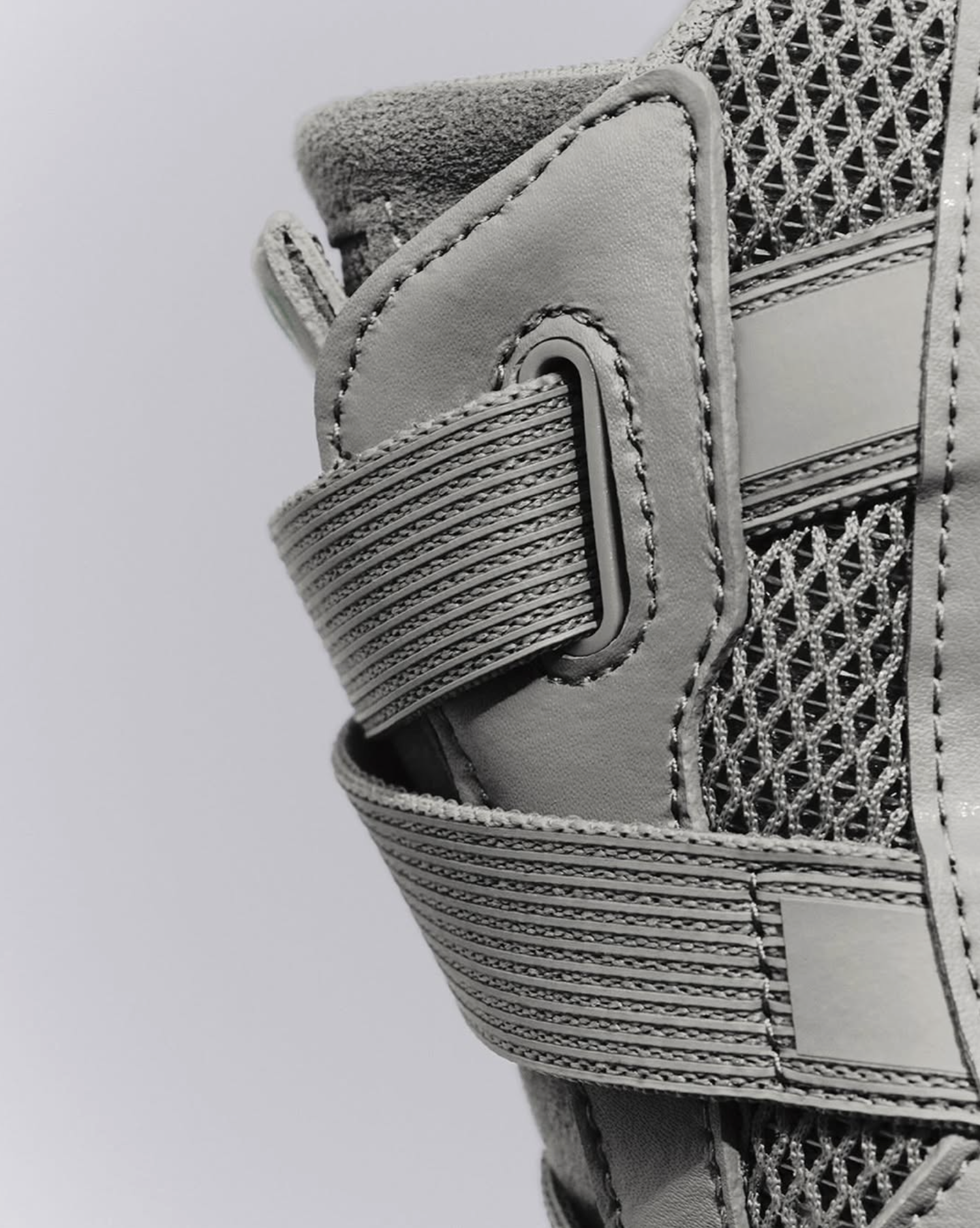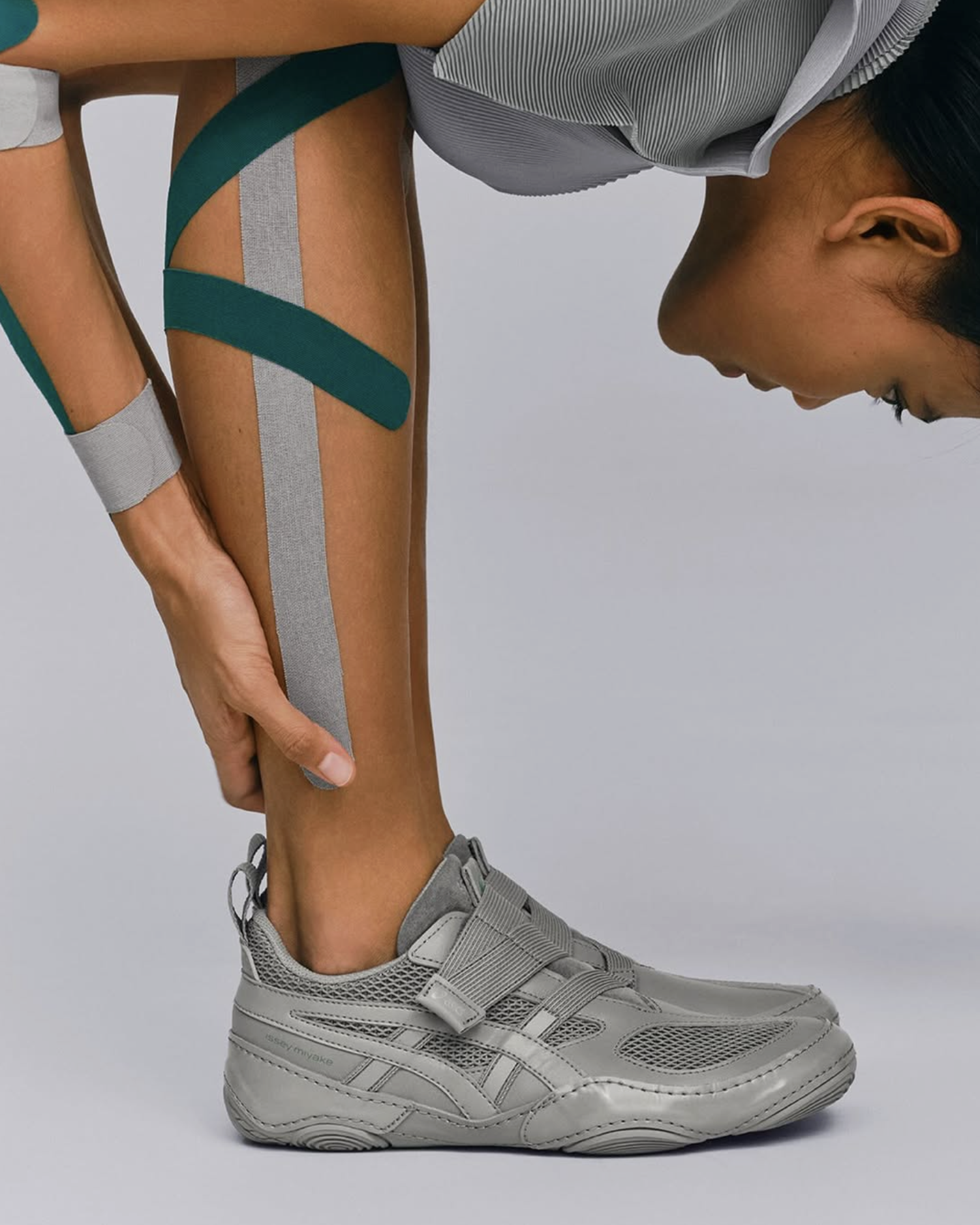 HYPER TAPING 这款首次在巴黎亮相的 2026 春夏新作,通过深度汲取并理解 ASICS 早期研究中兼具结构强度与贴合度的功能属性特征、以及摔跤运动员用以支撑关节、防止受伤而佩戴的肌内效贴布,延伸开发出通过足部固定支撑躯体的「Taping」概念——这也直观体现在鞋面醒目的绑带模块中。