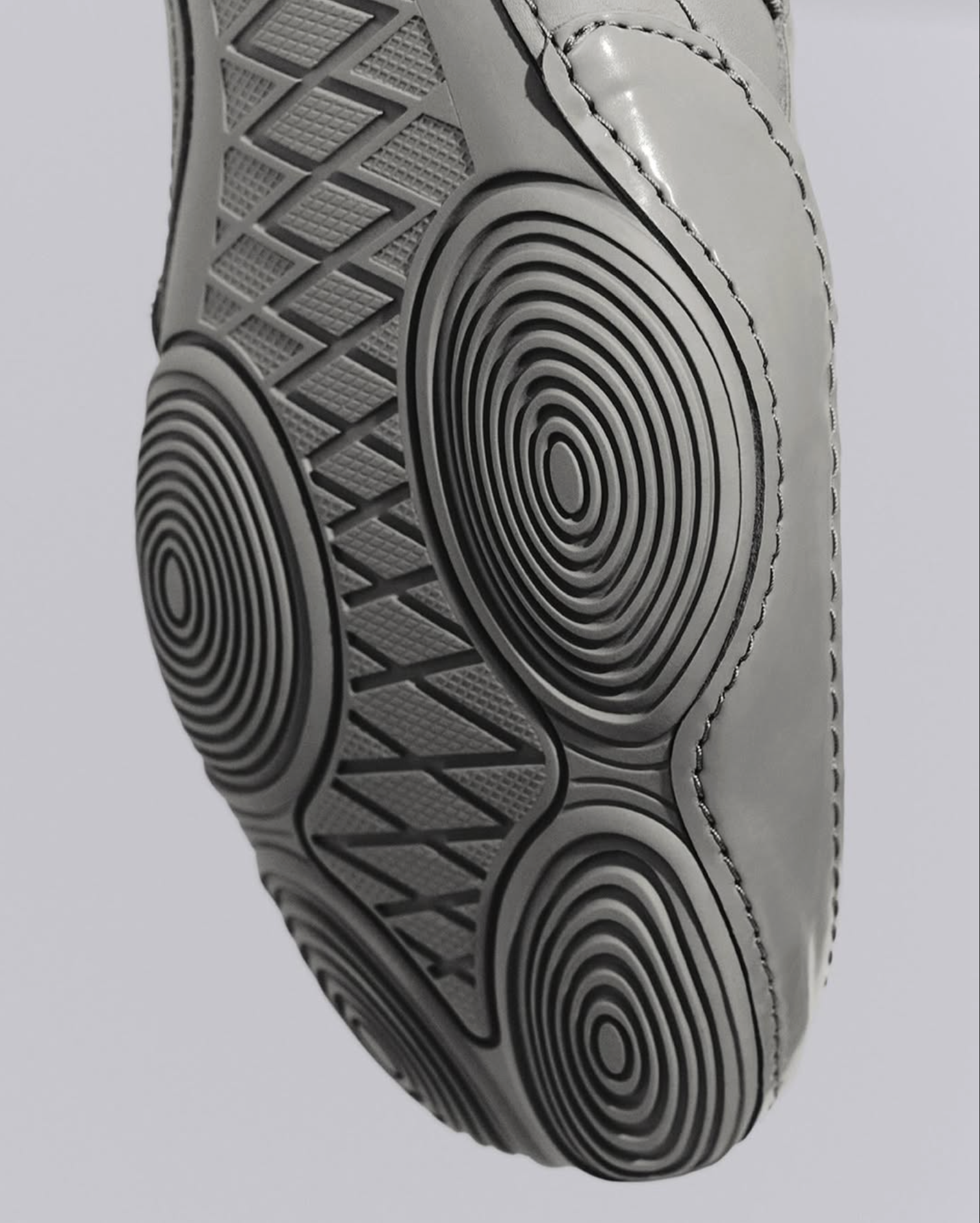 而为了将摔跤鞋结构重新构想成适合日常穿着的形态,ISSEY MIYAKE 在保留摔跤鞋多几何纹路防滑超薄鞋底的同时,在鞋面上选择选用更宽粗的橡胶绑带进行脚部包覆,同时辅以可调节接触感鞋舌。此外,加宽的鞋楦、以及 SPEVA 中底与 Ortholite® 鞋垫,也为 HYPER TAPING 带来了区别于其他传统薄底鞋的稳定舒适体验。