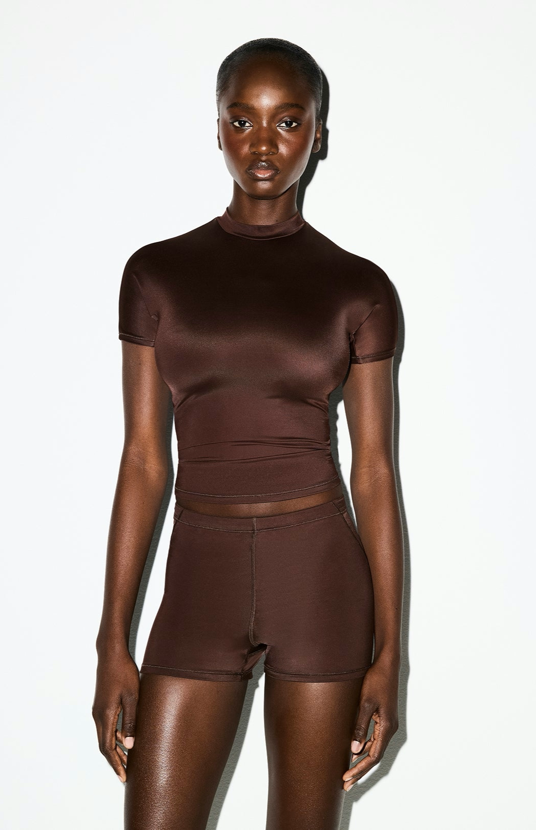 承袭 SKIMS 风格,NikeSKIMS 的设计更贴身,强调包裹感与曲线轮廓,单品本身就具有强烈的视觉存在感,对身体线条的「描绘」更直接、更大胆,也因为 SKIMS 擅长通过剪裁与结构去完成收腹、修饰腰臀比例、优化整体身体线条等功能。